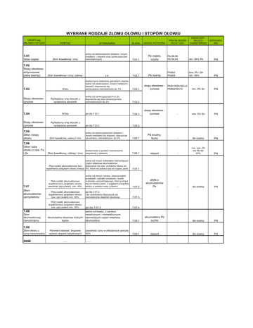 WYBRANE RODZAJE ZŁOMU OŁOWIU I STOPÓW OŁOWIU GRUPA wg. PN-76/H-15715/07 UWAGI DOT. SKŁADU CHEMICZNEGO ODPOWIEDNIKI POSTAĆ WYMAGANIA KLASA NAZWA POTOCZNA Złom kawałkowy i inny wolny od zanieczyszceń Ŝelazem, innymi metalami i stopami oraz zanieczyszczeń niemetalicznych 7.01.1 Pb miękki, czysty Pb 99,99 Pb 99,93 min. 98% Pb PN Pb twardy PbSb2 PbSb9 zaw. Pb i Sb min. 98% PN 7.01 Ołów miękki PRZYKŁADOWE CECHY GAT. 7.02 Stopy ołowiowoantymonowe (ołów twardy) 7.03 Stopy ołowiowocynowe 7.04 Stopy ołowiowocynowe Złom kawałkowy i inny; odlewy j.w. 7.02.1 Wióry dostarczane oddzielnie gatunkami stopów; wolne od zanieczyszcz. innymi metalami i stopami; dopuszcza się zanieczyszcz.niemetaliczne do 1%. 7.03.1 wolne od zanieczyszczeń Fe i Zn, dopuszcza się zaw.zanieczyszczeń niemetalicznych do 2% 7.03.2 Wióry jak dla 7.03.1 7.04.1 Wykładziny oraz bloczki z wytapiania panewek jak dla 7.03.2 7.04.2 wolny od zanieczywszczeń Ŝelazem i innymi metalami orz stopami; dopuszcza się zaniecz. niemetaliczne do 5% dostarczane w postaci mechaniczne zespolonej z Ŝelazem. Wykładziny oraz bloczki z wytapiania panewek 7.05 Ołów i stopy ołowiu Złom kawałkowy, odlewy i inne stopy ołowiowo - PbSn16Sb16Cu2 PbSb24Sn12 cynowe min. 9% Sn PN stopy ołowiowo cynowe - min. 5% Sn PN 7.05.1 Pb brudny, tłusty - do oceny PN 7.06.1 niesort - min. zaw. Pb lub Pb+Sb 40% PN płytki z akumulatorów Pb - do oceny PN 7.06 Ołow i stoy ołowiu z zaw. Fe i Zn Złom kawałkowy, odlewy i inne wolne od innych materiałów stanowiących części składowe akumulatorów; Płyty (siatki) akumulatorowe bez dopuszcza się zaw. zwiazków ołowiu do wypełnienia związkami ołowiu (masa) 5%, które nie potraca się od cięŜaru partii. 7.07.1 7.07 Płyty (siatki) akumulatorowe wypełnieniane związkami ołowiu; zawartość płyt (siatek) min. 40%. wolne od skrzyń i kwasu; dopuszczalne przekładki, nakrętki metalowe, resztki materiału uszczelniającego, które potrąca się od cieŜaru partii, z wyjątkiem związków ołowiu w postaci masy i szlamu. 7.07.2 Złom akumulatorów uprzydatniny Płyty (siatki) akumulatorowe wypełnieniane związkami ołowiu; zaw. płyt (siatek) min. 30%. jak dla 7.07.2 ( po uzdodnieniu dopuszcza się niemetaliczne składniki obudowy). 7.07.3 Płyty (siatki) akumulatorowe wypełnieniane związkami ołowiu; zaw. płyt (siatek) min. 30%. 7.08 Złom akumulatorowy nierozbrojony Akumulatory ołowiowe róŜnych typów jak dla 7.07.3 7.07.4 wolne od kwasu, z zaniecz. metalicznymi i niemetalicznymi stanowiącymi części składowe akumulatora 7.08.1 akumulatory Pb suche - do oceny PN zawartość cyny w ykładzinach poniŜej 50% 7.09.1 niesort - do oceny PN 7.09 Złom ołowiu z cyną niesortowany INNE Panewki stalowe i brązowe wylane stopami łoŜyskowymi …… ……