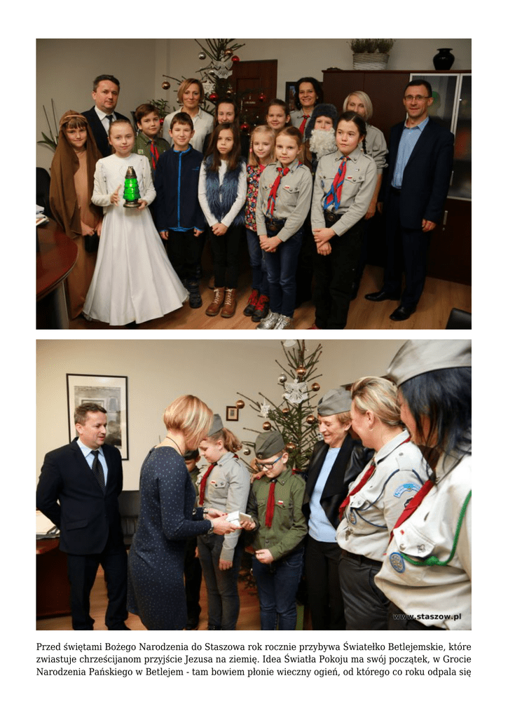 Przed świętami Bożego Narodzenia do Staszowa rok rocznie przybywa Światełko Betlejemskie, które zwiastuje chrześcijanom przyjście Jezusa na ziemię. Idea Światła Pokoju ma swój początek, w Grocie Narodzenia Pańskiego w Betlejem - tam bowiem płonie wieczny ogień, od którego co roku odpala się jedną świeczkę. Płomień ten jest niesiony przez skautów w wielkiej sztafecie przez kraje i kontynenty. W ten sposób ogień z Betlejem obiega świat. Do Polski płomień trafił już po raz 25. Do Staszowa przywieźli go staszowscy harcerze, którzy odebrali go z rąk słowackich skautów. W przeddzień świąt Bożego Narodzenia zuchy i harcerze ze Szkół Podstawowych nr 3 i nr 1 ze Staszowa uroczyście przekazali Betlejemskie Światło Pokoju Leszkowi Kopciowi Burmistrzowi Miasta i Gminny Staszów i Ewie Kondek zastępcy Burmistrza, a także złożyli samorządowcom i wszystkim pracownikom urzędu życzenia świąteczne. MJ