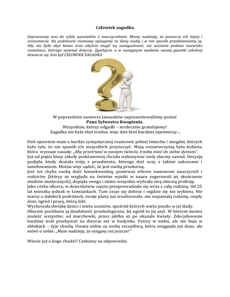 Człowiek zagadka Zapraszamy was do cyklu wywiadów z nauczycielami. Mamy nadzieję, że poznacie ich lepiej i zrozumiecie. Na podstawie rozmowy opisujemy tu daną osobę i w ten sposób przedstawiamy ją. Aby nie było zbyt łatwo oraz abyście mogli się zaangażować, nie zostanie podane nazwisko rozmówcy, którego wywiad dotyczy. Zgadujcie, a w następnym wydaniu naszej gazetki szkolnej dowiecie się, kim był CZŁOWIEK ZAGADKA W poprzednim numerze Januszków zaprezentowaliśmy postać Pana Sylwestra Kwapienia. Wszystkim, którzy odgadli – serdecznie gratulujemy! Zagadka nie była zbyt trudna, więc dziś ktoś bardziej tajemniczy… Dziś opowiem wam o bardzo sympatycznej rozmowie pełnej śmiechu i anegdot, których było tyle, że nie sposób ich wszystkich przytoczyć. Moją rozmówczynią była kobieta, która wyznaje zasadę: „Aby przetrwać w naszym świecie, trzeba mieć do siebie dystans”. Już od piątej klasy szkoły podstawowej chciała wykonywać swój obecny zawód. Decyzję podjęła, kiedy dostała tróję z przedmiotu, którego dziś uczy z takimi sukcesami i zamiłowaniem. Można więc sądzić, że jest osobą przekorną. Jest też chyba osobą dość konsekwentną, ponieważ wbrew namowom nauczycieli i rodziców (którzy ze względu na świetne wyniki w nauce sugerowali jej skończenie studiów medycznych), dopięła swego i mimo wszystko wybrała swą obecną profesję. Jako córka oficera, w dzieciństwie często przeprowadzała się wraz z całą rodziną. Od 25 lat mieszka jednak w Łomiankach. Tum czuje się dobrze i nigdzie się nie wybiera. Nie marzy o dalekich podróżach, swoje plany już zrealizowała: ma wspaniałą rodzinę, ciepły dom, ogród i pracę, którą lubi. Wychowała dwójkę dzieci i wielu uczniów, spośród których wielu poszło w jej ślady. Obecnie pochłania ją działalność proekologiczna. Jej ogród to jej azyl. W którym można znaleźć wszystko: od marchewki, przez jabłka aż po okazałe kwiaty. Zdecydowanie bardziej woli przebywać na dworze niż w budynku. Patrzy w niebo, ale nie buja w obłokach – żyje chwilą. Uważa siebie za osobę szczęśliwą, która osiągnęła już dużo, ale mówi o sobie: „Mam nadzieję, że osiągnę coś jeszcze!” Wiecie już o kogo chodzi? Czekamy na odpowiedzi.