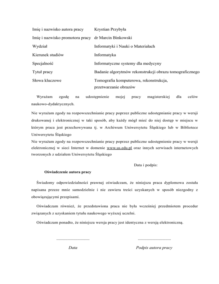 którym praca jest przechowywana tj. w Archiwum Uniwersytetu Śląskiego lub w Bibliotece