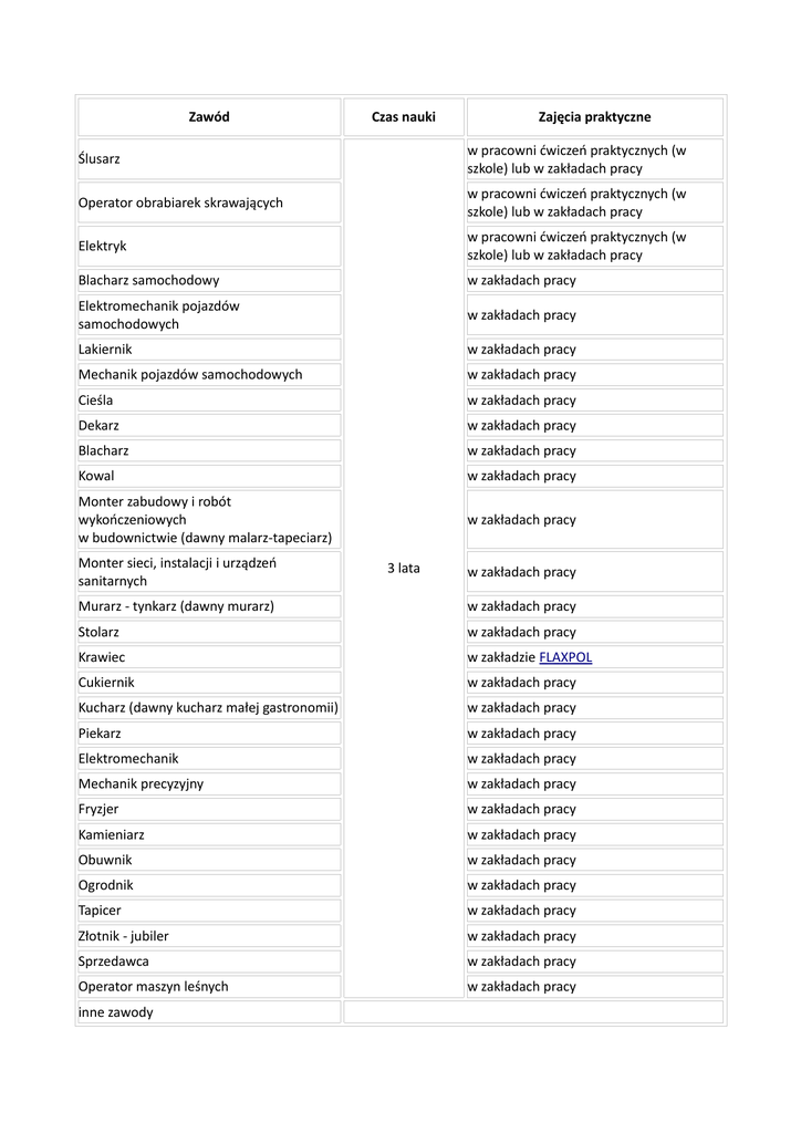 Zawód Czas nauki Zajęcia praktyczne Ślusarz w pracowni ćwiczeń praktycznych (w szkole) lub w zakładach pracy Operator obrabiarek skrawających w pracowni ćwiczeń praktycznych (w szkole) lub w zakładach pracy Elektryk w pracowni ćwiczeń praktycznych (w szkole) lub w zakładach pracy Blacharz samochodowy w zakładach pracy Elektromechanik pojazdów samochodowych w zakładach pracy Lakiernik w zakładach pracy Mechanik pojazdów samochodowych w zakładach pracy Cieśla w zakładach pracy Dekarz w zakładach pracy Blacharz w zakładach pracy Kowal w zakładach pracy Monter zabudowy i robót wykończeniowych w budownictwie (dawny malarz-tapeciarz) w zakładach pracy Monter sieci, instalacji i urządzeń sanitarnych 3 lata w zakładach pracy Murarz - tynkarz (dawny murarz) w zakładach pracy Stolarz w zakładach pracy Krawiec w zakładzie FLAXPOL Cukiernik w zakładach pracy Kucharz (dawny kucharz małej gastronomii) w zakładach pracy Piekarz w zakładach pracy Elektromechanik w zakładach pracy Mechanik precyzyjny w zakładach pracy Fryzjer w zakładach pracy Kamieniarz w zakładach pracy Obuwnik w zakładach pracy Ogrodnik w zakładach pracy Tapicer w zakładach pracy Złotnik - jubiler w zakładach pracy Sprzedawca w zakładach pracy Operator maszyn leśnych w zakładach pracy inne zawody