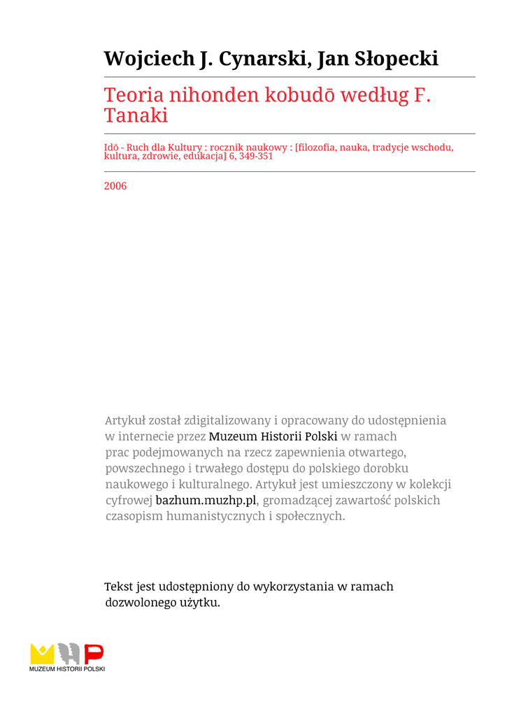 Wojciech J. Cynarski, Jan Słopecki Teoria nihonden kobudō według F. Tanaki Idō - Ruch dla Kultury : rocznik naukowy : [filozofia, nauka, tradycje wschodu, kultura, zdrowie, edukacja] 6, 349-351 2006 W o jc ie c h J. C y n a r s k i, J a n S ł o p e c k i Z a k ła d S p o r t ó w W a l k i i S p o r t ó w In d y w id u a ln y c h , W y d z i a ł W y c h o w a n i a F iz y c z n e g o , U n i w e r s y t e t R z e s z o w s k i, R z e s z ó w , P o ls k a Teoria nihonden kobudö według F. Tanaki / Theory of nihonden kobudö by F. Tanaka Fumon Tanaka, Sztuki walki samurajów. Teoria i praktyka, Diamond Books, Bydgoszcz 2005, ss. 232. Ukazała się nakładem bydgoskiego wyspecjalizowanego wydawnictwa książka będąca polską wersją językow ą wydanej dwa lata wcześniej pracy Samurai Fighting Arts; The Spirit and the Practice (Kodansha International Ltd. 2003). Tłumaczenia dokonał Witold Nowakowski, tłumacz i jednocześnie kendöka. Uwzględnienie znaków diakrytycznych określających długie samogłoski umożliwia jednoznaczne odczytanie japońskich słów, oczywiście na miarę możliwości, jakie w ynikająze specyfiki tego języka [por.: Cynarski 2000 a; Cynarski, Litwiniuk 2002-2003]. Książka kierowana jest do zachodniego czytelnika zainteresowanego tradycyjnymi sztukami walki i w szczególności obszarem zwanym ‘bugei jühappan' - osiemnastu sztukami walki upra wianymi przez samurajów. Mało znane jest na zachodzie kobudö klasycznych szkół i nauczanie użycia krótszego z pary mieczy samurajskich, obydwu mieczy jednocześnie lub innych jeszcze elementów militarnej kultury bushi [Cynarski 2004 a]. Napisana jest w sposób komunikatywny prostym językiem, wzbogacona licznymi fotografiami i rycinami. Jako taka pełni zwłaszcza funkcję popularyzacyjną. Fumon Tanaka (ur. 1943) uprawia sztuki wałki od 13 roku życia. Obecnie jest sôke (liderem, głównym mistrzem) dziesięciu tradycyjnych szkół, posiadaczem wysokich stopni w kobudö (8 dan, hanshi), jûjutsu (7 dan) i technikach miecza (7 dan, kyöshi w battójutsu i iaijutsu). Współ pracował z Ministerstwem Szkolnictwa i Agencją do Spraw Kulturalnych Japonii. Był dyrektorem Dai Nihon Butokukai. Jest autorem dwóch ważnych książek poświęconych tradycji japońskiej szermierki [Tanaka 1995; 2000]. Obecnie pełni funkcje prezesa Nihonkoden Füshimusökai i stałego doradcy Zen Nihon Budó Sögörenmei. Prowadzi liczne wykłady i seminaria szkoleniowe w Europie. Zasadnicza treść pracy dzieli się na sześć rozdziałów: I - Kobudö i miecz japoński; II - Tra dycje samurajów, III — Walka dwoma mieczami; IV - Techniki szkoły Honmon Enshin; V - Za stosowanie kenjutsu; VI - Techniki mutö-dori. Całość rozpoczyna Wstęp, w którym autor wpro wadza w historyczną perspektywę samurajskich sztuk walki [Tanaka 2005, s. 11-14]. Historyczne analizy kontynuowane są w rozdziale Dzieje kobudö, w którym autor książki zdaje się utożsamiać japońskie kobudö1 z szermierką i wywodzić je z opisanych na kartach Kojiki (Księga dawnych wydarzeń, 712) i Nihonshoki (Kroniki japońskie, 720) praform sztuki miecza. Historia miesza się tutaj z legendami i mitologią religii shintö. Cenna jest prezentacja średnio wiecznych rycin, wprowadzających w klimat epoki. Przedstawione są sceny walki, broń, stroje, wyobrażenia kultowe. Rozważania kończą się na epoce Edo. Okres po restauracji Meiji (po 1868 r.) uwzględniony jest w rozdziale Tradycyjne i współczesne budö (s. 22—25). Tanaka przed stawia system przekazu wiedzy: söke - shihan — uczniowie. Odróżnia sztuki walki starych szkół od siedmiu nowoczesnych form, tzw. gendai budö, do których zaliczają się: jüdö, kendö, naginatadö, karatedö. aikido, shorinji kenpö i jükendö. Jako wybitnych przedstawicieli nowoczesnego budö i karatedö w szczególności wymienia zdjęcia światowego lidera stylu shötökan — mistrza Hirokazu Kanazawa (10 dan karatedö, IMAF) i stylistę shitö-ryü - Toshihisa Sofue (jednocze śnie ekspert karate i kaiden shihan tradycyjnej szkoły takeda-ryu) (s. 22). Tanaka legtymizuje swe kompetencje publikując zdjęcia makimono (zwojów manuskryptów) szkół, których jest spadkobiercą (s. 25). Rozdzialik poświęcony jüjutsu (Jûjutsu, s. 26-29) zawiera jedynie zdaw kową informację o tej sztuce walki ze skierowaniem zainteresowanego czytelnika do książki 1 Nigdzie jednak nie pada nazwa nihonden kobudö (lub honshu kobudö), która odróżnia szkoły stricte japońskie od lepiej znanych stylów z Okinawy i wysp Riukiu [Cynarski 2000 b). ucznia Tanaki - Serge’a Mola [Mol 2003; Cynarski 2005]. Na rycinie znajdujemy wyobrażenie Takedy Butsugena, założyciela szkoły fusen-ryü jüjutsu2 (s. 27) oraz zdjęcia, ukazujące techniki niezwykle podobne do nauczanych w daitö-ryü i w takeda-ryu (s. 26-29). Historii kenjutsu i japońskiemu mieczowi poświęconych zostało więcej stron i materiału zdjęciowego (s. 30-42). Rozdział II zawiera opis samurajskiego ubioru i heraldyki oraz wyjaśnia ważne pojęcia (seppuku, kaishaku, tameshigiri, suemonogiri — s. 48-49). Interesujący jest opis kumiuchi kenpö - technik średniowiecznego pola walki, łączących elementy szermierki, aikijutsu i jüjutsu (s. 52 57). W kolejnych częściach czytelnik znajduje opis i ilustracje technik walki krótkim mieczem, dwoma mieczami i iaijutsu, w tym opisy klasycznych form technicznych (s. 58-191). Także od niesienia do sfery technik innych broni w ystępują z perspektywy sztuki miecza (rozdział; Zasto sowanie kenjutsu). Nota bene je st to rzeczywiście specyfiką szkół honshu kobudö (jak kashima shintö-ryü lub tenshin shóden katori shintö-ryü [por.: Otake 1977; Draeger 1997; Friday, Humitake 1997; Cynarski 2004 b]), że nauczają walki mieczem przeciwko innym broniom. W pracy Tanaki znajdujemy więc włócznię yari, naginatę, długi kij bö, shuriken (bronie przeznaczone do miotania). Znajdujemy też opis