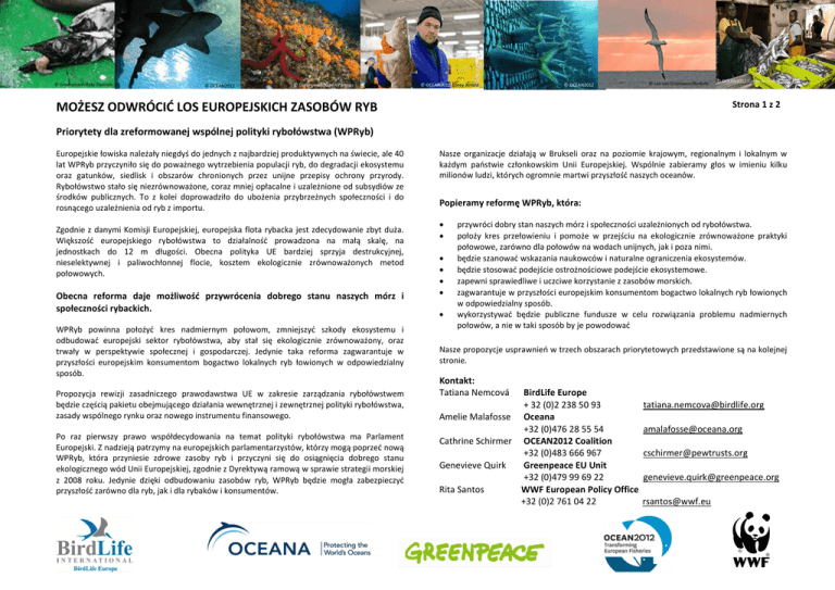 © Greenpeace/Kate Davison © OCEAN2012 © Greenpeace/Gavin Parsons © OCEAN2012/Corey Arnold © OCEAN2012 © Lex van Groningen/BirdLife MOŻESZ ODWRÓCIĆ LOS EUROPEJSKICH ZASOBÓW RYB © OCEAN2012/Corey Arnold Strona 1 z 2 Priorytety dla zreformowanej wspólnej polityki rybołówstwa (WPRyb) Europejskie łowiska należały niegdyś do jednych z najbardziej produktywnych na świecie, ale 40 lat WPRyb przyczyniło się do poważnego wytrzebienia populacji ryb, do degradacji ekosystemu oraz gatunków, siedlisk i obszarów chronionych przez unijne przepisy ochrony przyrody. Rybołówstwo stało się niezrównoważone, coraz mniej opłacalne i uzależnione od subsydiów ze środków publicznych. To z kolei doprowadziło do ubożenia przybrzeżnych społeczności i do rosnącego uzależnienia od ryb z importu. Zgodnie z danymi Komisji Europejskiej, europejska flota rybacka jest zdecydowanie zbyt duża. Większość europejskiego rybołówstwa to działalność prowadzona na małą skalę, na jednostkach do 12 m długości. Obecna polityka UE bardziej sprzyja destrukcyjnej, nieselektywnej i paliwochłonnej flocie, kosztem ekologicznie zrównoważonych metod połowowych. Obecna reforma daje możliwość przywrócenia dobrego stanu naszych mórz i społeczności rybackich. WPRyb powinna położyć kres nadmiernym połowom, zmniejszyć szkody ekosystemu i odbudować europejski sektor rybołówstwa, aby stał się ekologicznie zrównoważony, oraz trwały w perspektywie społecznej i gospodarczej. Jedynie taka reforma zagwarantuje w przyszłości europejskim konsumentom bogactwo lokalnych ryb łowionych w odpowiedzialny sposób. Propozycja rewizji zasadniczego prawodawstwa UE w zakresie zarządzania rybołówstwem będzie częścią pakietu obejmującego działania wewnętrznej i zewnętrznej polityki rybołówstwa, zasady wspólnego rynku oraz nowego instrumentu finansowego. Po raz pierwszy prawo współdecydowania na temat polityki rybołówstwa ma Parlament Europejski. Z nadzieją patrzymy na europejskich parlamentarzystów, którzy mogą poprzeć nową WPRyb, która przyniesie zdrowe zasoby ryb i przyczyni się do osiągnięcia dobrego stanu ekologicznego wód Unii Europejskiej, zgodnie z Dyrektywą ramową w sprawie strategii morskiej z 2008 roku. Jedynie dzięki odbudowaniu zasobów ryb, WPRyb będzie mogła zabezpieczyć przyszłość zarówno dla ryb, jak i dla rybaków i konsumentów. Nasze organizacje działają w Brukseli oraz na poziomie krajowym, regionalnym i lokalnym w każdym państwie członkowskim Unii Europejskiej. Wspólnie zabieramy głos w imieniu kilku milionów ludzi, których ogromnie martwi przyszłość naszych oceanów. Popieramy reformę WPRyb, która: • • • • • • • przywróci dobry stan naszych mórz i społeczności uzależnionych od rybołówstwa. położy kres przełowieniu i pomoże w przejściu na ekologicznie zrównoważone praktyki połowowe, zarówno dla połowów na wodach unijnych, jak i poza nimi. będzie szanować wskazania naukowców i naturalne ograniczenia ekosystemów. będzie stosować podejście ostrożnościowe podejście ekosystemowe. zapewni sprawiedliwe i uczciwe korzystanie z zasobów morskich. zagwarantuje w przyszłości europejskim konsumentom bogactwo lokalnych ryb łowionych w odpowiedzialny sposób. wykorzystywać będzie publiczne fundusze w celu rozwiązania problemu nadmiernych połowów, a nie w taki sposób by je powodować Nasze propozycje usprawnień w trzech obszarach priorytetowych przedstawione są na kolejnej stronie. Kontakt: Tatiana Nemcová BirdLife Europe + 32 (0)2 238 50 93 Amelie Malafosse Oceana +32 (0)476 28 55 54 Cathrine Schirmer OCEAN2012 Coalition +32 (0)483 666 967 Genevieve Quirk Greenpeace EU Unit +32 (0)479 99 69 22 Rita Santos WWF European Policy Office +32 (0)2 761 04 22 [email protected] [email protected] [email protected] [email protected] [email protected] © Greenpeace/Kate Davison © OCEAN2012 © Greenpeace/Gavin Parsons © OCEAN2012/Corey Arnold © OCEAN2012 Wytyczenie nowej polityki rybołówstwa UE na bazie trzech priorytetów 1) Wyznaczenie prawidłowych celów: nie ma rybołówstwa bez zdrowych mórz Zdrowe morza i produktywne zasoby rybne są warunkiem wstępnym dobrej kondycji sektora rybołówstwa. Zwodnicza kultura podejmowania krótkoterminowych decyzji, mających na celu jedynie tłumienie gospodarczych i społecznych skutków obniżonych możliwości połowowych poważnie naraziła długoterminową trwałość zasobów rybnych, zagrażając zdolności przeżycia całego sektora. Wzywamy parlamentarzystów europejskich do: • • Utrzymania celu odnowienia stad ryb powyżej poziomu mogącego wygenerować maksymalny zrównoważony odłów (tzw. MSY), jako założenia dla zrównoważonego i sprawiedliwego dostępu do możliwości połowowych. Zapewnienia, aby nowa WPRyb tak uregulowała kwestie rybołówstwa, by oddziaływanie na środowisko mieściło się w granicach zgodnych z osiąganiem dobrego stanu środowiska, jak zostało to określone w Dyrektywie Ramowej w Sprawie Strategii Morskiej, oraz by zapewnić korzystny status ochrony gatunków, siedlisk i obszarów Natura 2000, zgodnie z dyrektywą ptasią i siedliskową. 2) Zapewnienie perspektywicznego zarządzania rybołówstwem i wdrożenie podejścia ekosystemowego, zgodnego z nauką Reforma z 2000 r. zobowiązała Unię Europejską do zarządzania rybołówstwem na bazie podejścia ekosystemowego, jednak wdrażanie tej zasady były bardzo powolne i niespójne.. Nowa WPRyb musi sprawić, aby zarządzanie eksystemowe rybołówstwem stało się w pełni operacyjne we wszystkich regionach w określonym horyzoncie czasu. Jak stanowi to prawo USA, limity połowowe nie mogą być wyznaczane powyżej limitów zalecanych przez naukowców. • • • Wyznaczenia horyzontu czasowego dla opracowania i przyjęcia wieloletnich planów bazujących na podejściu ekosystemowym i spójnych w wymogami Dyrektywy Ramowej w Sprawie Strategii M