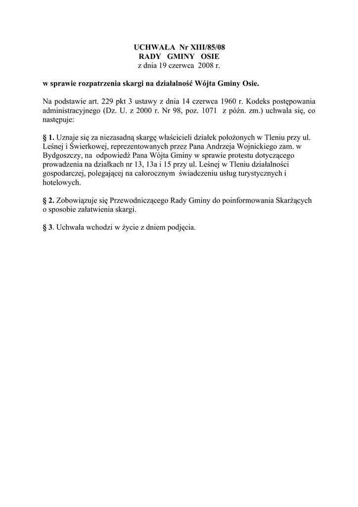 UCHWAŁA Nr XIII/85/08 RADY GMINY OSIE z dnia 19 czerwca 2008 r. w sprawie rozpatrzenia skargi na działalność Wójta Gminy Osie. Na podstawie art. 229 pkt 3 ustawy z dnia 14 czerwca 1960 r. Kodeks postępowania administracyjnego (Dz. U. z 2000 r. Nr 98, poz. 1071 z późn. zm.) uchwala się, co następuje: § 1. Uznaje się za niezasadną skargę właścicieli działek położonych w Tleniu przy ul. Leśnej i Świerkowej, reprezentowanych przez Pana Andrzeja Wojnickiego zam. w Bydgoszczy, na odpowiedź Pana Wójta Gminy w sprawie protestu dotyczącego prowadzenia na działkach nr 13, 13a i 15 przy ul. Leśnej w Tleniu działalności gospodarczej, polegającej na całorocznym świadczeniu usług turystycznych i hotelowych. § 2. Zobowiązuje się Przewodniczącego Rady Gminy do poinformowania Skarżących o sposobie załatwienia skargi. § 3. Uchwała wchodzi w życie z dniem podjęcia. Uzasadnienie Rada Gminy, po zapoznaniu się z opiniami Komisji Rewizyjnej oraz Komisji Kultury, Sportu i Porządku Publicznego dotyczącymi badania skargi na czynności Wójta Gminy Osie w sprawie protestu dotyczącego prowadzenia na działkach nr 13, 13a i 15 przy ul. Leśnej w Tleniu działalności gospodarczej, polegającej na całorocznym świadczeniu usług turystycznych i hotelowych. ustaliła, że Komisje badając skargę: 1/ analizowały zarzuty podnoszone w skardze; 2/analizowały dokumenty zgromadzone w sprawie; 3/ wysłuchały wyjaśnień Wójta w sprawie. W wyniku badania skargi Komisje ustaliły: Pismem z dnia 13 sierpnia 2007 r. właściciele działek przy ulicach Leśnej i Świerkowej w Tleniu zwrócili się do Pana Wójta o podjęcie działań, które doprowadziłyby do zaprzestania prowadzenia przez Panią Grażynę Linda działalności gospodarczej, polegającej na całorocznym świadczeniu usług turystycznych i hotelowych na działkach nr 13, 13a i 15 przy ul. Leśnej w Tleniu. W ramach postępowania wyjaśniającego, ustalono, że nie potwierdziły się zarzuty o naruszaniu prawa przez właściciela działek nr 13, 13a i 15 , położonych w Tleniu przy ulicy Leśnej. Uzyskano, od przedstawicieli służb ścigania, informacje, że nie zgłaszano, w ostatnim czasie żadnych skarg dot. hałasu, lub innego niewłaściwego korzystania z domków turystycznych, stanowiących własność Pani Grażyny Linda. Z oświadczeń Pani Lindy wynikało, że zarówno Ona jak i Jej Goście nie wchodzą na teren innych nieruchomości ogrodzonych płotem lub oznakowanych tablicami zakazu. Wskazano, że zasadnym byłoby niezwłoczne informowanie organów czuwających nad przestrzeganiem porządku prawnego, o naruszeniu prawa przez osoby zamieszkujące domki na działkach nr 13, 13a i 15 przy ulicy Leśnej w Tleniu. Wyjaśniono również, że o możliwości lokalizowania domków turystycznych na poszczególnych działkach decydują przepisy planu zagospodarowania przestrzennego lub w jego braku przepisy ustawy z dnia 27 marca 2003 r. o planowaniu i zagospodarowaniu przestrzennym ( Dz. U. Nr 80, poz. 717 z późn. zm.) oraz wydane na jej podstawie decyzje o warunkach zabudowy. O ile inwestycja jest zgodna z planem lub decyzją o warunkach zabudowy, brak jest podstaw do odmowy wydania pozwolenia na jej realizację . W skardze z dnia 30 maja 2008 r., skierowanej do Wojewody KujawskoPomorskiego podniesiono, że Wójt nie ustosunkował się do problemu przedstawionego w piśmie z dnia 13 sierpnia 2007 r. Podtrzymano zarzut o niezgodnej z ustaleniami miejscowego planu zagospodarowania przestrzennego działalności gospodarczej, polegającej na całorocznym świadczeniu usług turystycznych i hotelowych na działkach nr 13, 13a i 15 przy ul. Leśnej w Tleniu. Zażądano, aby Wójt spowodował zaprzestanie działalności, o której wyżej mowa i nie wydawał zezwoleń na kolejne inwestycje prowadzące do powstania w kompleksie działek LeśnaŚwierkowa ośrodka wypoczynkowego. W ocenie Skarżących napływ dużej liczby ludzi na teren działek letniskowych nie przystosowanych logistycznie do prowadzonych usług turystycznych spowodował zmianę charakteru spokojnej do tej pory działkowej części Tlenia. Wzmożony ruch samochodów na wąskich gruntowych drogach powoduje zwiększony hałas i emisję spalin oraz jest zagrożeniem dla bawiących się dzieci. Podniesiono również, że zwierzęta przywożone przez gości Pani Linda stanowią zagrożenie dla innych oraz zanieczyszczają drogi spacerowe. Skarżący zarzucili Wójtowi, że bez ich udziału zalegalizował prowadzenie przez Panią Grażynę Linda działalności gospodarczej, polegającej na całorocznym świadczeniu usług turystycznych i hotelowych na działkach nr 13, 13a i 15 przy ul. Leśnej w Tleniu. Skarga, została na podstawie art. 231 w związku z art. 229 pkt 3 Kodeksu postępowania administracyjnego, przekazana do rozpatrzenia Radzie Gminy. Stosownie do art. 6 ust. 2 ustawy z dnia 27 marca 2003 r. o planowaniu i zagospodarowaniu przestrzennym / Dz. U. Nr 80, poz. 717 z późn. zm./każdy ma prawo, w granicach określonych ustawą, do: 1) zagospodarowania terenu, do którego ma tytuł prawny, zgodnie z warunkami ustalonymi w miejscowym planie zagospodarowania przestrzennego albo decyzji o warunkach zabudowy i zagospodarowania terenu, jeżeli nie narusza to chronionego prawem interesu publicznego oraz osób trzecich; 2) ochrony własnego interesu prawnego przy zagospodarowaniu terenów należących do innych osób lub jednostek organizacyjnych. Ze zgromadzonego w sprawie materiału wynika, że na terenie Tlenia nie ma obowiązującego planu zagospodarowania przestrzennego. Miejscowy plan ogólny zagospodarowania przestrzennego Gminy Osie, stanowiący załącznik do uchwały Nr XXXI/157/93 Rady Gminy Osie z dnia 3 listopada 1993 r. /Dz. Urz. Województwa Bydgoskiego z 1994 r. Nr 1, poz. 4/ stracił moc obowiązującą z dniem 31 grudnia 2002 r. Zgodnie z art. 59 ostatnio cyt. ustawy zmiana zagospodarowania terenu w przypadku braku planu miejscowe