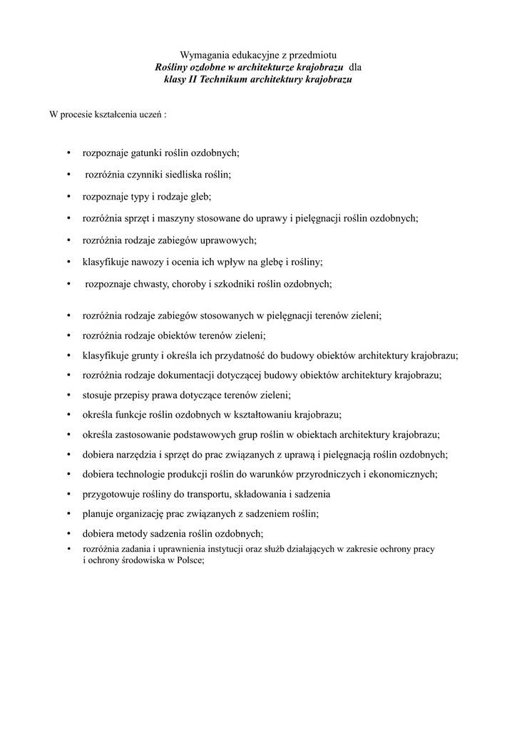 Wymagania edukacyjne z przedmiotu Rośliny ozdobne w architekturze krajobrazu dla klasy II Technikum architektury krajobrazu W procesie kształcenia uczeń : • rozpoznaje gatunki roślin ozdobnych; • rozróżnia czynniki siedliska roślin; • rozpoznaje typy i rodzaje gleb; • rozróżnia sprzęt i maszyny stosowane do uprawy i pielęgnacji roślin ozdobnych; • rozróżnia rodzaje zabiegów uprawowych; • klasyfikuje nawozy i ocenia ich wpływ na glebę i rośliny; • rozpoznaje chwasty, choroby i szkodniki roślin ozdobnych; • rozróżnia rodzaje zabiegów stosowanych w pielęgnacji terenów zieleni; • rozróżnia rodzaje obiektów terenów zieleni; • klasyfikuje grunty i określa ich przydatność do budowy obiektów architektury krajobrazu; • rozróżnia rodzaje dokumentacji dotyczącej budowy obiektów architektury krajobrazu; • stosuje przepisy prawa dotyczące terenów zieleni; • określa funkcje roślin ozdobnych w kształtowaniu krajobrazu; • określa zastosowanie podstawowych grup roślin w obiektach architektury krajobrazu; • dobiera narzędzia i sprzęt do prac związanych z uprawą i pielęgnacją roślin ozdobnych; • dobiera technologie produkcji roślin do warunków przyrodniczych i ekonomicznych; • przygotowuje rośliny do transportu, składowania i sadzenia • planuje organizację prac związanych z sadzeniem roślin; • dobiera metody sadzenia roślin ozdobnych; • rozróżnia zadania i uprawnienia instytucji oraz służb działających w zakresie ochrony pracy i ochrony środowiska w Polsce; KRYTERIA OCENIANIA Na ocenę dopuszczającą uczeń wykazuje się minimalna wiedzą z zakresu podanych wymagań i umie ją zastosować w praktyce. Z pomocą nauczyciela wyjaśnia zagadnienia zawarte w wymaganiach. Dokonuje próby oceny i rozwiązania problemu. Stosuje przepisy prawa dotyczące tematyki Na ocenę dostateczną uczeń wykazuje się wiedzą z zakresu podanych wymagań umie ją zastosować w praktyce. Z pomocą nauczyciela analizuje i wyjaśnia zagadnienia zawarte w wymaganiach. Przy wsparciu nauczyciela dokonuje oceny i rozwiązuje przedstawione przed nim problemy. Stosuje przepisy prawa dotyczące tematyki Na ocenę dobrą uczeń wykazuje się pełną wiedzą z zakresu podanych wymagań i stosuje ją w praktyce. Analizuje i wyjaśnia zagadnienia dotyczące tematu. Dokonuje oceny i rozwiązuje przedstawione przed nim problemy. Aktywnie uczestniczy w zajęciach lekcyjnych. Stosuje przepisy prawa dotyczące tematyki Na ocenę bardzo dobrą: uczeń wykazuje się pełną i szeroką wiedzą z zakresu podanych wymagań oraz umie ja sprawnie zastosować w praktyce. Samodzielnie analizuje i wyjaśnia zagadnienia związane z tematem . Dokonuje oceny i sprawnie rozwiązuje przedstawione przed nim problemy. Wykazuje się zaangażowaniem podczas zajęć lekcyjnych Stosuje przepisy prawa dotyczące tematyki Na ocenę celującą uczeń: wykazuje się umiejętnościami jak na ocenę bardzo dobra oraz osiągnięciami olimpijskimi, ponadprzeciętna wiedzą i zaangażowaniem Ocenę niedostateczna otrzymuje uczeń, który nie spełnia wymagań na ocenę dopuszczającą, wykazuje lekceważący stosunek do przedmiotu i nie stosuje się do przepisów BHP, p.poż., ochrony środowiska oraz zasad udzielania pierwszej pomocy. Podpis ucznia ............................ Podpis rodzica ............................ Opracowała Aneta Leszczyńska
