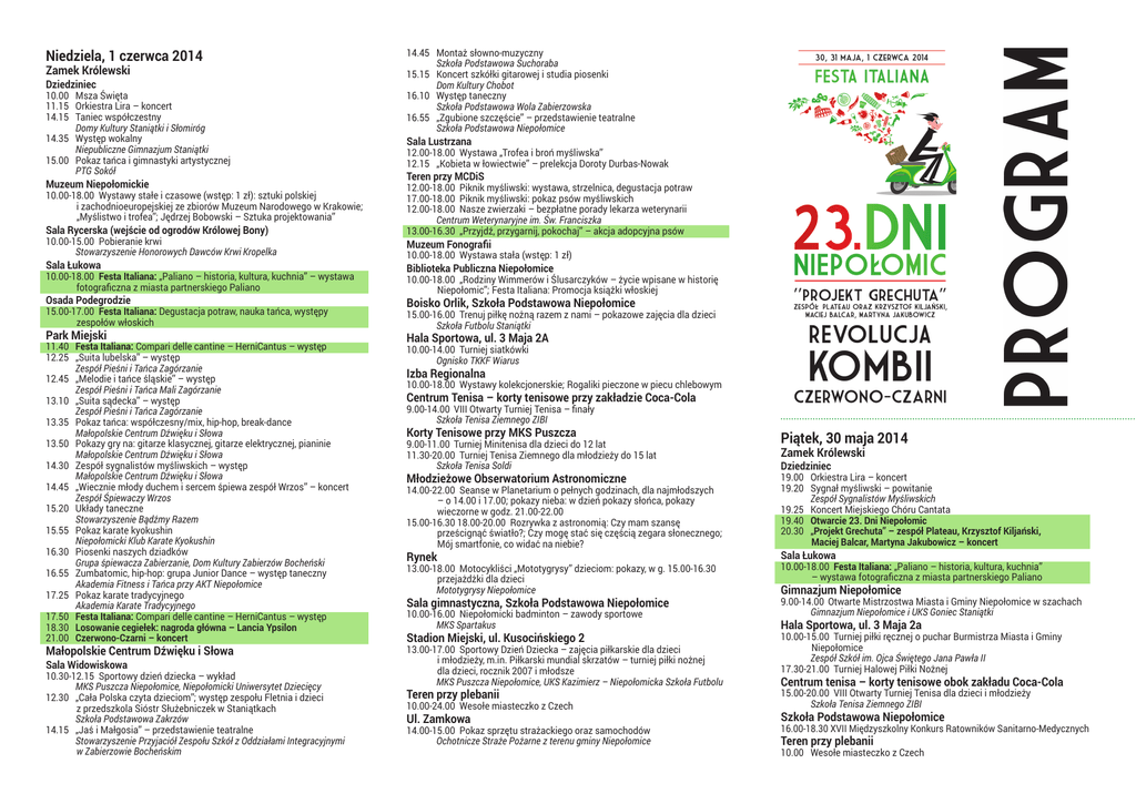 Niedziela, 1 czerwca 2014 Zamek Królewski Dziedziniec 10.00 11.15 14.15 14.35 15.00 Msza Święta Orkiestra Lira – koncert Taniec współczestny Domy Kultury Staniątki i Słomiróg Występ wokalny Niepubliczne Gimnazjum Staniątki Pokaz tańca i gimnastyki artystycznej PTG Sokół Muzeum Niepołomickie 10.00-18.00 Wystawy stałe i czasowe (wstęp: 1 zł): sztuki polskiej i zachodnioeuropejskiej ze zbiorów Muzeum Narodowego w Krakowie; „Myślistwo i trofea”; Jędrzej Bobowski – Sztuka projektowania” Sala Rycerska (wejście od ogrodów Królowej Bony) 10.00-15.00 Pobieranie krwi Stowarzyszenie Honorowych Dawców Krwi Kropelka Sala Łukowa 10.00-18.00 Festa Italiana: „Paliano – historia, kultura, kuchnia” – wystawa fotograficzna z miasta partnerskiego Paliano Osada Podegrodzie 15.00-17.00 Festa Italiana: Degustacja potraw, nauka tańca, występy zespołów włoskich Park Miejski 11.40 12.25 12.45 13.10 13.35 13.50 14.30 14.45 15.20 15.55 16.30 16.55 17.25 17.50 18.30 21.00 Festa Italiana: Compari delle cantine – HerniCantus – występ „Suita lubelska” – występ Zespół Pieśni i Tańca Zagórzanie „Melodie i tańce śląskie” – występ Zespół Pieśni i Tańca Mali Zagórzanie „Suita sądecka” – występ Zespół Pieśni i Tańca Zagórzanie Pokaz tańca: współczesny/mix, hip-hop, break-dance Małopolskie Centrum Dźwięku i Słowa Pokazy gry na: gitarze klasycznej, gitarze elektrycznej, pianinie Małopolskie Centrum Dźwięku i Słowa Zespół sygnalistów myśliwskich – występ Małopolskie Centrum Dźwięku i Słowa „Wiecznie młody duchem i sercem śpiewa zespół Wrzos” – koncert Zespół Śpiewaczy Wrzos Układy taneczne Stowarzyszenie Bądźmy Razem Pokaz karate kyokushin Niepołomicki Klub Karate Kyokushin Piosenki naszych dziadków Grupa śpiewacza Zabierzanie, Dom Kultury Zabierzów Bocheński Zumbatomic, hip-hop: grupa Junior Dance – występ taneczny Akademia Fitness i Tańca przy AKT Niepołomice Pokaz karate tradycyjnego Akademia Karate Tradycyjnego Festa Italiana: Compari delle cantine – HerniCantus – występ Losowanie cegiełek: nagroda główna – Lancia Ypsilon Czerwono-Czarni – koncert Małopolskie Centrum Dźwięku i Słowa Sala Widowiskowa 10.30-12.15 Sportowy dzień dziecka – wykład MKS Puszcza Niepołomice, Niepołomicki Uniwersytet Dziecięcy 12.30 „Cała Polska czyta dzieciom”; występ zespołu Fletnia i dzieci z przedszkola Sióstr Służebniczek w Staniątkach Szkoła Podstawowa Zakrzów 14.15 „Jaś i Małgosia” – przedstawienie teatralne Stowarzyszenie Przyjaciół Zespołu Szkół z Oddziałami Integracyjnymi w Zabierzowie Bocheńskim 14.45 15.15 16.10 16.55 Montaż słowno-muzyczny Szkoła Podstawowa Suchoraba Koncert szkółki gitarowej i studia piosenki Dom Kultury Chobot Występ taneczny Szkoła Podstawowa Wola Zabierzowska „Zgubione szczęście” – przedstawienie teatralne Szkoła Podstawowa Niepołomice Sala Lustrzana 12.00-18.00 Wystawa „Trofea i broń myśliwska” 12.15 „Kobieta w łowiectwie” – prelekcja Doroty Durbas-Nowak Teren przy MCDiS 12.00-18.00 Piknik myśliwski: wystawa, strzelnica, degustacja potraw 17.00-18.00 Piknik myśliwski: pokaz psów myśliwskich 12.00-18.00 Nasze zwierzaki – bezpłatne porady lekarza weterynarii Centrum Weterynaryjne im. Św. Franciszka 13.00-16.30 „Przyjdź, przygarnij, pokochaj” – akcja adopcyjna psów Muzeum Fonografii 10.00-18.00 Wystawa stała (wstęp: 1 zł) Biblioteka Publiczna Niepołomice 10.00-18.00 „Rodziny Wimmerów i Ślusarczyków – życie wpisane w historię Niepołomic”; Festa Italiana: Promocja książki włoskiej Boisko Orlik, Szkoła Podstawowa Niepołomice 15.00-16.00 Trenuj piłkę nożną razem z nami – pokazowe zajęcia dla dzieci Szkoła Futbolu Staniątki Hala Sportowa, ul. 3 Maja 2A 10.00-14.00 Turniej siatkówki Ognisko TKKF Wiarus Izba Regionalna 10.00-18.00 Wystawy kolekcjonerskie; Rogaliki pieczone w piecu chlebowym Centrum Tenisa – korty tenisowe przy zakładzie Coca-Cola 9.00-14.00 VIII Otwarty Turniej Tenisa – finały Szkoła Tenisa Ziemnego ZIBI Korty Tenisowe przy MKS Puszcza 9.00-11.00 Turniej Minitenisa dla dzieci do 12 lat 11.30-20.00 Turniej Tenisa Ziemnego dla młodzieży do 15 lat Szkoła Tenisa Soldi Młodzieżowe Obserwatorium Astronomiczne 14.00-22.00 Seanse w Planetarium o pełnych godzinach, dla najmłodszych – o 14.00 i 17.00; pokazy nieba: w dzień pokazy słońca, pokazy wieczorne w godz. 21.00-22.00 15.00-16.30 18.00-20.00 Rozrywka z astronomią: Czy mam szansę prześcignąć światło?; Czy mogę stać się częścią zegara słonecznego; Mój smartfonie, co widać na niebie? Rynek 13.00-18.00 Motocykliści „Mototygrysy” dzieciom: pokazy, w g. 15.00-16.30 przejażdżki dla dzieci Mototygrysy Niepołomice Sala gimnastyczna, Szkoła Podstawowa Niepołomice 10.00-16.00 Niepołomicki badminton – zawody sportowe MKS Spartakus Stadion Miejski, ul. Kusocińskiego 2 13.00-17.00 Sportowy Dzień Dziecka – zajęcia piłkarskie dla dzieci i młodzieży, m.in. Piłkarski mundial skrzatów – turniej piłki nożnej dla dzieci, rocznik 2007 i młodsze MKS Puszcza Niepołomice, UKS Kazimierz – Niepołomicka Szkoła Futbolu Teren przy plebanii 10.00-24.00 Wesołe miasteczko z Czech Ul. Zamkowa 14.00-15.00 Pokaz sprzętu strażackiego oraz samochodów Ochotnicze Straże Pożarne z terenu gminy Niepołomice Piątek, 30 maja 2014 Zamek Królewski Dziedziniec 19.00 19.20 19.25 19.40 20.30 Orkiestra Lira – koncert Sygnał myśliwski – powitanie Zespół Sygnalistów Myśliwskich Koncert Miejskiego Chóru Cantata Otwarcie 23. Dni Niepołomic „Projekt Grechuta” – zespół Plateau, Krzysztof Kiljański, Maciej Balcar, Martyna Jakubowicz – koncert Sala Łukowa 10.00-18.00 Festa Italiana: „Paliano – historia, kultura, kuchnia” – wystawa fotograficzna z miasta partnerskiego Paliano Gimnazjum Niepołomice 9.00-14.00 Otwarte Mistrzostwa Miasta i Gminy Niepo