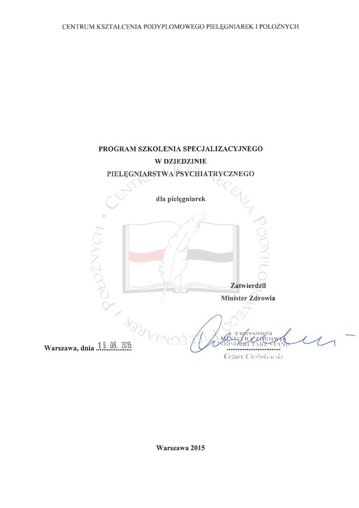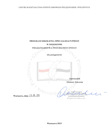 CENTRUM KSZTAŁCENIA PODYPLOMOWEGO PIELĘGNIAREK I POŁOŻNYCH PROGRAM PRZYGOTOWANY PRZEZ ZESPÓŁ PROGRAMOWY W SKŁADZIE 1 1. dr n. med. Aleksandra Cieślik – Przewodnicząca Zespołu; Zakład Pielęgniarstwa Neurologicznego i Psychiatrycznego Katedry Neurologii, Wydział Nauk o Zdrowiu, Śląski Uniwersytet Medyczny w Katowicach 2. dr n. med. Krzysztof Opozda – Zakład Pielęgniarstwa Psychiatrycznego w Katedrze Pielęgniarstwa Zachowawczego, Wydział Nauk o Zdrowiu Collegium Medicum im. L. Rydygiera w Bydgoszczy, Uniwersytet Mikołaja Kopernika w Toruniu 3. mgr Alina Pitucha – Zakład Pielęgniarstwa Psychiatrycznego, Wydział Nauk o Zdrowiu, Uniwersytet Medyczny w Lublinie 4. dr n. med. Katarzyna Wojtas – Zakład Pielęgniarstwa Klinicznego, Wydział Nauk o Zdrowiu, Uniwersytet Jagielloński Collegium Medicum RECENZENCI PROGRAMU 1. prof. dr hab. n. med. Bartosz Łoza – Kierownik Kliniki Psychiatrii WUM, Mazowieckie Specjalistyczne Centrum Zdrowia im. prof. Jana Mazurkiewicza w Pruszkowie 2. prof. nadzw. dr hab. n. hum. Ewa Wilczek-Rużyczka – Konsultant Krajowy w dziedzinie pielęgniarstwa psychiatrycznego, Katedra Psychologii Zdrowia, Wydział Psychologii i Nauk Humanistycznych, Krakowska Akademia im. Andrzeja Frycza Modrzewskiego 1 Powołany Zarządzeniem Dyrektora Centrum Kształcenia Podyplomowego Pielęgniarek i Położnych Nr 61/13 z dnia 13 listopada 2014 r. w sprawie powołania Zespołu do spraw Opracowania Programu Kształcenia Podyplomowego Pielęgniarek i Położnych. str. 2 CENTRUM KSZTAŁCENIA PODYPLOMOWEGO PIELĘGNIAREK I POŁOŻNYCH PROGRAM MODUŁU I PRZYGOTOWANY PRZEZ ZESPÓŁ PROGRAMOWY W SKŁADZIE2: 1. dr n. med. Grażyna Rogala-Pawelczyk – Przewodnicząca Zespołu; Katedra i Zakład Zarządzania w Pielęgniarstwie, Uniwersytet Medyczny w Lublinie, Prezes Naczelnej Rady Pielęgniarek i Położnych 2. dr n. med. Anita Gębska-Kuczerowska – Studium Zdrowia Publicznego, Narodowy Instytut Zdrowia Publicznego – Państwowy Zakład Higieny w Warszawie 3. mgr Jadwiga Klukow – Katedra i Zakład Zarządzania w Pielęgniarstwie, Uniwersytet Medyczny w Lublinie 4. mgr piel. Izabela Kucharska – Departament Zapobiegania oraz Zwalczania Zakażeń i Chorób Zakaźnych u Ludzi, Główny Inspektorat Sanitarny w Warszawie 5. mgr Teresa Kuziara – Komisja Nauki, Kształcenia i Rozwoju Zawodowego, Naczelna Izba Pielęgniarek i Położnych, Wiceprezes Naczelnej Rady Pielęgniarek i Położnych 6. prof. nadzw. dr hab. n. hum. Ewa Wilczek-Rużyczka – Katedra Psychologii Zdrowia, Krakowska Akademia im. Andrzeja Frycza Modrzewskiego w Krakowie 7. dr Beata Witkowska-Maksimczuk – Zakład Filozofii, Wydział Administracji i Nauk Społecznych Politechniki Warszawskiej 8. dr n. o zdr. Grażyna Wójcik – Zakład Pielęgniarstwa Społecznego Wydział Nauki o Zdrowiu, Warszawski Uniwersytet Medyczny, Prezes Polskiego Towarzystwa Pielęgniarskiego RECENZENT PROGRAMU dr hab. n. hum. Maria Kózka, prof. UJ – Konsultant Krajowy w dziedzinie pielęgniarstwa, Zakład Pielęgniarstwa Klinicznego Instytut Pielęgniarstwa i Położnictwa, Wydział Nauk o Zdrowiu, Uniwersytet Jagielloński Collegium Medicum 2 Powołany Zarządzeniem Dyrektora Centrum Kształcenia Podyplomowego Pielęgniarek i Położnych Nr 60/13 z dnia 12 listopada 2013 r. w sprawie powołania Zespołu do Spraw Opracowania Programu Kształcenia Podyplomowego Pielęgniarek i Położnych. str. 3 CENTRUM KSZTAŁCENIA PODYPLOMOWEGO PIELĘGNIAREK I POŁOŻNYCH 1. ZAŁOŻENIA ORGANIZACYJNO-PROGRAMOWE Rodzaj kształcenia: Szkolenie specjalizacyjne jest to rodzaj kształcenia, który zgodnie z ustawą z dnia 15 lipca 2011r. o zawodach pielęgniarki i położnej (Dz. U. z 2014 r., poz. 1435, z późn. zm.) ma na celu uzyskanie przez pielęgniarkę lub położną specjalistycznej wiedzy i umiejętności w określonej dziedzinie pielęgniarstwa lub dziedzinie mającej zastosowanie w ochronie zdrowia oraz tytułu specjalisty w tej dziedzinie. Efekty kształcenia wskazane w programie szkolenia specjalizacyjnego w dziedzinie pielęgniarstwa psychiatrycznego, dla pielęgniarek są dla organizatora i uczestnika kształcenia obowiązkowym elementem programu. Osiągnięcie wskazanych efektów kształcenia gwarantuje, że każdy uczestnik szkolenia specjalizacyjnego będzie posiadać takie same kwalifikacje, niezależnie od miejsca ukończenia kształcenia, podmiotu organizującego kształcenie oraz systemu kształcenia. Cel kształcenia: Przygotowanie pielęgniarki do: samodzielnego wykonywania określonych świadczeń specjalistycznych; pełnienia roli lidera; wdrażania zmian w praktyce pielęgniarskiej; oceny rozwoju własnego i członków zespołu pielęgniarskiego; uczestnictwa w projektowaniu i prowadzenia kształcenia zawodowego i podyplomowego pielęgniarek i innych przedstawicieli opieki zdrowotnej. Czas trwania kształcenia: Łączna liczba godzin przeznaczonych na realizację programu szkolenia specjalizacyjnego w kontakcie z wykładowcą/opiekunem stażu wynosi 825 godzin dydaktycznych: zajęcia teoretyczne – 400 godzin, zajęcia praktyczne – 425 godzin. Organizator kształcenia w porozumieniu z kierownikiem, ma prawo dokonać modyfikacji czasu trwania zajęć w wymiarze nie większym niż 20%. Oznacza to, że 80% czasu przeznaczonego na realizację poszczególnych modułów nie podlega zmianie. Wskazane 20%, co stanowi nie więcej niż 165 godzin, może być wykorzystane na samokształcenie. Sposób organizacji: Za przebieg i organizację szkolenia specjalizacyjnego odpowiedzialny jest organizator kształcenia. Planując realizację kształcenia, organizator powinien: 1. Opracować regulamin organizacyjny szkolenia specjalizacyjnego, który w szczególności określa: organizację; zasady i sposób naboru osób; prawa i obowiązki osób uczestniczących; zakres obowiązków kadry dydaktycznej prowadzącej nauczanie teoretyczne i praktyczne. 2. Powołać kierownika szkolenia specjalizacyjnego. Do zadań kierownik