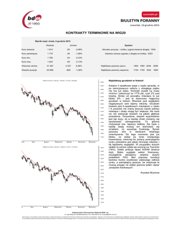 BIULETYN PORANNY czwartek, 10 grudnia 2015 KONTRAKTY TERMINOWE NA WIG20 Wyniki sesji: środa, 9 grudnia 2015 Wartość System: zmiana Kurs otwarcia 1 814 -50 -2,68% Aktualna pozycja – krótka, sygnał otwarcia długiej– 1930 Kurs zamknięcia 1 775 -36 -1,99% Ostatnia zmiana sygnału z długiej na krótką - 2023 Kurs min. 1 766 -44 -2,43% Kurs max. 1 824 -59 -3,13% Wolumen obrotu 31 387 2 427 8,38% Najbliższe poziomy oporu: 1900 1950 2040 2090 Otwarte pozycje 63 608 -826 -1,28% Najbliższe poziomy wsparcia: 1735 1700 1632 1600 FW20 (1,814.00, 1,824.00, 1,766.00, 1,775.00, -36.0000) 2500 2450 2400 2350 2300 2250 2200 2150 2100 2050 2000 1950 1900 1850 1800 1750 June July August September October November December WIG20 (1,816.59, 1,823.34, 1,769.60, 1,773.21, -41.6700) 2500 2450 2400 2350 2300 2250 Najsłabszy grudzień w historii Kolejne 3 spadkowe sesje z rzędu sprawiły, iż po zainicjowanym odbiciu z ubiegłego piątku nie ma już śladu. Kontrakt zszedł na nowe minima i zakończył na 1775 pkt, czyli 2% pod kreską. Strata od początku miesiąca to już blisko 8% i jest to sezonowo najgorszy grudzień w historii. Również pod względem negatywnych serii bijemy rekordy. Grudzień bowiem jest 8 spadkowym miesiącem z rzędu ! A przecież nie mamy jeszcze nawet połowy miesiąca i straty mogą być większe. Na razie nic nie wskazuje bowiem na jakieś głębsze przesilenie. Oczywiście, stopień wyprzedania jest tak duży, że w każdej chwili możemy się spodziewać odreagowania. To główna motywacja tzw. łapaczy dołków. Na razie z każdą sesją muszą oni obchodzić się smakiem, co wywołuje frustrację. Rynek poszuka dna w okolicach totalnego zniechęcenia. Do tego momentu jest już blisko, co widać po tonie niniejszego komentarza, niemniej do zmiany postrzegania rynku potrzebna jest jakaś formacja odwrotu i tej będziemy wyglądać. W przypadku dużych spółek ta sztuka udała się wczoraj na Tauronie (+9%). Dołek próbuje łapać KGHM (świeca doji). Słabo wygląda sektor finansowy, szczególnie obciążony ostatnio dużym podatkiem PZU. Bez poprawy kondycji banków trudno oczekiwać większego odbicia rynku, a pamiętajmy jeszcze, że instytucje te muszą przyjąć na siebie jeszcze jeden ciężar „kredytów frankowych”. 2200 2150 Krystian Brymora 2100 2050 2000 1950 1900 1850 1800 1750 June July August September October November December Wydział Analiz i Informacji Dom Maklerski BDM S.A. ul. 3-go Maja 23, 40-096 Katowice, Tel.: 032 208 14 12, [email protected] Opracowanie ma charakter czysto informacyjny i zostało opracowany na podstawie informacji uznanych przez autorów za wiarygodne . Zawarte w nim komentarze są subiektywnymi poglądami autorów. Opracowanie i zawarte w nim komentarze nie są podstawą żadnej rekomendacji kupna bądź sprzedaży w rozumieniu obowiązującego prawa i nie powinny być tak interpretowane. Publikowanie w prasie lub w Internecie całości lub części opracowania wymaga zgody sporządzających raport. BIULETYN PORANNY czwartek, 10 grudnia 2015 RYNEK AKCJI Wyniki sesji: środa, 9 grudnia 2015 52 tygodnie Indeks Kurs otwarcia Kurs zamknięcia Zmiana [%] Kurs min. Kurs max. Zakres wahań Obrót [mln PLN] Kurs max. Kurs min. WIG20 2 558,6 1 769,6 1 816,59 1 773,21 -2,30% 1 769,60 1 823,34 53,7 855,4 WIG30 2 782,4 1 987,7 2 035,99 1 987,66 -2,31% 1 987,66 2 043,80 56,1 939,2 mWIG40 3 961,0 3 388,6 3 528,21 3 467,19 -1,84% 12 711,91 12 942,66 230,8 244,4 sWIG80 14 107,4 11 847,7 12 913,65 12 766,33 -1,55% 3 446,18 3 537,50 91,3 43,7 WIG-PL 58 998,6 45 576,1 45 777,78 45 576,10 -2,07% 45 576,10 45 777,78 201,7 1 074,1 WIG 57 460,4 44 661,5 45 624,06 44 670,09 -2,06% 44 661,48 45 733,66 1072,2 1 099,8 Spółka zmiana % względem WIG30 zmiana % Cena [PLN] Mkt Cap [mln PLN] dzienna 1M 3M 6M dzienna 1M 3M 6M -4,2% -20,1% -30,2% -33,0% -1,9% -8,4% -12,7% -9,3% ALIOR BANK 60,35 4 388 ASSECOPOL 57,30 4 756 1,2% 2,7% 6,0% -4,5% 3,5% 14,4% 23,5% 19,2% BANK HANDLOWY 64,00 8 362 -3,3% -11,3% -26,8% -38,5% -1,0% 0,4% -9,3% -14,8% BOGDANKA 34,40 1 170 -3,1% -17,9% -30,9% -50,8% -0,8% -6,2% -13,4% -27,1% BORYSZEW 4,70 1 128 -1,1% -5,8% -8,2% -21,4% 1,3% 5,9% 9,3% 2,3% BZ WBK 253,50 25 156 -1,5% -11,2% -18,0% -23,2% 0,8% 0,5% -0,5% 0,5% CCC 132,85 5 101 -7,7% -10,4% -22,5% -24,1% -5,4% 1,3% -5,0% -0,4% CYFROWY POLSAT 22,95 14 678 -3,7% -11,6% -2,5% -7,5% -1,4% 0,1% 15,0% 16,2% ENEA 10,77 4 754 -2,3% -13,9% -25,6% -35,3% 0,0% -2,2% -8,1% -11,7% EUROCASH 52,00 7 217 -6,3% 2,5% 18,5% 34,6% -4,0% 14,2% 36,0% 58,3% GRUPA AZOTY 106,95 10 609 0,0% 3,2% 18,7% 35,5% 2,3% 14,9% 36,2% 59,1% 7,14 3 286 -0,1% 3,5% 21,0% 25,3% 2,2% 15,2% 38,5% 48,9% ING BSK 113,45 14 760 -3,9% -6,7% -7,4% -17,2% -1,5% 5,0% 10,1% 6,5% JSW 10,50 1 233 -4,5% -19,2% -3,3% -17,3% -2,2% -7,5% 14,2% 6,4% KERNEL 44,00 3 506 -2,9% -15,4% 2,3% 15,3% -0,6% -3,7% 19,9% 39,0% KGHM 59,36 11 872 0,4% -31,5% -30,6% -48,8% 2,7% -19,8% -13,1% -25,2% LOTOS 28,00 5 176 -1,4% -1,1% -9,6% -1,7% 0,9% 10,6% 7,9% 22,0% 5 830,00 10 675 -9,1% -16,4% -25,3% -19,2% -6,8% -4,7% -7,7% 4,5% 295,00 12 460 -2,2% -11,7% -20,9% -33,0% 0,1% 0,0% -3,4% -9,3% NETIA 5,36 1 866 -0,2% -2,5% 0,2% -17,0% 2,1% 9,2% 17,7% 6,6% ORANGE POLSKA 6,47 8 491 -0,3% -10,6% -10,8% -29,5% 2,0% 1,1% 6,7% -5,9% PEKAO 137,75 36 155 -0,7% -5,1% -14,9% -24,3% 1,6% 6,6% 2,6% -0,6% PGE 12,16 22 736 -0,7% -19,0% -22,8% -37,0% 1,7% -7,3% -5,3% -13,4% PGNIG 5,11 30 149 1,2% -19,8% -23,7% -23,7% 3,5% -8,1% -6,2% -0,1% PKNORLEN 63,57 27 189 -3,1% -4,0% -12,2% -6,5% -0,8% 7,7% 5,3% 17,1% PKOBP 25,11 31 388 -3,2% -9,2% -15,0% -25,1% -0,9% 2,5% 2,5% -1,4% PKP CARGO 61,00 2 732 -1,5% -3,3% -10,7% -29,1% 0,9% 8,4% 6,8% -5,5% PZU 32,27 27 866 -4,5% -12,1% -26,2% -25,8% -2,2% -0,4% -8,7% -2,1% SYNTHOS 3,60 4 764 -1,4% -8,9% -9,5% -25,8% 0,9% 2,8% 8,0% -2,1% TAURON 2,59 4 539 9,3% -19,1% -29,4% -42,8% 11,6% -7,4% -11,9% -19,2% GTC LPP mBANK Wydział Analiz i Informacji Dom Maklerski BDM S.A. ul. 3-go Maja 23, 40-096 Katowice, Tel.: 032 208 14 12, [