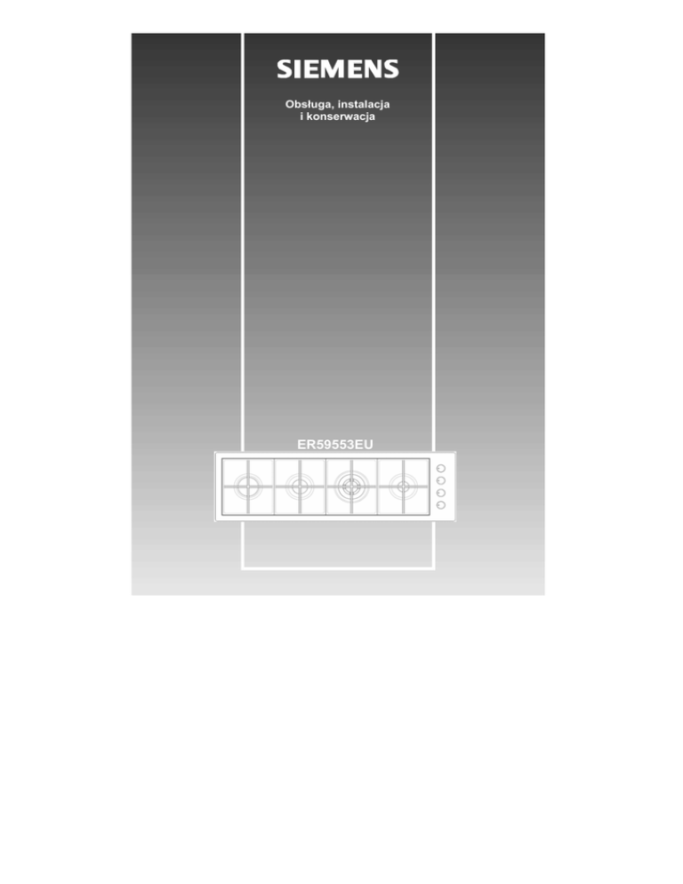 Obsługa, instalacja i konserwacja ER59553EU 1 PL Obsługa, instalacja i konserwacja strona 02 Polski Szanowny Kliencie, Dziękujemy za dokonanie zakupu kuchenki gazowej i gratulujemy wyboru. To praktyczne urządzenie, zarówno nowoczesne, jak i funkcjonalne, zostało wyprodukowane z materiałów najwyższej jakości poddawanych bardzo dokładnym kontrolom jakości podczas całego procesu produkcyjnego. Urządzenie zostało dokładnie przebadane, aby spełniało wszystkie Państwa oczekiwania. Aby zapewnić doskonałe wyniki pracy począwszy od pierwszego użycia urządzenia, zaleca się zapoznanie z niniejszą instrukcją. Zawiera ona ważne informacje, nie tylko dotyczące sposobu obsługi, ale również konserwacji i bezpieczeństwa. Podczas transportu nasze produkty powinny być stosownie opakowane. Ograniczyliśmy jednak nasze opakowanie do niezbędnego minimum, a materiały są całkowicie przetwarzane. Państwo również mogą przysłużyć się ochronie środowiska wyrzucając opakowania do pobliskiego pojemnika na odpady przeznaczone do recyklingu. Przed pozbyciem się starego urządzenia, należy upewnić się, że jest bezużyteczne i dopiero wtedy wywieźć do centrum odzyskiwania materiałów przetwarzanych. Lokalne władze samorządowe udzielą informacji, gdzie znajduje się najbliższe centrum. Ostrzeżenia bezpieczeństwa 2 Aby zapewnić efektywną i bezpieczną pracę urządzenia, należy uważnie przeczytać niniejszą instrukcję obsługi. Poniższe instrukcje dotyczą jedynie krajów, których symbol został umieszczony na tabliczce znamionowej urządzenia. Aby dostosować urządzenie do warunków w danym kraju, należy zawsze przestrzegać instrukcji technicznych. Należy zachować instrukcje użytkownika i montażu, żeby móc je przekazać, jeśli będą chcieli Państwo kiedykolwiek przekazać urządzenie komuś innemu. Schematy zawarte w niniejszej książce instruktażowej mają na celu podanie jedynie ogólnych informacji. Urządzenie jest przeznaczone jedynie do użytku w gospodarstwach domowych. Urządzenia należy używać jedynie do gotowania, nigdy jako formy ogrzewania. Zgodnie z aktualnymi przepisami, instalację urządzenia, zmianę typu gazu czy innych regulacji dokonywanych wewnątrz urządzenia może przeprowadzać jedynie autoryzowany personel techniczny. Przed zainstalowaniem nowej płyty kuchennej, należy sprawdzić czy wymiary są odpowiednie. Urządzenie należy instalować zgodnie z obowiązującymi przepisami i używać tylko w dobrze wentylowanych pomieszczeniach. Przed instalacją i rozpoczęciem eksploatacji należy przeczytać niniejsze instrukcje. Podczas wszelkich prac konserwacyjnych należy odłączać urządzenie od źródła zasilania. W tym celu należy wyjąć wtyczkę źródła zasilania lub uruchomić odpowiedni bezpiecznik. Zamknąć dopływ gazu. Urządzenie nie powinno być podłączone do urządzenia do usuwania produktów spalania. Podłączając urządzenia elektryczne w pobliżu niniejszego urządzenia, należy pamiętać, żeby kable nie stykały się z gorącymi powierzchniami grzewczych. Przed pierwszym użyciem należy dokładnie oczyścić urządzenie i jego wyposażenie. Wyeliminuje to zapach "nowości" i zabrudzenie. Opakowanie urządzenia należy odpowiednio zutylizować. Elementy opakowania należy przechowywać poza zasięgiem dzieci. Nie zostawiać urządzenia bez nadzoru podczas pracy. Ponieważ powierzchnie grzewcze silnie się nagrzewają podczas pracy, należy je obsługiwać zachowując ostrożność. Należy zawsze pamiętać, aby dzieci nie zbliżały się do urządzenia. Gorący tłuszcz i olej łatwo się zapalają, dlatego też smażąc na tłuszczu lub oleju należy pilnować patelni. NIEBEZPIECZEŃSTWO Jeśli patelnia z tłuszczem lub olejem zapali się, nie należy zalewać jej wodą, może to doprowadzić do poparzeń. Należy nakryć patelnię wilgotną ścierką aby zgasić ogień i odłączyć kuchenkę. Nigdy nie używać uszkodzonego urządzenia. W przypadku uszkodzenia urządzenia, należy wyłączyć dopływ gazu i prądu a następnie skontaktować się z naszym działem pomocy technicznej. Patelnie należy zawsze stawiać centralnie na palniku, i nigdy nie stawiać garnków bezpośrednio na palnikach. Nigdy nie ustawiać niestabilnych patelni lub naczyń na płycie ani palnikach, ponieważ mogą się przewrócić. Nie korzystać z urządzenia, kiedy nie ma na nim garnków ani patelni. Sprawdzić, czy wszystkie części palnika zostały prawidłowo zamontowane. Nie podgrzewać pustych garnków czy patelni; może to spowodować nadmierną akumulację ciepła. 3 Zdejmując na krótko garnki lub patelnie, palniki należy przełączyć na najniższe ustawienie. W ten sposób, zmniejsza się ryzyko poparzenia stojąc blisko płomienia; jest to również oszczędność gazu i obniżenie poziomu zanieczyszczeń. Garnki i patelnie o grubych spodach mogą zwiększyć rozkład ciepła. Płomień jest lepiej wykorzystywany, co również przyczynia się do oszczędności kosztów. Nie należy używać garnków ani patelni o średnicy większej niż 28 cm. Podstawki pod głębokie woki są sprzedawane oddzielnie. Jeśli zawór gazu zablokuje się, nie należy próbować odetkać go na siłę. Należy natychmiast powiadomić nasz serwis techniczny. Nie czyścić urządzenia parą ani wodą pod ciśnieniem – ryzyko zwarcia. W przypadku zainstalowania kuchenki pod okapem, na włączonych palnikach należy zawsze ustawić garnek lub patelnię. Otwarty płomień może spowodować uszkodzenie okapu przez wytworzone zewnętrznie ciepło lub może spowodować zapalenie osadów tłuszczu na filtrze. Zapewnić odpowiedni dopływ powietrza, kiedy okap jest włączony w trybie wywiewowym. Kuchenka gazowa generuje ciepło i wilgoć w pomieszczeniu, w którym jest zainstalowana. Należy zadbać o dobrą wentylację w kuchni. Naturalne otwory wentylacyjne nie mogą być zastawiane. Korzystanie z urządzenia przez d