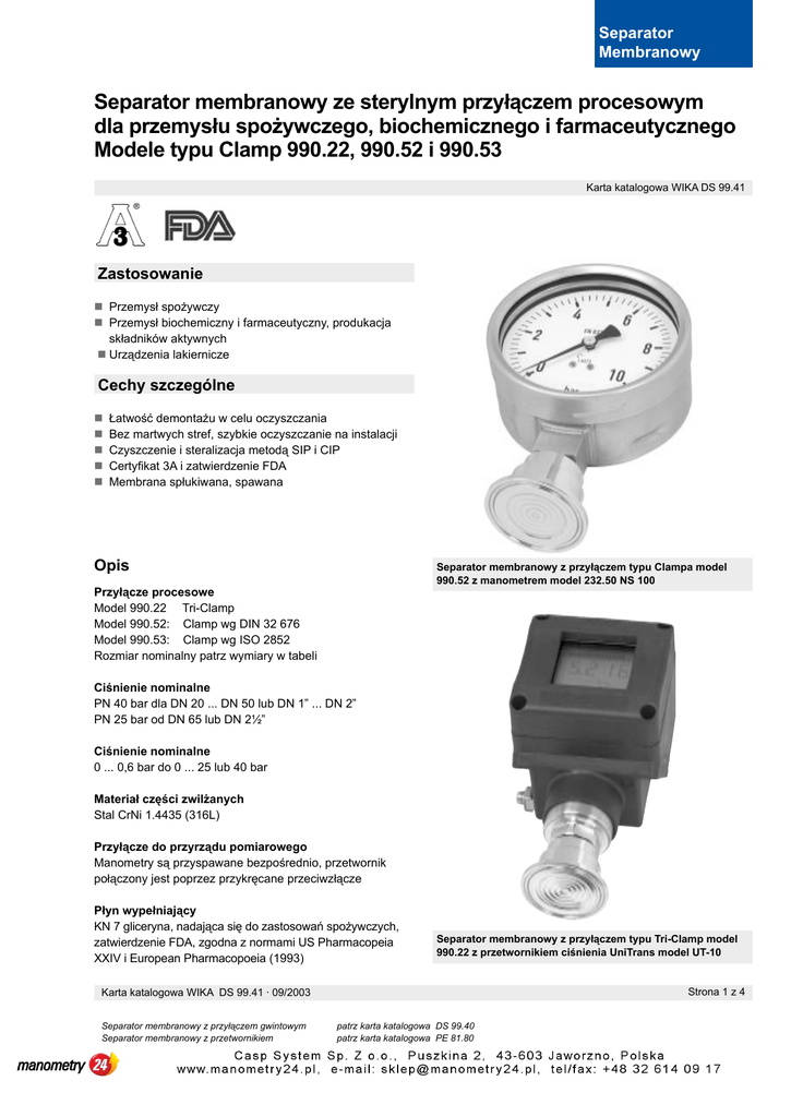 Separator Membranowy Separator membranowy ze sterylnym przyłączem procesowym dla przemysłu spożywczego, biochemicznego i farmaceutycznego Modele typu Clamp 990.22, 990.52 i 990.53 Karta katalogowa WIKA DS 99.41 Zastosowanie Przemysł spożywczy Przemysł biochemiczny i farmaceutyczny, produkacja składników aktywnych Urządzenia lakiernicze Cechy szczególne Łatwość demontażu w celu oczyszczania Bez martwych stref, szybkie oczyszczanie na instalacji Czyszczenie i steralizacja metodą SIP i CIP Certyfikat 3A i zatwierdzenie FDA Membrana spłukiwana, spawana Opis Separator membranowy z przyłączem typu Clampa model 990.52 z manometrem model 232.50 NS 100 Przyłącze procesowe Model 990.22 Tri-Clamp Model 990.52: Clamp wg DIN 32 676 Model 990.53: Clamp wg ISO 2852 Rozmiar nominalny patrz wymiary w tabeli Ciśnienie nominalne PN 40 bar dla DN 20 ... DN 50 lub DN 1” ... DN 2” PN 25 bar od DN 65 lub DN 2½” Ciśnienie nominalne 0 ... 0,6 bar do 0 ... 25 lub 40 bar Materiał części zwilżanych Stal CrNi 1.4435 (316L) Przyłącze do przyrządu pomiarowego Manometry są przyspawane bezpośrednio, przetwornik połączony jest poprzez przykręcane przeciwzłącze Płyn wypełniający KN 7 gliceryna, nadająca się do zastosowań spożywczych, zatwierdzenie FDA, zgodna z normami US Pharmacopeia XXIV i European Pharmacopoeia (1993) Separator membranowy z przyłączem typu Tri-Clamp model 990.22 z przetwornikiem ciśnienia UniTrans model UT-10 Strona 1 z 4 Karta katalogowa WIKA DS 99.41 · 09/2003 Separator membranowy z przyłączem gwintowym Separator membranowy z przetwornikiem patrz karta katalogowa DS 99.40 patrz karta katalogowa PE 81.80 Opcjonalnie Przyłącze procesowe Gwint zewnętrzny Inne średnice znamionowe, przyłącze takie jak Südmo, BBS i sterylne przyłącza procesowe na zapytania Ciśnienie nominalne Wyższe ciśnienie nominalne na zapytanie Materiał części zwilżanych Stal CrNi elektropolerowana 1.4435 Inne materiały na zapytanie Montaż przyrządów pomiarowych Montaż poprzez wieże chłodzącą Montaż poprzez kapilarę, przy zamówieniu proszę podać długość kapilary Płyn wypełniający Ciekła parafina KN 62 l (medyczny olej biały), nadaje się do zastosowań farmaceutycznych, zatwierdzenie FDA Gliceryna/woda KN 12, zatwierdzenie FDA Przykładowe połączenie bezpośrednie separatora membranowego model 990.22 z manometrem do kształtki rurowej Przyrząd pomiarowy NG (manometr lub przetwornik ) Montaż bezpośredni h Płyn wypełnający Separator membranowy Membrana (przyspawana do separatora) Ø Mb Zacisk typu Clamp Uszczelka Przyspawana oprawka Nie zawarte w zamówieniu Ød Ø d1 ØD Legenda: Ø Mb efektywna średnica membrany Ød wewnętrzna średnica rury Ø d1 zewnętrzna średnica rury ØD średnica zacisku h wysokość Manometr Rozmiar nominalny Rozmiar w mm h NS 63 NS 100 ok. 105 ok. 156 Strona 2 z 4 Karta katalogowa WIKA DS 99.41 · 09/2003 Wymiary w mm Model 990.22 Tri-Clamp dla rur wg ISO 1127 DN 20 25 32 40 50 65 Dla zew. Ø rury x grubość PN 1) 26,9 x 1,6 33,7 x 2 42,4 x 2 48,3 x 2 60,3 x 2 76,1 x 2 40 40 40 40 40 25 Tri-Clamp dla rury wg ASME BPE Rozmiar w mm DN D d Mb 50,5 50,5 50,5 64 77,5 91 23,7 10,3 38,4 44,3 56,3 72,1 22 25 32 40 52 72 1) W przypadku max. zakresu ciśnienia należy wziąć pod uwagę zakres ciśnienia zacisku typu Clamp 1” 1 ½” 2” 2 ½” 3” Dla zew. Ø rury x grubość PN 1) 25,4 x 1,65 38,1 x 1,65 50,8 x 1,65 63,5 x 1,65 76,2 x 1,65 40 40 40 25 25 Rozmiar w mm D d Mb 50,5 50,5 64 77,5 91 22,2 34,8 47,5 60,2 72,9 22 32 40 52 72 1) W przypadku max. zakresu ciśnienia należy wziąć pod uwagę zakres ciśnienia zacisku typu Clamp Tri-Clamp dla rury wg BS4825 część 3 i O.D.-Tube DN 1” 1 ½” 2” 2 ½” 3” Dla zew. Ø rury x grubość PN 1) 25,4 x 1,6 38,1 x 1,6 50,8 x 1,6 63,5 x 1,6 76,2 x 1,6 40 40 40 25 25 Rozmiar w mm D d Mb 50,5 50,5 64 77,5 91 22,2 34,9 47,6 60,3 73,0 22 32 40 52 72 1) W przypadku max. zakresu ciśnienia należy wziąć pod uwagę zakres ciśnienia zacisku typu Clamp Model 990.52 Clamp wg DIN 32 676 dla rury wg DIN 11850 DN 25 32 40 50 65 80 100 Dla zew. Ø rury x grubość PN 1) 28 x 1 34 x 1 40 x 1 52 x 1 70 x 2 85 x 2 104 x 2 40 40 40 40 25 25 25 Model 990.53 Clamp ISO 2852 dla rury wg ISO 2037 i BS 4825 część 1 Rozmiar w mm DN D d Mb 50,5 50,5 50,5 64 91 106 119 26 32 38 50 66 81 100 25 29 32 40 60 72 90 1) W przypadku max. zakresu ciśnienia należy wziąć pod uwagę zakres ciśnienia zacisku typu Clamp 25 28 33,7 38 40 51 63,5 70 76,1 88,9 101,6 Dla zew. Ø rury x grubość PN 1) 25 x 1,2 28 x 1,2 33,7 x 1,2 38 x 1,2 40 x 1,2 51 x 1,2 63,5 x 1,6 70 x 1,6 76,1 x 1,6 88,9 x 2 101,6 x 2 40 40 25 25 25 25 25 25 25 25 25 Rozmiar w mm D d Mb 50,5 50,5 50,5 50,5 64 64 77,5 91 91 106 119 22,6 25,6 31,3 35,6 37,6 48,6 60,3 66,8 72,9 84,9 97,6 22 22 25 32 35 40 52 60 72 72 90 1) W przypadku max. zakresu ciśnienia należy wziąć pod uwagę zakres ciśnienia zacisku typu Clamp Karta katalogowa WIKA DS 99.41 · 09/2003 Strona 3 z 4 Możliwe kombinacje Manometr z rurką Bourdona Separator membranowy model 990.22, 990.52 lub 990.53 mogą być połączonemogą być połączone z manometrami z rurką Bourdona, jeśli uwzględnione będą następujące warunki, dotyczące zastosowania: Separator membranowy połączony bezpośrednio z manometrem Zakres temperatury Medium: +10 ... +150 °C Otoczenie: +10 ... +40 °C Wybór Manometr Model Najniższy zakres ciśnienia Przyłącze typu Clamp DN 20 ... 28 (1”) 32 (1 ½”) ... 51 (2”) 63,5 ... 70 (2 ½”) 76,1 (3”) ... 23x.50.63 23x.50.100 0 ... 4 bar -1 ... 3 bar 23x.50.63 23x.50.100 0 ... 2 bar -1 ... 3 bar 23x.50.63 23x.50/30.100 0 ... 1 bar -1 ... 1,5 bar 23x.50.63 23x.50/30.100 0 ... 0,6 bar -1 ... 1,5 bar 2 x pełen zakres 2 x pełen zakres 2 x pełen zakres możliwe możliwe możliwe Przyłącze typu Clamp DN 20 ... 28 (1”) 32 (1 ½”) ... 51 (2”) 63,5 ... 70 (2 ½”) 76,1 (3”) ... 0 ... 2,5 bar 0 ... 600 mbar 0 