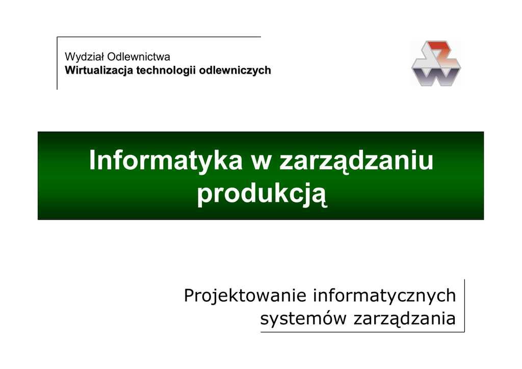 Wydział Odlewnictwa Wirtualizacja technologii odlewniczych Informatyka w zarządzaniu produkcją Projektowanie informatycznych systemów zarządzania Proces zarządzania Ciąg następujących po sobie, a często współbieŜnych, działań mających na celu takie oddziaływanie na system wykonawczy, by zapewnić realizację wyznaczonego zadania (celów). Podstawowe rodzaje tych działań to: planowanie, organizowanie, motywowanie, kontrolowanie. Informatyka w zarządzaniu produkcją 2 Sterowanie produkcją Wielkości zadane Plan (norma) Regulator (dyspozytor) Zakłócenia Produkcja Pomiar (ewidencja i kontrola) Informatyka w zarządzaniu produkcją Model operacyjny (sposób obliczania planu) 3 Problemy decyzyjne Planowanie Rozdział zadań produkcyjnych (między wydziałami, zakładami) Ustalanie struktury produkcji Planowanie długookresowe Potrzeb materiałowych (MRP) Informatyka w zarządzaniu produkcją 4 Problemy decyzyjne Organizowanie Zorganizowanie struktury przestrzenno-czasowej Harmonogramowanie Grupowanie Zarządzanie zapasami Gospodarka remontowa (wymiana) Kontrolowanie Kontrola jakości Informatyka w zarządzaniu produkcją Sterowanie procesami 5 Problemy decyzyjne programowanie liniowe, programowanie dynamiczne, drzewo decyzyjne, techniki heurystyczne, modele zapasów, modele kolejek, planowanie sieciowe, modele symulacyjne, techniki statystyczne i ekonometryczne. Informatyka w zarządzaniu produkcją Jedną z metod podejmowania decyzji są modele matematyczne. Thierauf przedstawia ich następujące rodzaje: 6 Przedsiębiorstwo mające m środków produkcji o moŜliwościach si, moŜe wytwarzać n róŜnych wyrobów. Potrzeba aij jednostek i-tego środka do wytworzenia jednostki j-tego wyrobu, która daje zysk jednostkowy cj. Problem Opracować program produkcji, który będzie maksymalizował poziom zysku Informatyka w zarządzaniu produkcją Planowanie struktury produkcji 7 Planowanie struktury produkcji Formalny zapis problemu n Z = ∑ c j ⋅ x j → max j =1 n ∑a ij ⋅ xi ≤ si i = 1,2,...,m j =1 xj ≥ 0 Informatyka w zarządzaniu produkcją 8 85% firm z listy Fortune 500 deklaruje uŜywanie LP jako narzędzia wspomagania zarządzania. Przypadek Libbey-Owens-Ford (LOF) LOF jest wielkim koncernem produkującym szkło okienne o wartości 900 mln USD i zatrudniającym 9000 pracowników. Na początku lat 90 LOP zbudował i wdroŜył wielki model LP produkcji i dystrybucji szkła. Model FLAGPOL (FLAt Glass Products Optmization Model) słuŜy do rocznego planowania produkcji ponad 200 wyrobów w 4 zakładach i ich dystrybucji do 40 odbiorców hurtowych. Prace trwały 2 lata i przyniosły roczne oszczędności ponad 2 mln USD. Informatyka w zarządzaniu produkcją Planowanie struktury produkcji 9 Zdolności produkcyjne przedsiębiorstwa wynoszą Zi jednostek wyrobu i, zdolności magazynowania M jednostek wyrobów. Zapotrzebowanie na wyrób i w okresie t wynosi Pit jednostek. Jednostkowy koszt wytworzenia i magazynowania i-tego wyrobu w okresie t wynosi odpowiedni kwit i kmit. Problem Opracować plan produkcji, który będzie minimalizował łączne koszty produkcji i utrzymania zapasów w przyjętym horyzoncie planowania. Informatyka w zarządzaniu produkcją Planowanie długookresowe 10 Planowanie długookresowe Formalny zapis problemu n K =∑ i =1 m ∑ (kw it ⋅ xit + kmit ⋅ yit ) → min t =1 n xit ≤ Zi ∑y it ≤M i = 1,...,n i =1 x it ≥ 0 x it + y it −1 ≥ Pit Informatyka w zarządzaniu produkcją 11 Mając dany plan produkcji wyrobów gotowych oraz znając potrzeby materiałowe na ich wytworzenie: zbilansować wielkość przepływów (w czasie) materiałów, części i komponentów w celu wytworzenia wyrobów gotowych. Podstawowe równanie MRP: Potrzeby netto=potrzeby brutto-zapas Podstawowa struktura MRP: BOM – Bill of Materials Informatyka w zarządzaniu produkcją Planowanie długookresowe 12 Ewolucja systemów - MRP Było – lata 70. BOM INV MRP Informatyka w zarządzaniu produkcją 13 Ewolucja systemów - MRPII Było – lata 90 (standard APICS). DEM SOP RRP PUR MPS BOM MRP INV CRP SFC MC Informatyka w zarządzaniu produkcją 14 System planowania produkcji opracowany przez amerykańską firmę i2 Technologies o nazwie RYTHM dostarcza kompleksowych i inteligentnych rozwiązań dla funkcji planowania i harmonogramowania w przedsiębiorstwach. Integrują się one z systemami typu MRP II lub ERP, jak równieŜ z transakcyjnymi systemami baz danych. Informatyka w zarządzaniu produkcją Przykłady zastosowania 15 Źródło: Materiały promocyjne i2 Technologies W Timken Steel, produkującej pręty ze stali stopowej i rury bez szwu, realizowanych jest równocześnie od 8 do 15 tys. zamówień. Dzięki zastosowaniu systemu cykl produkcyjny w Timken został skrócony o 30 – 40%, zapasy zostały zredukowane o 25% i znacznie poprawiono terminowość realizacji zamówień. PoniewaŜ produkty przepływają szybciej przez fabryki, Timken zredukował wydatki operacyjne. Informatyka w zarządzaniu produkcją Przykłady zastosowania 16 Źródło: Materiały promocyjne i2 Technologies Worthington Steel jest czołowym przetwórcą taśm i blach dla przemysłu samochodowego, urządzeń AGD, ogrodnictwa i innych przemysłów. Zastosowanie systemu umoŜliwiło redukcję wielkości produkcji w toku o 40 – 60%. O 33% skrócono średni czas realizacji zamówienia. Ponadto poprawiona została terminowość dostaw. Informatyka w zarządzaniu produkcją Przykłady zastosowania 17 Źródło: Materiały promocyjne i2 Technologies