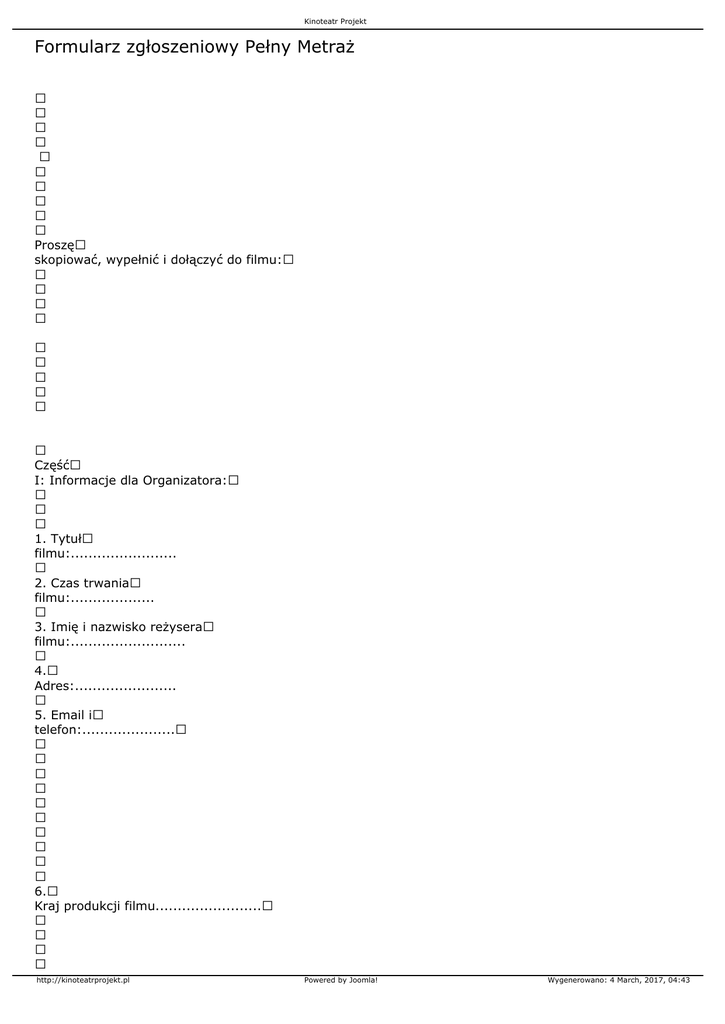 Kinoteatr Projekt Formularz zgłoszeniowy Pełny Metraż Proszę skopiować, wypełnić i dołączyć do filmu: Część I: Informacje dla Organizatora: 1. Tytuł filmu:........................ 2. Czas trwania filmu:................... 3. Imię i nazwisko reżysera filmu:.......................... 4. Adres:....................... 5. Email i telefon:..................... 6. Kraj produkcji filmu........................ http://kinoteatrprojekt.pl Powered by Joomla! Wygenerowano: 4 March, 2017, 04:43 Kinoteatr Projekt 7. Rok produkcji.......................... 8. Nazwa producenta:....................... 9. Imię i nazwisko osoby zgłaszającej film do konkursu *..................... 10. Adres osoby zgłaszającej film do konkursu *........................ 11. Email i telefon do osoby zgłaszającej film do konkursu *................... * - jeśli osobą zgłaszającą nie jest reżyser filmu. 12. Ewentualne uwagi techniczne na temat filmu:............... Część II: http://kinoteatrprojekt.pl Powered by Joomla! Wygenerowano: 4 March, 2017, 04:43 Kinoteatr Projekt Informacje do programu, na stronę internetową i dla mediów: 1. Twórcy filmu:....................... 2. Krótka notatka o reżyserze filmu i kontakt do reżysera lub producenta filmu:............... 3. Krótkie streszczenie filmu (max. pół strony):................. http://kinoteatrprojekt.pl Powered by Joomla! Wygenerowano: 4 March, 2017, 04:43 Kinoteatr Projekt 4. Czy zgadzasz się na projekcję filmu na specjalnych pokazach pofestiwalowych jeśli film nie dostanie się do programu Festiwalu Tak....... Nie........ (podkreślić właściwą odpowiedź) Oświadczam, iż zapoznałem się z regulaminem Festiwalu i akceptuję jego zasady. Oświadczam ponadto, iż posiadam pełne prawo do zgłoszenia w/w filmu do konkursu i ponoszę odpowiedzialność za ewentualne naruszenie praw osób trzecich w związku z prezentacją filmu na festiwalu „Pełny Metraż”. Załączniki do przesyłki pocztą tradycyjną (w przypadku wszelkich wątpliwości patrz: Regulamin): 1. płyta DVD lub Blu Ray z filmem 2. płyta z kadrami z filmu, zdjęciem cyfrowym reżysera filmu, plikiem z formularzem zgłoszeniowym, oraz plikiem z listą dialogową (dot. filmu niepolskojęzycznego). http://kinoteatrprojekt.pl Powered by Joomla! Wygenerowano: 4 March, 2017, 04:43 Kinoteatr Projekt Miejscowość, data podpis os. zgłaszającej http://kinoteatrprojekt.pl Powered by Joomla! Wygenerowano: 4 March, 2017, 04:43