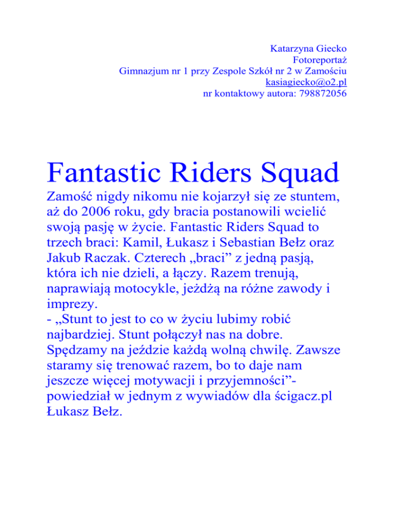 Katarzyna Giecko Fotoreportaż Gimnazjum nr 1 przy Zespole Szkół nr 2 w Zamościu [email protected] nr kontaktowy autora: 798872056 Fantastic Riders Squad Zamość nigdy nikomu nie kojarzył się ze stuntem, aż do 2006 roku, gdy bracia postanowili wcielić swoją pasję w życie. Fantastic Riders Squad to trzech braci: Kamil, Łukasz i Sebastian Bełz oraz Jakub Raczak. Czterech „braci” z jedną pasją, która ich nie dzieli, a łączy. Razem trenują, naprawiają motocykle, jeżdżą na różne zawody i imprezy. - „Stunt to jest to co w życiu lubimy robić najbardziej. Stunt połączył nas na dobre. Spędzamy na jeździe każdą wolną chwilę. Zawsze staramy się trenować razem, bo to daje nam jeszcze więcej motywacji i przyjemności”powiedział w jednym z wywiadów dla ścigacz.pl Łukasz Bełz. No hander – Kamil Bełz na Kawasaki zx6r 636 Stoppie – Łukasz Bełz na Kawasaki zx6r 636 No hander – Łukasz Bełz na Kawasaki zx6r 636 Na pytanie „Czego wam brakuje do szczęścia?” odpowiadają: - Prywatny plac do treningów- Sebastian - Zdecydowanie miejscówka do zimowych treningów, jakaś hala czy coś w tym stylu-Kamil - Czasu na treningi- Kuba Ich sposób mówienia o swojej pasji, świadczy o tym, że poświęcają swoje życie i w stunt wkładają całe swoje serce Więcej o FRS: https://www.facebook.com/FrsZamosc?fref=ts http://www.scigacz.pl/O,czterech,takich,co,wzieli,sie,za,stunt,11822.html