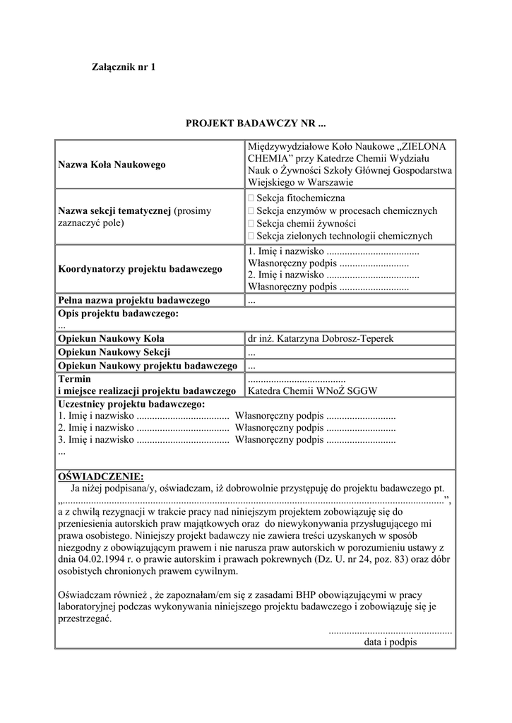 Załącznik nr 1 PROJEKT BADAWCZY NR ... Nazwa Koła Naukowego Nazwa sekcji tematycznej (prosimy zaznaczyć pole) Koordynatorzy projektu badawczego Międzywydziałowe Koło Naukowe „ZIELONA CHEMIA” przy Katedrze Chemii Wydziału Nauk o Żywności Szkoły Głównej Gospodarstwa Wiejskiego w Warszawie Sekcja fitochemiczna Sekcja enzymów w procesach chemicznych Sekcja chemii żywności Sekcja zielonych technologii chemicznych 1. Imię i nazwisko .................................... Własnoręczny podpis ........................... 2. Imię i nazwisko .................................... Własnoręczny podpis ........................... ... Pełna nazwa projektu badawczego Opis projektu badawczego: ... dr inż. Katarzyna Dobrosz-Teperek Opiekun Naukowy Koła ... Opiekun Naukowy Sekcji Opiekun Naukowy projektu badawczego ... ...................................... Termin i miejsce realizacji projektu badawczego Katedra Chemii WNoŻ SGGW Uczestnicy projektu badawczego: 1. Imię i nazwisko .................................... Własnoręczny podpis ........................... 2. Imię i nazwisko .................................... Własnoręczny podpis ........................... 3. Imię i nazwisko .................................... Własnoręczny podpis ........................... ... OŚWIADCZENIE: Ja niżej podpisana/y, oświadczam, iż dobrowolnie przystępuję do projektu badawczego pt. „....................................................................................................................................................”, a z chwilą rezygnacji w trakcie pracy nad niniejszym projektem zobowiązuję się do przeniesienia autorskich praw majątkowych oraz do niewykonywania przysługującego mi prawa osobistego. Niniejszy projekt badawczy nie zawiera treści uzyskanych w sposób niezgodny z obowiązującym prawem i nie narusza praw autorskich w porozumieniu ustawy z dnia 04.02.1994 r. o prawie autorskim i prawach pokrewnych (Dz. U. nr 24, poz. 83) oraz dóbr osobistych chronionych prawem cywilnym. Oświadczam również , że zapoznałam/em się z zasadami BHP obowiązującymi w pracy laboratoryjnej podczas wykonywania niniejszego projektu badawczego i zobowiązuję się je przestrzegać. ................................................ data i podpis