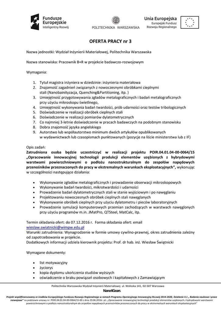 OFERTA PRACY nr 3 Nazwa jednostki: Wydział Inżynierii Materiałowej, Politechnika Warszawska Nazwa stanowiska: Pracownik B+R w projekcie badawczo-rozwojowym Wymagania: 1. Tytuł magistra inżyniera w dziedzinie: inżynieria materiałowa 2. Znajomośd zagadnieo związanych z nowoczesnymi obróbkami cieplnymi stali (Nanobainityzacja, Quenching&Partitioning, itp. ) 3. Umiejętnośd przygotowywania zgładów metalograficznych i badao metalograficznych przy użyciu mikroskopu świetlnego, 4. Umiejętnośd wykonywania badao twardości, prób udarności oraz testów tribologicznych 5. Doświadczenie w realizacji obróbek cieplnych stali 6. Doświadczenie w realizacji pomiarów dylatometrycznych 7. Co najmniej 3-letnie doświadczenie w pracach badawczych na podobnym stanowisku 8. Dobra znajomośd języka angielskiego 9. Autorstwo lub współautorstwo minimum dwóch artykułów opublikowanych w wydawnictwach lub czasopismach punktowanych (pozycje na liście ministerstwa lub z IF) Opis zadao: Zatrudniona osoba będzie uczestniczyd w realizacji projektu POIR.04.01.04-00-0064/15 „Opracowanie innowacyjnej technologii produkcji elementów uzębionych z hybrydowymi warstwami powierzchniowymi o podłożu nanostrukturalnym do zespołów napędowych przenośników przeznaczonych do pracy w ekstremalnych warunkach eksploatacyjnych”, wykonując w szczególności następujące działania: Wykonywanie zgładów metalograficznych i prowadzenie obserwacji mikroskopowych Wykonywanie badao twardości, mikrotwardości i udarności Prowadzenie badao dylatometrycznych stali w stanie wyjściowym i po nawęglaniu Projektowaniu nowoczesnych obróbek cieplnych stali nawęglanych Wykonywanie obróbek cieplnych przy użyciu dylatometru i pieców laboratoryjnych Prowadzenie symulacji komputerowych przemian zachodzących w warstwach nawęglonych przy użyciu programów m.in. JMatPro, QTSteel, MatCalc, itp. Termin składania ofert: do 07.12.2016 r. Forma składania ofert: email [email protected] Warunki zatrudnienia: Wynagrodzenie w formie umowy cywilno-prawnej, okres zatrudnienia zależny od zapotrzebowania w projekcie. Dodatkowych informacji udziela kierownik projektu: Prof. dr hab. inż. Wiesław Świątnicki Wymagane dokumenty: list motywacyjny życiorys kopia dyplomu ukooczenia studiów wyższych oświadczenie o braku powiązao osobowych i kapitałowych z Zamawiającym Politechnika Warszawska Wydział Inżynierii Materiałowej ul. Wołoska 141, 02-507 Warszawa Nano4Gears Projekt współfinansowany ze środków Europejskiego Funduszu Rozwoju Regionalnego w ramach Programu Operacyjnego Innowacyjny Ro zwój 2014-2020, Działanie 4.1 „ Badania naukowe i prace rozwojowe” na podstawie umowy nr: POIR.04.01.04-00-0064/15-00 z dnia 29.06.2016r. pt.:„Opracowanie innowacyjnej technologii produkcji elementów uzębionych z hybrydowymi warstwami powierzchniowymi o podłożu nanostrukturalnym do zespołów napędowych przenośników przeznaczonych do pracy w ekstremalnych warunkach eksploatacyjnych”