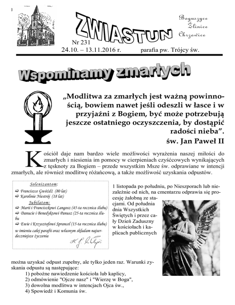 Ej Boguszyce Źlinice Chrzowice Nr 231 24.10. – 13.11.2016 r. parafia pw. Trójcy św. „Modlitwa za zmarłych jest ważną powinnością, bowiem nawet jeśli odeszli w łasce i w przyjaźni z Bogiem, być może potrzebują jeszcze ostatniego oczyszczenia, by dostąpić radości nieba”. św. Jan Paweł II K ościół daje nam bardzo wiele możliwości wyrażenia naszej miłości do zmarłych i niesienia im pomocy w cierpieniach czyśćcowych wynikających z tęsknoty za Bogiem – przede wszystkim Msze św. odprawiane w intencji zmarłych, ale również modlitwę różańcową, a także możliwość uzyskania odpustów. Sole nizant om: Franciszce Gwóźdź (80 lat) Karolinie Niestrój (18 lat) Jubilat om: Marii i Franciszkowi Langosz (45-ta rocznica ślubu) Danucie i Benedyktowi Panusz (25-ta rocznica ślubu Ewie i Krzysztofowi Sprancel (15-ta rocznica ślubu) w imieniu całej parafii oraz własnym składam najserdeczniejsze życzenia 1 listopada po południu, po Nieszporach lub niezależnie od nich, na cmentarzu odprawia się procesję żałobną ze stacjami. Od południa dnia Wszystkich Świętych i przez cały Dzień Zaduszny w kościołach i kaplicach publicznych można uzyskać odpust zupełny, ale tylko jeden raz. Warunki zyskania odpustu są następujące: 1) pobożne nawiedzenie kościoła lub kaplicy, 2) odmówienie "Ojcze nasz" i "Wierzę w Boga", 3) dowolna modlitwa w intencjach Ojca św., 4) Spowiedź i Komunia św. PORZĄDEK NABOŻEŃSTW 24.10. – 30.10.2016 r. Poniedziałek – 24.10.2016 r. 18.00 - 1. Za †† Pawła Twardoń i całe pokrew. 2. Do Bożej Opatrzności w int. Barbary i Bernarda Mróz oraz za †† rodziców z obu stron. Wtorek – 25.10.2016 r. 18.00 - Do Bożej Opatrzności w int. Ks. Proboszcza z okazji urodzin. Środa – 26.10.2016 r. 7.30 - 1. Do Bożej Opatrzności w int. rodz. Krzysztofa i Ewy Sprancel z okazji 15-tej rocznicy ślubu. 2. Za †† męża i ojca Józefa Malkusz, rodziców Jana i Marię Niespór, siostrę i braci oraz całe pokrew. Malkusz, Niespór. Czwartek – 27.10.2016 r. 18.00 - 1. Do Bożej Opatrzności w int. rodz. Ludwika Smandzik oraz za †† rodziców z obu stron 2. Do Bożej Opatrzności za żyjących i zmarłych z rodzin Panusz, Bias, Wocka i Piecha. Piątek – 28.10.2016 r. - św. Ap. Szymona i Judy Tadeusza 7.00 - Za parafian. Sobota – 29.10.2016 r. 7.00 - 1. Do Bożej Opatrzności w int. Karoliny Niestrój z okazji 18-tych urodzin. 2. Za †† Alfreda Golec w I rocznicę śmierci i jego żonę Hildegardę. 18.00 - Za †† męża i ojca Roberta Kutz, rodziców z obu stron, rodzeństwo i dusze opuszczone. Niedziela – 30.10.2016 r. 8.00 - Do Bożej Opatrzności w int. Natalii i Michała Żelazny i ich rodzin. 10.00 - Za †† ciocię Dorotę Mróz, matkę Monikę Błaszczyk i całe pokrew. -----------------------------------------------------------Proszę o posprzątanie kościoła rodziny: Dobis Norbert, Lazar Dorota, Kubiczek Rudolf, Kluczny Hubert, Niestrój Krzysztof. PORZĄDEK NABOŻEŃSTW 31.10 – 6.11.2016 r. Poniedziałek – 31.10.2016 r. 17.00 - Za †† syna Andrzeja Broy, rodz. Franciszka i Marię Broy, Stanisława i Agnieszkę Roskosz, ciotkę Klarę, brata Henryka i szwagra. Wtorek – 1.11.2016 r. - Uroczystość Wszystkich Świętych 8.00 - Za † Piotra Hennek w I rocznicę śmierci. 10.00 - Za †† rodz. Ernesta i Edeltraudę Fister, Teresę i Eugeniusza Stolarskich oraz całe pokrew. z obu stron oraz za †† rodz. Annę i Józefa Sowada ich rodziców Sowada i Kubiczek, siostry Klarę i Martę, brata Johana, szwagrów, szwagierki i zm. pokrew. Środa – 2.11.2016 r. - Dzień Zaduszny 7.30 - Za †† rodz. Agnieszkę i Karola Górek, ojca Konrada Wójcik, dziadków i całe pokrew. z obu stron. 17.00 - Za †† rodz. Franciszkę i Ryszarda Langosz, rodz. Augustynę i Alojzego Kornek, pokrew. Langosz. Czwartek – 3.11.2016 r. - I czwartek miesiąca 16.30 - Adoracja Najśw. Sakramentu. 17.00 - Za †† męża i ojca Huberta Sowada, rodziców Sowada i Polak, Bronisławę i Józefa Piechaczek, rodzeństwo i całe pokrew. Piątek – 4.11.2016 r. - I piątek miesiąca 7.00 - W int. Czcicieli Najświętszego Serca Pana Jezusa. 17.00 - Za †† męża i ojca Alfonsa Gielnik, siostrę Marię, rodz. Bronisławę i Józefa, rodz. Gertrudę i Stanisława Jaglo, cztery siostry, brata, pokrew. z obu stron. Sobota – 5.11.2016 r. - I sobota miesiąca 7.00 - Za †† ojca Hiacentego Krok i o zdrowie w rodzinie Krok i Chmurowskich. 17.00 - Za †† ojca i męża Józefa Socałę, Leszka Jabłońskiego, Mieczysława Kuzkę i Franciszka Keniga. Niedziela – 6.11.2016 r. – Kiermasz parafialny, (kolekta na Seminarium Duchowne) 8.00 - Dwujęzyczna. Za †† rodz. Franciszka i Łucję Tischbierek, Jana i Amalię Olsok, syna Gintra, Rozalię i Józefa Czura i całe pokrew. 10.00 - Do Bożej Opatrzności w int. budowniczych i dobrodziejów naszego kościoła. -----------------------------------------------------------Proszę o posprzątanie kościoła rodziny: Kaleta Bernard, Przeździng Gerard, Urbacka Alfred, Jasik Maria, Grund Jan. PORZĄDEK NABOŻEŃSTW 7.11. – 13.11.2016 r. Poniedziałek – 7.11.2016 r. 17.00 - 1. Do Bożej Opatrzności w int. rodz. Moj i Szyma. 2. Za †† Stefana Grund, rodziców, dwóch braci, Marię i Pawła Ochlast, dwie siostry, dwóch braci i całe pokrew. Wtorek – 8.11.2016 r. 17.00 - 1. Do MB Nieust. Pomocy w int. Franciszki Gwóźdź z okazji 80-tych urodzin. 2. Za †† męża i ojca Norberta Laza, teścia Józefa, rodziców Józefa i Jadwigę Chudala i całe pokrew. Chudala, Lazar i Mlocek. Środa – 9.11.2016 r. 7.30 - Za †† Annę, Gertrudę i Jana Czura, Martę i Karola Skrzipczyk i całe pokrew. Czwartek – 10.11.2016 r. 17.00 - 1. Za †† męża Jana Margos, rodziców Niepalla, Margos, siostrę Otylię, brata Franciszka, całe pokrew. i dusze w czyśćcu cierpiące. 2. Za †† Annę Kucia, Jana i Emilię Milek, szwagra Piotra, całe pokrew.