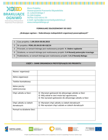 FORMULARZ ZGŁOSZENIOWY DO SIECI „Brakujące ogniwo – federalizacja małopolskich organizacji pozarządowych” ___________________________________________________________________________ 1 Czas projektu: 1.09.2014-30.06.2015 2 Nr projektu: POKL.05.04.02-00-I18/14 3 Priorytet, w ramach którego jest realizowany projekt: V. Dobre rządzenie 4 Działanie, w ramach którego jest realizowany projekt: 5.4 Rozwój potencjału trzeciego 5 Poddziałanie, w ramach którego jest realizowany projekt: 5.4.2 Rozwój dialogu sektora obywatelskiego CZĘŚĆ I - DANE ORGANIZACJI PRZYSTĘPUJĄCEJ DO PROJEKTU Nazwa organizacji: Adres organizacji: Telefon kontaktowy: Adres poczty elektronicznej: Chęć udziału w Sieci: Wyrażam gotowość do aktywnego udziału w Sieci Mój udział w sieci może być ograniczony Nie wyrażam gotowości do aktywnego udziału w Sieci Chęć udziału w ciałach doradczych: Wyrażam chęć udziału w ciałach doradczych Nie wyrażam chęci udziału w ciałach doradczych Pomysł na działanie Sieci: Proszę zaznaczyć dodatkowe formy wsparcia, w której organizacja chce uczestniczyć: Akademia współpracy Wizyty studyjne Szkolenia dotyczące współpracy NGO z JST Usługi prawne, marketingowe, coaching Regionalne Forum Inicjatyw Pozarządowych CZĘŚĆ II - DANE PERSONALNE OSOBY DOKONUJĄCEJ ZGŁOSZENIA Imię i nazwisko: Stanowisko: ………………………………………… (miejscowość, data) ………………………………………… (podpis)