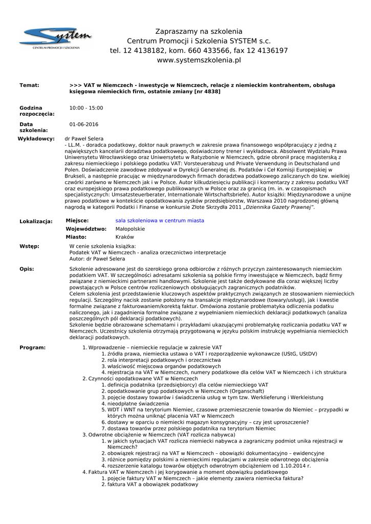 Zapraszamy na szkolenia Centrum Promocji i Szkolenia SYSTEM s.c. tel. 12 4138182, kom. 660 433566, fax 12 4136197 www.systemszkolenia.pl Temat: >>> VAT w Niemczech - inwestycje w Niemczech, relacje z niemieckim kontrahentem, obsługa księgowa niemieckich firm, ostatnie zmiany [nr 4838] Godzina rozpoczęcia: 10:00 - 15:00 Data szkolenia: 01-06-2016 Wykładowcy: Lokalizacja: dr drPaweł PawełSelera Selera - -LL.M. LL.M.- -doradca doradcapodatkowy, podatkowy,doktor doktornauk naukprawnych prawnychwwzakresie zakresieprawa prawafinansowego finansowegowspółpracujący współpracującyzzjedną jednązz największych największychkancelarii kancelariidoradztwa doradztwapodatkowego, podatkowego,doświadczony doświadczonytrener treneri iwykładowca. wykładowca.Absolwent AbsolwentWydziału WydziałuPrawa Prawa Uniwersytetu UniwersytetuWrocławskiego Wrocławskiegooraz orazUniwersytetu UniwersytetuwwRatyzbonie RatyzboniewwNiemczech, Niemczech,gdzie gdzieobronił obroniłpracę pracęmagisterską magisterskązz zakresu zakresuniemieckiego niemieckiegoi ipolskiego polskiegopodatku podatkuVAT: VAT:Vorsteuerabzug Vorsteuerabzugund undPrivate PrivateVerwendung VerwendungininDeutschaland Deutschalandund und Polen. Polen.Doświadczenie Doświadczeniezawodowe zawodowezdobywał zdobywałwwDyrekcji DyrekcjiGeneralnej Generalnejds. ds.Podatków Podatkówi iCeł CełKomisji KomisjiEuropejskiej Europejskiejww Brukseli, Brukseli,aanastępnie następniepracując pracującwwmiędzynarodowych międzynarodowychfirmach firmachdoradztwa doradztwapodatkowego podatkowegozaliczanych zaliczanychdo dotzw. tzw.wielkiej wielkiej czwórki czwórkizarówno zarównowwNiemczech Niemczechjak jaki iwwPolsce. Polsce.Autor Autorkilkudziesięciu kilkudziesięciupublikacji publikacjii ikomentarzy komentarzyzzzakresu zakresupodatku podatkuVAT VAT oraz orazeuropejskiego europejskiegoprawa prawapodatkowego podatkowegopublikowanych publikowanychwwPolsce Polsceoraz orazza zagranicą granicą(m. (m.in. in.wwczasopismach czasopismach specjalistycznych: specjalistycznych:Umsatzsteuerberater, Umsatzsteuerberater,Internationale InternationaleWirtschaftsbriefe). Wirtschaftsbriefe).Autor Autorksiążki: książki:Międzynarodowe Międzynarodoweaaunijne unijne prawo prawopodatkowe podatkowewwkontekście kontekścieopodatkowania opodatkowaniazysków zyskówprzedsiębiorstw, przedsiębiorstw,Warszawa Warszawa2010 2010nagrodzonej nagrodzonejgłówną główną nagrodą nagrodąwwkategorii kategoriiPodatki Podatkii iFinanse Finansewwkonkursie konkursieZłote ZłoteSkrzydła Skrzydła2011 2011„Dziennika „DziennikaGazety GazetyPrawnej”. Prawnej”. Miejsce: sala szkoleniowa ww centrum miasta Miejsce: sala szkoleniowa centrum miasta Województwo: Małopolskie Województwo: Małopolskie Miasto: Kraków Miasto: Kraków Wstęp: W cenie szkolenia książka: Podatek VAT w Niemczech - analiza orzecznictwo interpretacje Autor: dr Paweł Selera Opis: Szkolenie adresowane jest do szerokiego grona odbiorców z różnych przyczyn zainteresowanych niemieckim podatkiem VAT. W szczególności adresatami szkolenia są polskie firmy inwestujące w Niemczech, bądź firmy związane z niemieckimi partnerami handlowymi. Szkolenie jest także dedykowane dla coraz większej liczby powstających w Polsce centrów rozliczeniowych obsługujących zagranicznych podatników. Celem szkolenia jest przedstawienie kluczowych aspektów praktycznych związanych ze stosowaniem niemieckich regulacji. Szczególny nacisk zostanie położony na transakcje międzynarodowe (towary/usługi), jak i kwestie formalne związane z fakturowaniem/korektą faktur. Omówiona zostanie problematyka odliczenia podatku naliczonego, jak i zagadnienia formalne związane z wypełnianiem niemieckich deklaracji podatkowych (analiza poszczególnych pól deklaracji podatkowych). Szkolenie będzie obrazowane schematami i przykładami ukazującymi problematykę rozliczania podatku VAT w Niemczech. Uczestnicy szkolenia otrzymają przygotowaną w języku polskim instrukcję wypełniania niemieckich deklaracji podatkowych. Program: 1. Wprowadzenie – niemieckie regulacje w zakresie VAT 1. źródła prawa, niemiecka ustawa o VAT i rozporządzenie wykonawcze (UStG, UStDV) 2. rola interpretacji podatkowych i orzecznictwa 3. właściwość miejscowa organów podatkowych 4. rejestracja na VAT w Niemczech, numery podatkowe dla celów VAT w Niemczech i ich struktura 2. Czynności opodatkowane VAT w Niemczech 1. definicja podatnika (przedsiębiorcy) dla celów niemieckiego VAT 2. opodatkowanie grup podatkowych w Niemczech (Organschaft) 3. pojęcie dostawy towarów i świadczenia usług w tym tzw. Werklieferung i Werkleistung 4. nieodpłatne świadczenia 5. WDT i WNT na terytorium Niemiec, czasowe przemieszczenie towarów do Niemiec – przypadki w których można uniknąć płacenia VAT w Niemczech 6. dostawy w oparciu o niemiecki magazyn konsygnacyjny – czy jest uproszczenie? 7. dostawa towarów przez polskiego podatnika na terytorium Niemiec 3. Odwrotne obciążenie w Niemczech (VAT rozlicza nabywca) 1. w jakich sytuacjach VAT rozlicza niemiecki nabywca a zagraniczny podmiot unika rejestracji w Niemczech? 2. obowiązek rejestracji na VAT w Niemczech – obowiązki dokumentacyjno – ewidencyjne 3. różnice pomiędzy polskimi a niemieckimi regulacjami w zakresie odwrotnego obciążenia 4. rozszerzenie katalogu towarów objętych odwrotnym obciążeniem od 1.10.2014 r. 4. Faktura VAT w Niemczech i jej korygowanie a moment obowiązku podatkowego 1. pojęcie faktury VAT w Niemczech – jakie elementy zawiera niemiecka faktura? 2. faktura VAT a obowiązek podatkowy 3. korygowanie błędnej transakcji w Niemczech – specyfika niemieckiej dokumentacji 4. korygowanie podstawy opodatkowania przy transakcjach wewnątrzwspólnotowych 5. refakturowanie usług w Niemczech 6. samofakturowanie (selfbillinw Niemczech - Gutschrift 7. korygowanie nienależnie/niewłaściwie wykazanego podatku – zmiany 2015/2016 5. Stawki po