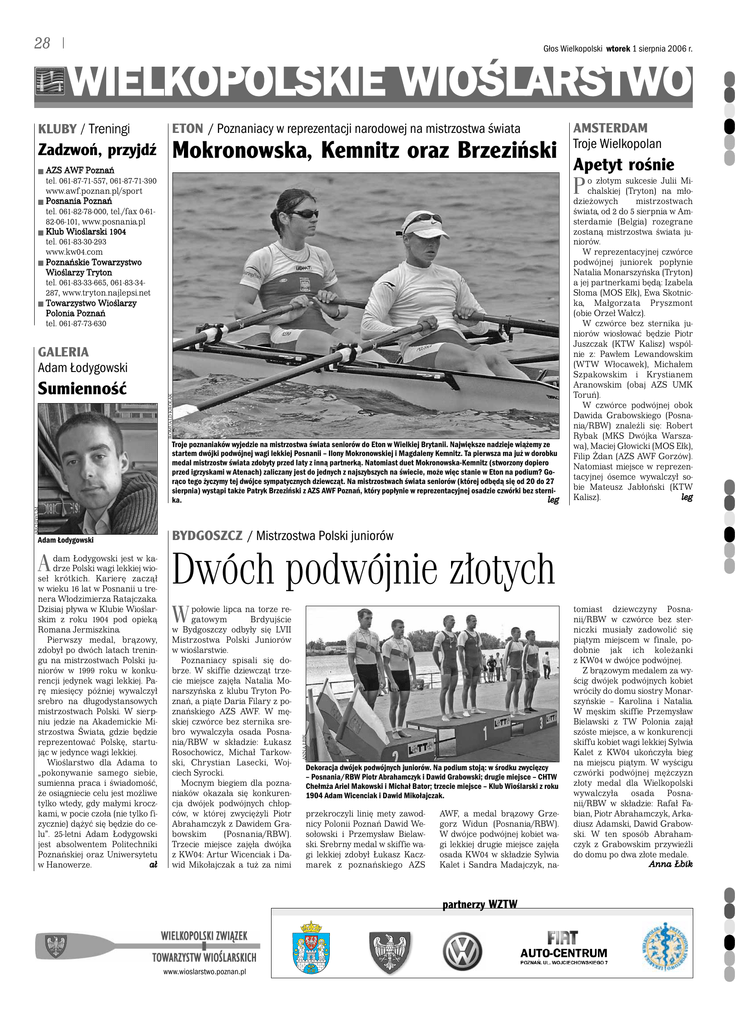 28 Głos Wielkopolski wtorek 1 sierpnia 2006 r. WIELKOPOLSKIE WIOSLARSTWO KLUBY / Treningi ETON / Poznaniacy w reprezentacji narodowej na mistrzostwa świata Zadzwoń, przyjdź Mokronowska, Kemnitz oraz Brzeziński AZS AWF Poznań tel. 061-87-71-557, 061-87-71-390 www.awf.poznan.pl/sport n Posnania Poznań tel. 061-82-78-000, tel./fax 0-6182-06-101, www.posnania.pl n Klub Wioślarski 1904 tel. 061-83-30-293 www.kw04.com n Poznańskie Towarzystwo Wioślarzy Tryton tel. 061-83-33-665, 061-83-34287, www.tryton.najlepsi.net n Towarzystwo Wioślarzy Polonia Poznań tel. 061-87-73-630 n A dam Łodygowski jest w kadrze Polski wagi lekkiej wioseł krótkich. Karierę zaczął w wieku 16 lat w Posnanii u trenera Włodzimierza Ratajczaka. Dzisiaj pływa w Klubie Wioślarskim z roku 1904 pod opieką Romana Jermiszkina. Pierwszy medal, brązowy, zdobył po dwóch latach treningu na mistrzostwach Polski juniorów w 1999 roku w konkurencji jedynek wagi lekkiej. Parę miesięcy później wywalczył srebro na długodystansowych mistrzostwach Polski. W sierpniu jedzie na Akademickie Mistrzostwa Świata, gdzie będzie reprezentować Polskę, startując w jedynce wagi lekkiej. Wioślarstwo dla Adama to „pokonywanie samego siebie, sumienna praca i świadomość, że osiągniecie celu jest możliwe tylko wtedy, gdy małymi kroczkami, w pocie czoła (nie tylko fizycznie) dążyć się będzie do celu”. 25-letni Adam Łodygowski jest absolwentem Politechniki Poznańskiej oraz Uniwersytetu ał w Hanowerze. ROMUALD KRÓLAK o złotym sukcesie Julii Michalskiej (Tryton) na młodzieżowych mistrzostwach świata, od 2 do 5 sierpnia w Amsterdamie (Belgia) rozegrane zostaną mistrzostwa świata juniorów. W reprezentacyjnej czwórce podwójnej juniorek popłynie Natalia Monarszyńska (Tryton) a jej partnerkami będą: Izabela Słoma (MOS Ełk), Ewa Skotnicka, Małgorzata Pryszmont (obie Orzeł Wałcz). W czwórce bez sternika juniorów wiosłować będzie Piotr Juszczak (KTW Kalisz) wspólnie z: Pawłem Lewandowskim (WTW Włocawek), Michałem Szpakowskim i Krystianem Aranowskim (obaj AZS UMK Toruń). W czwórce podwójnej obok Dawida Grabowskiego (Posnania/RBW) znaleźli się: Robert Rybak (MKS Dwójka Warszawa), Maciej Głowicki (MOS Ełk), Filip Żdan (AZS AWF Gorzów). Natomiast miejsce w reprezentacyjnej ósemce wywalczył sobie Mateusz Jabłoński (KTW leg Kalisz). BYDGOSZCZ / Mistrzostwa Polski juniorów Dwóch podwójnie złotych W połowie lipca na torze regatowym Brdyujście w Bydgoszczy odbyły się LVII Mistrzostwa Polski Juniorów w wioślarstwie. Poznaniacy spisali się dobrze. W skiffie dziewcząt trzecie miejsce zajęła Natalia Monarszyńska z klubu Tryton Poznań, a piąte Daria Filary z poznańskiego AZS AWF. W męskiej czwórce bez sternika srebro wywalczyła osada Posnania/RBW w składzie: Łukasz Rosochowicz, Michał Tarkowski, Chrystian Lasecki, Wojciech Syrocki. Mocnym biegiem dla poznaniaków okazała się konkurencja dwójek podwójnych chłopców, w której zwyciężyli Piotr Abrahamczyk z Dawidem Grabowskim (Posnania/RBW). Trzecie miejsce zajęła dwójka z KW04: Artur Wicenciak i Dawid Mikołajczak a tuż za nimi ANNA ŁBIK ARCHIWUM Troje poznaniaków wyjedzie na mistrzostwa świata seniorów do Eton w Wielkiej Brytanii. Największe nadzieje wiążemy ze startem dwójki podwójnej wagi lekkiej Posnanii – Ilony Mokronowskiej i Magdaleny Kemnitz. Ta pierwsza ma już w dorobku medal mistrzostw świata zdobyty przed laty z inną partnerką. Natomiast duet Mokronowska-Kemnitz (stworzony dopiero przed igrzyskami w Atenach) zaliczany jest do jednych z najszybszych na świecie, może więc stanie w Eton na podium? Gorąco tego życzymy tej dwójce sympatycznych dziewcząt. Na mistrzostwach świata seniorów (której odbędą się od 20 do 27 sierpnia) wystąpi także Patryk Brzeziński z AZS AWF Poznań, który popłynie w reprezentacyjnej osadzie czwórki bez sternileg ka. Adam Łodygowski Apetyt rośnie P GALERIA Adam Łodygowski Sumienność AMSTERDAM Troje Wielkopolan Dekoracja dwójek podwójnych juniorów. Na podium stoją: w środku zwycięzcy – Posnania/RBW Piotr Abrahamczyk i Dawid Grabowski; drugie miejsce – CHTW Chełmża Ariel Makowski i Michał Bator; trzecie miejsce – Klub Wioślarski z roku 1904 Adam Wicenciak i Dawid Mikołajczak. przekroczyli linię mety zawodnicy Polonii Poznań Dawid Wesołowski i Przemysław Bielawski. Srebrny medal w skiffie wagi lekkiej zdobył Łukasz Kaczmarek z poznańskiego AZS AWF, a medal brązowy Grzegorz Widun (Posnania/RBW). W dwójce podwójnej kobiet wagi lekkiej drugie miejsce zajęła osada KW04 w składzie Sylwia Kalet i Sandra Madajczyk, na- partnerzy WZTW www.wioslarstwo.poznan.pl tomiast dziewczyny Posnanii/RBW w czwórce bez sterniczki musiały zadowolić się piątym miejscem w finale, podobnie jak ich koleżanki z KW04 w dwójce podwójnej. Z brązowym medalem za wyścig dwójek podwójnych kobiet wróciły do domu siostry Monarszyńskie – Karolina i Natalia. W męskim skiffie Przemysław Bielawski z TW Polonia zajął szóste miejsce, a w konkurencji skiffu kobiet wagi lekkiej Sylwia Kalet z KW04 ukończyła bieg na miejscu piątym. W wyścigu czwórki podwójnej mężczyzn złoty medal dla Wielkopolski wywalczyła osada Posnanii/RBW w składzie: Rafał Fabian, Piotr Abrahamczyk, Arkadiusz Adamski, Dawid Grabowski. W ten sposób Abrahamczyk z Grabowskim przywieźli do domu po dwa złote medale. Anna Łbik