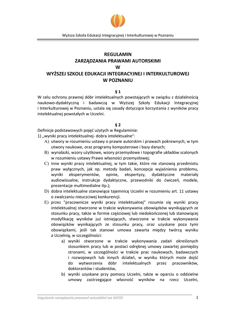 Wyższa Szkoła Edukacji Integracyjnej i Interkulturowej w Poznaniu REGULAMIN ZARZĄDZANIA PRAWAMI AUTORSKIMI W WYŻSZEJ SZKOLE EDUKACJI INTEGRACYJNEJ I INTERKULTUROWEJ W POZNANIU §1 W celu ochrony prawnej dóbr intelektualnych powstających w związku z działalnością naukowo-dydaktyczną i badawczą w Wyższej Szkoły Edukacji Integracyjnej i Interkulturowej w Poznaniu, ustala się zasady dotyczące korzystania z wyników pracy intelektualnej powstałych w Uczelni. §2 Definicje podstawowych pojęć użytych w Regulaminie: 1) „wyniki pracy intelektualnej- dobra intelektualne”: A) utwory w rozumieniu ustawy o prawie autorskim i prawach pokrewnych, w tym utwory naukowe, oraz programy komputerowe i bazy danych; B) wynalazki, wzory użytkowe, wzory przemysłowe i topografie układów scalonych w rozumieniu ustawy Prawo własności przemysłowej; C) inne wyniki pracy intelektualnej, w tym takie, które nie stanowią przedmiotu praw wyłącznych, jak np. metody badań, koncepcje wyjaśnienia problemu, wyniki eksperymentów, opinie, ekspertyzy, dydaktyczne materiały audiowizualne, instrukcje dydaktyczne, przewodniki do ćwiczeń, modele, prezentacje multimedialne itp.); D) dobra intelektualne stanowiące tajemnicę Uczelni w rozumieniu art. 11 ustawy o zwalczaniu nieuczciwej konkurencji. E) przez "pracownicze wyniki pracy intelektualnej" rozumie się wyniki pracy intelektualnej stworzone w trakcie wykonywania obowiązków wynikających ze stosunku pracy, także w formie częściowej lub niedokończonej lub stanowiącej modyfikację wyników już istniejących, stworzone w trakcie wykonywania obowiązków wynikających ze stosunku pracy, oraz uzyskane poza tymi obowiązkami, jeśli tak stanowi umowa zawarta między twórcą wyniku a Uczelnią, w szczególności: a) wyniki stworzone w trakcie wykonywania zadań określonych stosunkiem pracy lub w postaci odrębnej umowy zawartej pomiędzy stronami, w szczególności w trakcie prac naukowych, badawczych i rozwojowych lub innych działań, w wyniku których może dojść do wytworzenia dóbr intelektualnych przez pracowników, doktorantów i studentów, b) wyniki uzyskane przy pomocy Uczelni, także w oparciu o oddzielne umowy zastrzegające własność wyników na rzecz Uczelni, 1 Wyższa Szkoła Edukacji Integracyjnej i Interkulturowej w Poznaniu lub finansowane ze środków publicznych w szczególności ministra do spraw nauki i szkolnictwa wyższego, c) stworzone poza stosunkiem pracy, do których prawa majątkowe ich twórcy przekazali Uczelni do korzystania w formie umowy cywilnoprawnej albo w postaci jednostronnego oświadczenia woli, 2) „wyniki uzyskane przy pomocy Uczelni” - wyniki finansowane częściowo ze środków Uczelni, a także nie finansowane przez Uczelnię, jeżeli dla ich uzyskania Uczelnia przygotowała warunki organizacyjne, techniczne, materiałowe i inne, bez których nie doszłoby do powstania wyniku oraz jeżeli została zawarta odrębna umowa, 3) „niepracownicze wyniki pracy intelektualnej” - wyniki pracy intelektualnej powstałe w innych warunkach niż określone w pkt 1-2, 4) „Uczelnia” - Wyższa Szkoła Edukacji Integracyjnej i Interkulturowej w Poznaniu. 5) „Jednostka macierzysta” – jednostka, w której zatrudniony jest Twórca. 6) „Pracownik” – osoba pozostającą w stosunku pracy z Uczelnią, również na podstawie mianowania. 7) „Twórca” – osoba, która stworzyła Dobro intelektualne. 8) „Sponsor” – osoba lub organizacja zewnętrzna w stosunku do Uczelni,wspierająca działalność Pracowników wykonywaną w ramach zatrudnienia w Uniwersytecie, w szczególności przez dostarczenie środków finansowych na badanialub inne działania mogące skutkować powstaniem Dóbr intelektualnych. §3 1. Postanowienia Regulaminu stosuje się do: 1) pracowników Uczelni, których zakres obowiązków w całości lub w części polega na świadczeniu pracy o charakterze intelektualnym, 2) pracowników Uczelni, którzy stworzyli dobra intelektualne poza zakresem obowiązków wynikających ze stosunku pracy, jeśli wyraźnie zostało tak postanowione w odrębnej umowie zawartej między Uczelnią a pracownikiem, 3) pozostałych pracowników, jeżeli wynika to z umów zawartych między nimi a Uczelnią, 4) studentów oraz doktorantów niepozostających z Uczelnią w stosunku pracy, jeżeli wynika to z umowy zawartej między Uczelnią a studentem lub doktorantem, 5) innych osób niepozostających z Uczelnią w stosunku pracy, jeżeli stanowi tak umowa zawarta między Uczelnią, a taką osobą. 2. Postanowienia niniejszego Regulaminu, dotyczące twórców wyników prac intelektualnych mają także odpowiednie zastosowanie do współtwórców. Współtwórcy wyniku obowiązani są do uzgadniania swego stanowiska w sprawach ich dotyczących i wyznaczania pełnomocnika do reprezentowania ich interesów wobec Uczelni. 2 Wyższa Szkoła Edukacji Integracyjnej i Interkulturowej w Poznaniu §4 1. Dobra intelektualne będą uznawane za stworzone w konsekwencji wykonywania obowiązków wynikających ze stosunku pracy, jeżeli: a) zostają stworzone przez osobę pozostającą z Uczelnią w stosunku pracy i w czasie trwania tego stosunku, b) zakres obowiązków Pracownika obejmuje działania, w wyniku których może dojść do stworzenia Dóbr intelektualnych, c) dobro intelektualne zostaje stworzone w związku z wykonywaniem tych obowiązków. 2. Uznaniu Dobra intelektualnego za stworzone w wyniku wykonywania obowiązków pracowniczych nie stoi na przeszkodzie stworzenie tego dobra w czasie trwania stypendium naukowego, grantu uczelnianego lub urlopu naukowego. 3. Umowy o pracę zawarte z pracownikami Uczelni winny zawierać postanowienie, zgodnie z którym pracownik oświadcza, żezna i akceptuje treść zasad określonych w niniejszym Regulaminie, a ich przestrzeganie należy do obowiązków pracowniczych. 4. Dobra intelektualne powstałe w warunkach określonych wyżej w ust. 1 i 2 pozostają wła