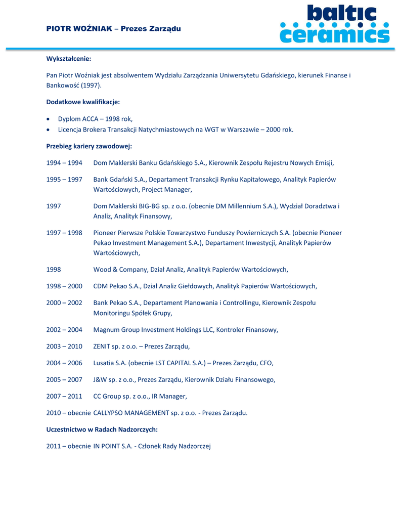 PIOTR WOŹNIAK – Prezes Zarządu Wykształcenie: Pan Piotr Woźniak jest absolwentem Wydziału Zarządzania Uniwersytetu Gdańskiego, kierunek Finanse i Bankowość (1997). Dodatkowe kwalifikacje: Dyplom ACCA – 1998 rok, Licencja Brokera Transakcji Natychmiastowych na WGT w Warszawie – 2000 rok. Przebieg kariery zawodowej: 1994 – 1994 Dom Maklerski Banku Gdańskiego S.A., Kierownik Zespołu Rejestru Nowych Emisji, 1995 – 1997 Bank Gdański S.A., Departament Transakcji Rynku Kapitałowego, Analityk Papierów Wartościowych, Project Manager, 1997 Dom Maklerski BIG-BG sp. z o.o. (obecnie DM Millennium S.A.), Wydział Doradztwa i Analiz, Analityk Finansowy, 1997 – 1998 Pioneer Pierwsze Polskie Towarzystwo Funduszy Powierniczych S.A. (obecnie Pioneer Pekao Investment Management S.A.), Departament Inwestycji, Analityk Papierów Wartościowych, 1998 Wood & Company, Dział Analiz, Analityk Papierów Wartościowych, 1998 – 2000 CDM Pekao S.A., Dział Analiz Giełdowych, Analityk Papierów Wartościowych, 2000 – 2002 Bank Pekao S.A., Departament Planowania i Controllingu, Kierownik Zespołu Monitoringu Spółek Grupy, 2002 – 2004 Magnum Group Investment Holdings LLC, Kontroler Finansowy, 2003 – 2010 ZENIT sp. z o.o. – Prezes Zarządu, 2004 – 2006 Lusatia S.A. (obecnie LST CAPITAL S.A.) – Prezes Zarządu, CFO, 2005 – 2007 J&W sp. z o.o., Prezes Zarządu, Kierownik Działu Finansowego, 2007 – 2011 CC Group sp. z o.o., IR Manager, 2010 – obecnie CALLYPSO MANAGEMENT sp. z o.o. - Prezes Zarządu. Uczestnictwo w Radach Nadzorczych: 2011 – obecnie IN POINT S.A. - Członek Rady Nadzorczej PIOTR WOŹNIAK – Prezes Zarządu 2011 – obecnie LZMO S.A. - Członek Rady Nadzorczej 2011 – obecnie HOME CERAMICS S.A. - Członek Rady Nadzorczej 2011 – obecnie INDUSTRY TECHNOLOGIES S.A. - Członek Rady Nadzorczej 2011 – obecnie SUNSHINE GARDEN S.A. - Członek Rady Nadzorczej