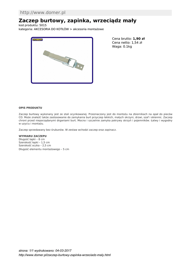 http://www.domer.pl Zaczep burtowy, zapinka, wrzeciądz mały kod produktu: 5015 kategoria: AKCESORIA DO KOTŁÓW > akcesoria montażowe Cena brutto: 1,90 zł Cena netto: 1,54 zł Waga: 0.1kg OPIS PRODUKTU Zaczep burtowy wykonany jest ze stali ocynkowanej. Przeznaczony jest do montożu na zbiornikach na opał do pieców CO. Może znaleźć także zastosowanie do zamykania burt przyczep lekkich, małych skrzyni, drzwi, szaf i okiennic. Zaczep chroni przed nieporządanymi drganiami burt. Mocno i szczelnie zamyka pokrywy skrzyń i pojemników. Łatwy i wygodny w uzyciu i montażu. Zaczep sprzedawany bez śrubunów. W zestaw wchodzi zaczep oraz zapinacz. WYMIARU ZACZEPU Długość łapki – 8 cm Szerokość łapki – 1,5 cm Szerokość oczka – 2,5 cm Długość elementu montażowego – 5 cm strona: 1/1 wydrukowano: 04-03-2017 http://www.domer.pl/zaczep-burtowy-zapinka-wrzeciadz-maly.html