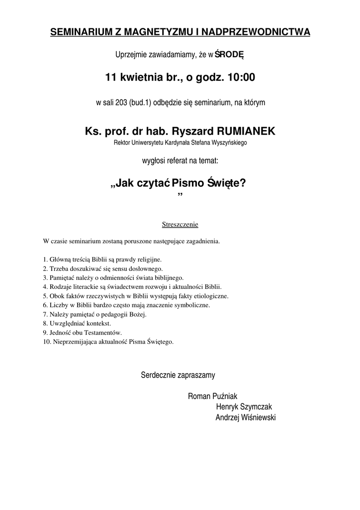 SEMINARIUM Z MAGNETYZMU I NADPRZEWODNICTWA Uprzejmie zawiadamiamy, że w ŚRODĘ 11 kwietnia br., o godz. 10:00 w sali 203 (bud.1) odbędzie się seminarium, na którym Ks. prof. dr hab. Ryszard RUMIANEK Rektor Uniwersytetu Kardynała Stefana Wyszyńskiego wygłosi referat na temat: „Jak czytać Pismo Święte? ” Streszczenie W czasie seminarium zostaną poruszone następujące zagadnienia. 1. Główną treścią Biblii są prawdy religijne. 2. Trzeba doszukiwać się sensu dosłownego. 3. Pamiętać należy o odmienności świata biblijnego. 4. Rodzaje literackie są świadectwem rozwoju i aktualności Biblii. 5. Obok faktów rzeczywistych w Biblii występują fakty etiologiczne. 6. Liczby w Biblii bardzo często mają znaczenie symboliczne. 7. Należy pamiętać o pedagogii Bożej. 8. Uwzględniać kontekst. 9. Jedność obu Testamentów. 10. Nieprzemijająca aktualność Pisma Świętego. Serdecznie zapraszamy Roman Puźniak Henryk Szymczak Andrzej Wiśniewski