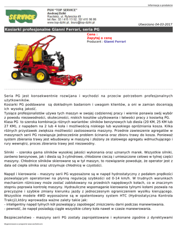 Informacje o produkcie Utworzono 04-03-2017 Kosiarki profesjonalne Gianni Ferrari, seria PG Cena : Zapytaj o cenę Producent : Gianni Ferrari Seria PG jest konsekwentnie rozwijana i wychodzi na przeciw potrzebom profesjonalnych użytkowników. Kosiarki PG poddawane są dokładnym badaniom i uwagom klientów, a oni w zamian doceniają ich wysoką jakość. Tysiące profesjonalistów używa tych maszyn w swojej codziennej pracy i wiernie ponawia swój wybór z powodu niezawodności, skuteczności, niskich kosztów użytkowania i łatwości pracy z kosiarką PG. Klasa PG to szeroka kombinacja różnych wariantów: silników benzynowych lub diesla (20 KM, 25 KM lub 27 KM), z napędem na 2 lub 4 koła i możliwością niskiego lub wysokiego opróżniania kosza. Kilka różnych przystawek zwiększa możliwości zastosowania maszyny. Przednie zawieszenie agregatów w maszynach serii PG rozwiązuje jednocześnie problem ścinania oraz zbioru trawy do kosza. Ponieważ system zbierania trawy jest wbudowany w maszynę i złożony ze stalowego agregatu wdmuchującego i rury wewnątrz, proces zbierania trawy jest niezawodny. Silniki - szeroka gama silników wysokiej jakości wykonania oraz uznanych marek. Wszystkie silniki, zarówno benzynowe, jak i diesla są 3-cylindrowe, chłodzone cieczą i umieszczone celowo w tylnej części maszyny. Chłodnice silników skierowane są w tył maszyn, to rozwiązanie powoduje, że operator jest z dala od ciepła silnika oraz utrzymuje chłodnicę w czystości. Napęd i kierowanie - maszyny serii PG wyposażone są w napęd hydrostatyczny z pedałem prędkości pozwalającym operatorowi na płynną regulację szybkości od 0-14 km/h. W trudnych warunkach mechanizm różnicowy może zostać zablokowany na przednich napędowych kołach, co w znacznym stopniu poprawia kontrolę maszyny. Hydrauliczne wspomaganie kierowania tylnymi kołami pozwala na precyzyjne i szybkie zmiany kierunku jazdy z jednoczesnym ograniczeniem wysiłku kierującego. Wszystkie modele 4WD wyposażone są w opatentowany system HTC (Hydrostatyczna Kontrola Trakcji),który wprowadza ważne zalety takie jak: - inteligentny napęd tylnych kół pozwalający zapobiegać zniszczeniu darni podczas manewrowania. - pewność, że napęd posiadają ciągle wszystkie cztery koła nawet w czasie manewrowania. Bezpieczeństwo - maszyny serii PG zostały zaprojektowane i wykonane zgodnie z dyrektywami Wygenerowano w programie www.oscGold.com bezpieczeństwa Unii Europejskiej i innymi Międzynarodowymi Standardami. Wszystkie maszyny PG mogą być wyposażone w kabiny co daje pewność bezpieczeństwa operatorowi nawet w przypadku przewrócenia maszyny. Kabina ROPS przeszła wszystkie testy wymagane przez standard OECD i jest certyfikowana przez Uniwersytet w Bolonii. Kabina wyposażona jest i chroniona przez materiał odporny na deszcz i słońce. Duże przednie światła pozwalają na bezpieczną pracę również w warunkach ograniczonej widoczności. Dopuszczenie do ruchu drogowego - 4-kołowe modele PG z silnikiem Diesla wyposażone są w zestaw do jazdy po drogach publicznych (przednie i tylne światła, kierunkowskazy, lampa ostrzegawcza, klakson) i mogą być używane na drogach. Siedzenie operatora - panel kontrolny i deska rozdzielcza jest zlokalizowana naprzeciw operatora w jego bezpośredniej bliskości. Ergonomiczne rozwiązania dostarczają łatwości użytkowania i pełnej kontroli nad kosiarką. Elektroniczne wyświetlacze dostarczają pełnej informacji o maszynie (licznik motogodzin, temp. wody cieczy, poziom paliwa itp.) system diagnostyczny wskazuje ewentualne problemy z maszyną. Cięcie - wszystkie opcje agregatów tnących i przystawek montowane są z przodu, co pozwala na cięcie przed przygniecieniem trawy, zwiększając jakość pracy i dając lepszą widoczność operatorowi. To rozwiązanie pozwala kośić bardzo wysoką trawęoraz sprawnie wykaszać wokół drzew i murów. Agregat tnący wyposażony jest w system wirujących dysków z podwójnymi (góra i dół) nożami osadzonymi przegubowo (przegubowe noże pochłaniają energię uderzenia i pomagają chronić układ napędu przed zderzenie - m z kamieniami czy gruzem pozostawionym na chodniku, a podwójne noże przeciwdziałają osadzaniu się trawy w górnej części agregatu dając pewność jakości koszenia oraz redukując czas potrzebny do obsługo i czyszczenia agregatu. Pojemnik - duży 600 litrowy kosz jest wykonany z bardzo mocnego odpornego na uderzenia tworzywa. Wyposażony w filtr i przegrodę oraz sygnał dżwiękowy pełnego napełnienia. Przeciwuderzeniowa zewnętrzna rama wykonana jest z ze stalowej rury i chroni pojemnik przed otarciem lub zderzeniem z przeszkodą. Podnośnik pojemnika - 4 kołowe modele PG mogą być wyposażone w podnośnik mkosza. Dzięki hudraulicznym siłownikom równoległowodowym, kosz może być podniesiony do wysokości 1,90 m i opróżniony bezpośrednio do przyczepy. kosz może być opróżniony również bez konieczności podnoszenia. Opcje: ● ● ● ● ● ● ● ● ● ● ● agregat zbierający 112 SA zestaw mielący do agregatu 112 agregat zbierający 126 SA zestaw mielący do agregatu 126 agregat zbierający 130 RCA 2 dyski z podwójnymi nożami. agregat zbierający 150 RCA 2 dyski z podwójnymi nożami. agregat z tylnym wyrzutem 130 cm z zestawem do mielenia. agregat z tylnym wyrzutem 150 cm SM. agregat mielący i boczny wyrzut 150 cm SM. agregat zbierający 130 RCA. verti-cut areator 100 cm. Informacje o produkcie ● ● ● ● ● ● ● ● ● ● ● ● ● ● ● ● ● zestaw zbierający do areatora 100 cm. agregat bijakowy 110 cm agregat bijakowy 130 cm. walcowa szczotka obrotowa 45 cm śr., 140 cm szer. rob. napęd hydrauliczny, płynna regulacja obrotów, sterowanie hydrauliczne zamiatarka do czyszczenia sztucznej trawy bez wypełnienia 100 cm, z zestawem filtrującym zamiatarko-odkurzacz do czyszczenia i obsługi nawierzchni ze sztuczną trawą wypełnio