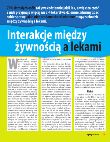 70% dorosłych osób zażywa codziennie jakiś lek, a większa część z nich przyjmuje więcej niż 3-4 lekarstwa dziennie. Musimy zdać sobie sprawę jakie niepożądane skutki uboczne mogą zachodzić między żywnością a lekami. Interakcje między żywnością a lekami W dzisiejszych czasach, kiedy rozwój medycyny i farmakologii stoi na wysokim poziomie, a zażywanie różnorodnych leków przez ludzi rośnie gwałtownie, musimy zdawać sobie sprawę, jakie niepożądane skutki uboczne mogą zachodzić pomiędzy żywnością a przyjmowanymi lekami. W badaniach przeprowadzonych na populacji w Stanach Zjednoczonych oszacowano, że 70% dorosłych osób zażywa codziennie jakiś lek, a większa część z nich przyjmuje więcej niż 3-4 lekarstwa dziennie. Należy podkreślić, że prawie każdy lek może przynosić działania niepożądane i prowadzić do powikłań, a ryzyko związane z interakcjami pomiędzy lekami wzrasta proporcjonalnie z ilością przyjmowanych farmaceutyków. Jeżeli chory przyjmuje więcej niż cztery leki dziennie to interakcja pomiędzy nimi jest praktycznie nieunikniona. Szacuje się, że 3-5% przyjęć do szpitali jest wynikiem poważnych interakcji lekowych. W dzisiejszym artykule postaram się naświetlić Państwu ważny problem związany z interakcją między żywnością a lekami, oraz co robić, aby zapobiegać powikłaniom związanym z niewłaściwym łączeniem pokarmów i leków. Do czynników, które mają decydujący wpływ na to czy jesteśmy bardziej lub mniej narażeni na niekorzystne działania farmakoterapii możemy zaliczyć: wiek, płeć, spożywane alkoholu, dietę, niewydolność narządów odpowiedzialnych za metabolizm leków tj. wątroba, nerki, odwodnienie organizmu oraz dawkę leku. Składniki pokarmowe dostarczane do naszego organizmu z dietą mogą powodować różnego rodzaju interakcje, tj. brak lub zmniejszenie efektów terapeutycznych leku, polegające na obniżeniu jego wchłaniania, bądź też wystąpienie niebezpiecznych powikłań, takich jak: zaburzenia przewodzenia i rytmu serca oraz nagły wzrost ciśnienia tętniczego krwi, spowodowany zwiększeniem wchłaniania leku. Prawie każdy składnik pożywienia (a jest ich ok. 60) może oddziaływać na procesy farmakokinetyczne, tj. uwalnianie leku z tabletek, dystrybucję, wydalanie, a także przemiany biochemiczne w wątrobie czy w jelitach. Do częstych interakcji dochodzi gdy lek spożywany jest w trakcie jedzenia, w okresie 1,5 godziny przed posiłkiem oraz w ciągu 2 godzin od jego spożycia. W zależności czy posiłek był bogaty w węglowodany czy w tłuszcze możemy mieć do czynienia ze zwiększonym bądź obniżonym działaniem leku. Posiłki obfitujące w tłuszcze mogą przyspieszać i zwiększać wchłanianie wielu leków, narażając pacjentów na ryzyko wystąpienia objawów niepożądanych. Z kolei posiłki zawierające dużo węglowodanów mogą w wielu przypadkach opóźnić lub zmniejszyć wchłanianie leku, co z kolei prowadzi do obniżenia lub braku efektów terapeutycznych. Alkohol Alkohol zawarty w używkach, tj: wina, piwa, wódki, likiery itp. może wchodzić w niekorzystne reakcje z wieloma lekami. Bezwzględny zakaz spożywania alkoholu musi być przestrzegany w przypadku przyjmowania antybiotyków oraz leków o działaniu uspokajającym. Również częste spożywanie alkoholu może prowadzić do interakcji z lekami powszechnie zażywanymi i dostępnymi, takimi jak preparat przeciwbólowe, przeciwgorączkowe, zawierające paracetamol. Ponieważ alkohol jest bardzo szybko wchłaniany do krwiobiegu w przypadku niektórych preparatów, może dochodzić do wzmacniania ich działania, a niektórych obniżenia działania. Nawet niewielka jednorazowa dawka alkoholu może hamować przemiany metaboliczne leku. Sytuacja taka ma miejsce w przypadku, kiedy enzymy potrzebne do przemian metabolicznych leku są blokowane przez alkohol. Dochodzi wtedy do wydłużenia czasu przemian leku i zwiększenia jego stężenia we krwi, co jest bezpośrednio związane z wystąpieniem skutków ubocznych. W przypadku kiedy osoba spożywa alkohol regularnie, mamy do czynienia z odwrotnym procesem. U takiej osoby może wówczas dochodzić do zwiększenia aktywności enzymów metabolizujących leki i związanym z tym osłabionym jego działaniem. Dla tego osoba pijąca alkohol regularnie może potrzebować zwiększonych dawek leku. Również niektóre farmaceutyki oddziałują na metabolizm i wydalanie alkoholu. Częstym spotykanym efektem ubocznym jest wzmocnienie działania alkoholu przez lek i tym samym toksyczne i długotrwałe jego oddziaływanie na organizm. Tłuszcze Istotny wpływ na zwiększone wchłanianie niektórych leków ma obecność tłuszczu w diecie. Do częstych interakcji dochodzi wówczas gdy lek zażywany jest w trakcie jedzenia tłustych potraw, tj.: smażone jajka, bekon, duża ilość masła, smalec, pełnotłuste mleko oraz w czasie krótszym niż 1 godzina przed lub 2 godziny po posiłku. Tłuszcze zawarte w posiłku nasilają i przyspieszają wchłanianie leków bardzo dobrze rozpuszczalnych w tłuszczach. Powstałe z kwasami żółciowymi emulsje tłuszczowe są bardzo dobrym nośnikiem dla leku i przez to przyśpieszają i zwiększają znacznie jego wchłanianie. Do leków z którymi może dochodzić do najczęstszych interakcji zaliczmy m in.: - leki przeciwgrzybicze (gryzeofulwina); - leki psychotropowe, w szczególności leki antydepresyjne, takie jak: AMITRYPTYLINA, IMIPRAMINA – u pacjentów mogą wystąpić zaburzenia świadomości, napady drgawek, zaburzenia snu oraz spadek ciśnienia tętniczego krwi; - ß-adrenolityki – grupa leków stosowanych często w wielu chorobach układu krążenia, np. ATENOLOL, PROPRANOLOL, METOCARD, TRASICOR – interakcja może wywołać zwolnienie czynności serca, zaburzenia przewodzenia serca (pod postacią bloku przedsionkowo-komorowego II lub III stopnia), niedociśnienie tętnicze oraz niewydolność s