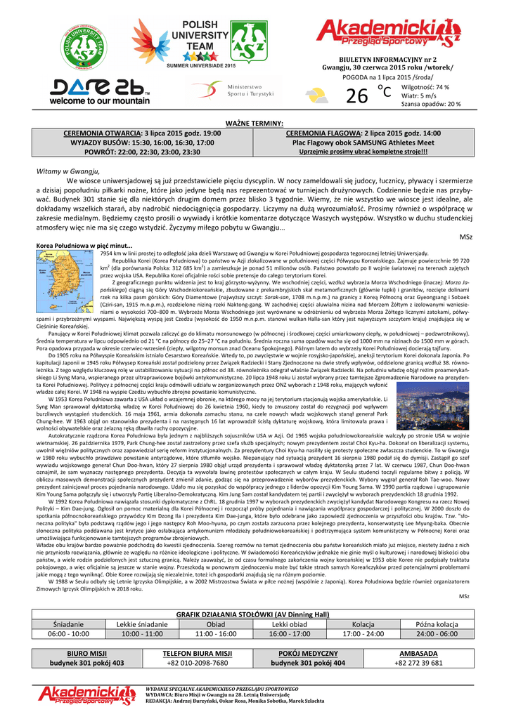 BIULETYN INFORMACYJNY nr 2 Gwangju, 30 0 czerwca czerwc 2015 roku /wtorek/ POGODA na 1 lipca 2015 /środa/ o Wilgotność: 74 % Wiatr: 5 m/s Szansa opadów: 20 % 26 6 C WAŻNE TERMINY: CEREMONIA OTWARCIA:: 3 lipca 2015 godz. 19:00 WYJAZDY BUSÓW: 15:30, 16:00, 16:30, 17:00 POWRÓT: 22:00, 22:30, 23:00, 23:30 CEREMONIA FLAGOWA:: 2 lipca 2015 godz. 14:00 Plac Flagowy obok SAMSUNG Athletes Athlet Meet Uprzejmie prosimy ubrać kompletne stroje!!! Witamy w Gwangju, We wiosce uniwersjadowej są już przedstawiciele rzedstawiciele pięciu dyscyplin. W nocy zameldowali się judocy, judo łucznicy, pływacy i szermierze a dzisiaj popołudniu piłkarki nożne, ne, które jako jedyne będą nas reprezentować w turniejach drużynowych. Codziennie będzie nas przybywać. Budynek 301 stanie się dla niektórych h drugim domem przez blisko 3 tygodnie. Wiemy, że nie wszystko we wiosce jest idealne, ale dokładamy wszelkich starań, aby nadrobić niedociągnięcia gospodarzy. Liczymy na dużą wyrozumiałość. Prosimy również rów o współpracę w zakresie medialnym. Będziemy często prosili o wywiady i krótkie komentarze dotyczące Waszych występów. Wszystko w duchu studenckiej stude atmosfery więc nie ma się czego wstydzić. Życzymy yczymy miłego pobytu w Gwangju... Gwangju MSz Korea Południowa w pięć minut... 7954 km w linii prostej to odległość jaka dzieli Warszawę od Gwangju w Korei Południowej gospodarza tegoroc teg rocznej letniej Uniwersjady. Republika Korei (Korea Południowa) to państwo w Azji zlokalizowane w południowej części Półwyspu Koreańskiego. Koreański Zajmuje powierzchnie 99 720 km2 (dla porównania Polska: ska: 312 685 km2) a zamieszkuje je ponad 51 milionów osób. Państwo powstało owstało po II wojnie światowej na terenach zajętych przez wojska USA. Republika Korei oficjalnie of rości sobie pretensje do całego terytorium Korei. Z geograficznego punktu widzenia jest to kraj k górzysto-wyżynny. wyżynny. We wschodniej części, wzdłuż wybrzeża Morza Wschodniego (inaczej: Morza Japońskiego) ciągną się Góry Wschodniokoreańskie, Wschodniok zbudowane z prekambryjskich skał metamorficznych (głównie łupki) i granitów, rozcięte dolinami rzek na kilka pasm górskich: Góry Diamentowe Di (najwyższy szczyt: Sorak-san, 1708 m.n.p.m.) na granicy z Koreą Północną oraz Gyeongsang i Sobaek (Cziri-san, 1915 m.n.p.m.), rozdzielone dzielone niziną rzeki Naktong-gang. W zachodniej części aluwialna nizina nad Morzem Żółtym z izolowanymi wzniesieniami o wysokości 700–800 800 m. Wybrzeże Morza Wschodniego jest wyrównane w odróżnieniu od wybrzeża Morza Żółtego licznymi zatokami, półwypół spami i przybrzeżnymi wyspami. Największą wyspą jest Czedżu (wysokość do 1950 m.n.p.m. stanowi wulkan Halla-san który jest najwy wyższym szczytem kraju) znajdująca się w Cieśninie Koreańskiej. Panujący w Korei Południowej klimat pozwala zwala zaliczyć go do klimatu k monsunowego (w w północnej i środkowej części umiarkowany ciepły, w południowej poł – podzwrotnikowy). Średnia temperatura w lipcu odpowiednio od 21 °C na północy do 25–27 25 °C na południu. Średnia roczna suma opadów wacha się od 1000 mm na nizinach do 1500 mm w górach. Pora opadowa przypada w okresie czerwiec-wrzesień wrzesień (ciepły, wilgotny wilgo monsun znad Oceanu Spokojnego). Późnym latem do wybrzeży Korei Południowej docierają docier tajfuny. Do 1905 roku na Półwyspie Koreańskim istniało Cesarstwo Koreańskie. Koreańskie Wtedy to, po zwycięstwie w wojnie rosyjsko-japońskiej,, aneksji terytorium t Korei dokonała Japonia. Po kapitulacji Japonii w 1945 roku Półwysep Koreański ański został podzielony przez Związek Radziecki i Stany Zjednoczone na dwie strefy wpływów, oddzielone granicą gr wzdłuż 38. równoleżnika. Z tego względu kluczową czową rolę w ustabilizowaniu sytuacji na północ od 38. równoleżnika odegrał właśnie Związek Radziecki. R Na południu władzę objął reżim proamerykańproam skiego Li Syng Mana, wspieranego przez ultraprawicowe traprawicowe bojówki antykomunistyczne. antyk 20 lipca 1948 roku Li został wybrany przez tamtejsze sze Zgromadzenie Narodowe na prezydenta Korei Południowej. Politycy z północnej części kraju odmówili mówili udziału w zorganizowanych zorgan przez ONZ wyborach borach z 1948 roku, mających wyłonić władze całej Korei. W 1948 na wyspie Czedżu wybuchło zbrojne powstanie p komunistyczne. W 1953 Korea Południowa zawarła z USA układ o wzajemnej obronie, na którego mocy na jej terytorium stacjonują stacjonują wojska amerykańskie. ameryka Li Syng Man sprawował dyktatorską ską władzę w Korei Południowej do 26 kwietnia 1960, kiedy to zmuszony zm szony został do rezygnacji pod wpływem burzliwych wych wystąpień studenckich. 16 maja 1961, armia dokonała zamachu stanu, na czele nowych władzz wojskowych stanął generał Park Chung-hee.. W 1963 objął on stanowisko prezydenta i na następnych nastę 16 lat wprowadził ścisłą dyktaturę wojskową,, która limitowała prawa i wolności obywatelskie oraz żelazną ręką dławiła ruchy opozycyjne. Autokratycznie rządzonaa Korea Południowa była jednym z najbliższych sojuszników USA w Azji. Od 1965 wojska południowokoreańskie walczyły po stronie USA w wojnie wietnamskiej. 26 października 1979, Park Chung-hee hee został zastrzelony przez szefa służb specjalnych; nowym prezydentem prezydente został Choi Kyu-ha. Kyu Dokonał on liberalizacji systemu, uwolnił więźniów politycznych nych oraz zapowiedział serię reform instytucjonalnych. Za prezydentury Choi Kyu-ha Kyu ha nasiliły się protesty społeczne zwłaszcza zwłas studenckie. To w Gwangju w 1980 roku wybuchło chło prawdziwe powstanie antyrządowe, które stłumiło wojsko. Niepanujący nad sytuacją prezydent prez dent 16 sierpnia 1980 podał się do dymisji. Zastąpił Zast go szef wywiadu wojskowego generał Chun 