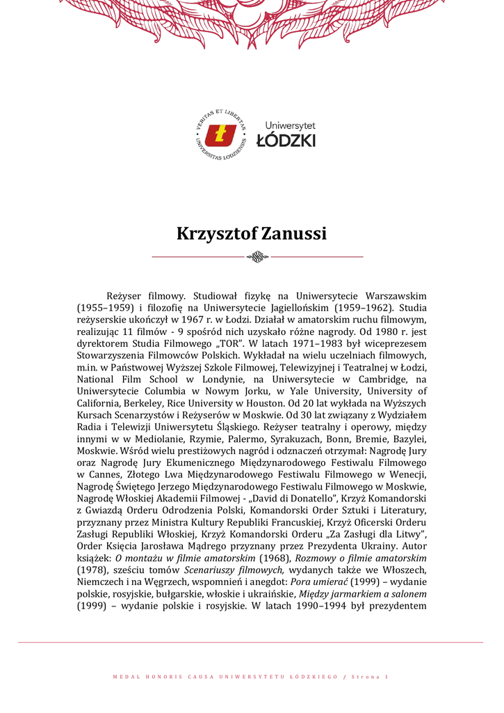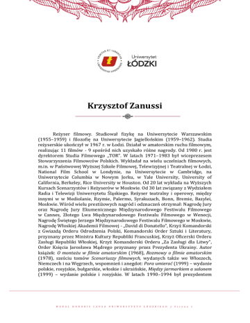Krzysztof Zanussi Reżyser filmowy. Studiował fizykę na Uniwersytecie Warszawskim (1955–1959) i filozofię na Uniwersytecie Jagiellońskim (1959–1962). Studia reżyserskie ukończył w 1967 r. w Łodzi. Działał w amatorskim ruchu filmowym, realizując 11 filmów - 9 spośród nich uzyskało różne nagrody. Od 1980 r. jest dyrektorem Studia Filmowego „TOR”. W latach 1971–1983 był wiceprezesem Stowarzyszenia Filmowców Polskich. Wykładał na wielu uczelniach filmowych, m.in. w Państwowej Wyższej Szkole Filmowej, Telewizyjnej i Teatralnej w Łodzi, National Film School w Londynie, na Uniwersytecie w Cambridge, na Uniwersytecie Columbia w Nowym Jorku, w Yale University, University of California, Berkeley, Rice University w Houston. Od 20 lat wykłada na Wyższych Kursach Scenarzystów i Reżyserów w Moskwie. Od 30 lat związany z Wydziałem Radia i Telewizji Uniwersytetu Śląskiego. Reżyser teatralny i operowy, między innymi w w Mediolanie, Rzymie, Palermo, Syrakuzach, Bonn, Bremie, Bazylei, Moskwie. Wśród wielu prestiżowych nagród i odznaczeń otrzymał: Nagrodę Jury oraz Nagrodę Jury Ekumenicznego Międzynarodowego Festiwalu Filmowego w Cannes, Złotego Lwa Międzynarodowego Festiwalu Filmowego w Wenecji, Nagrodę Świętego Jerzego Międzynarodowego Festiwalu Filmowego w Moskwie, Nagrodę Włoskiej Akademii Filmowej - „David di Donatello”, Krzyż Komandorski z Gwiazdą Orderu Odrodzenia Polski, Komandorski Order Sztuki i Literatury, przyznany przez Ministra Kultury Republiki Francuskiej, Krzyż Oficerski Orderu Zasługi Republiki Włoskiej, Krzyż Komandorski Orderu „Za Zasługi dla Litwy”, Order Księcia Jarosława Mądrego przyznany przez Prezydenta Ukrainy. Autor książek: O montażu w filmie amatorskim (1968), Rozmowy o filmie amatorskim (1978), sześciu tomów Scenariuszy filmowych, wydanych także we Włoszech, Niemczech i na Węgrzech, wspomnień i anegdot: Pora umierać (1999) – wydanie polskie, rosyjskie, bułgarskie, włoskie i ukraińskie, Między jarmarkiem a salonem (1999) – wydanie polskie i rosyjskie. W latach 1990–1994 był prezydentem M E D A L H O N O R I S C A U S A U N I W E R S Y T E T U Ł Ó D Z K I E G O / S t r o n a 1 M E D A L H O N O R I S C A U S A U N I W E R S Y T E T U Ł Ó D Z K I E G O Europejskiej Federacji Realizatorów Audiowizualnych FERA, przewodniczył Międzynarodowemu Festiwalowi Kina i Telewizji EUROVISIONI. Członek założyciel Zarządu Europejskiej Akademii Filmowej, Polskiej Akademii Umiejętności, PEN-Clubu, Stowarzyszenia Pisarzy Polskich. Doctor Honoris Causa Państwowego Instytutu Kinematografii Federacji Rosyjskiej w Moskwie, Państwowego Uniwersytetu Kina i Telewizji w Sankt Petersburgu, Europejskiego Uniwersytetu Humanistycznego w Mińsku, Grodzieńskiego Uniwersytetu Państwowego im. Janki Kupały, Katolickiego Uniwersytetu im. Petera Pazmany’a w Budapeszcie, Akademii Teatru i Filmu im. Iona L. Caragiale w Bukareszcie, Nowego Uniwersytetu Bułgarskiego w Sofii, Katolickiego Uniwersytetu Lubelskiego, Uniwersytetu Opolskiego i Uniwersytetu Łódzkiego. Filmy fabularne 1969 Struktura kryształu 1971 Życie rodzinne, Za ścianą 1973 Iluminacja, The Catamount Killing 1974 Bilans kwartalny 1976 Barwy ochronne 1978 Spirala 1979 Drogi pośród nocy 1980 Constans, Kontrakt 1981 Z dalekiego kraju 1982 Imperatyw, The Unaproachable 1984 Rok spokojnego słońca 1985 Paradygmat 1988 Gdzieśkolwiek jest, jeśliś jest 1989 Stan posiadania 1990 Life for a Life 1992 Dotknięcie ręki M E D A L H O N O R I S C A U S A U N I W E R S Y T E T U Ł Ó D Z K I E G O / S t r o n a 2 M E D A L H O N O R I S C A U S A U N I W E R S Y T E T U Ł Ó D Z K I E G O 1995 Cwał 1997 Brat naszego Boga 2000 Życie jako śmiertelna choroba przenoszona drogą płciową 2002 Suplement 2005 Persona non grata 2007 Czarne słońce 2008 Serce na dłoni 2009 Rewizyta Nagrody filmowe (wybór) 1970 Struktura kryształu – Nagroda Międzynarodowego Festiwalu Filmowego w Valladolid 1972 Życie rodzinne – Nagroda w Valladolid Międzynarodowego Festiwalu Filmowego 1973 Iluminacja – Grand Prix Międzynarodowego Festiwalu Filmowego w Locarno oraz Nagroda Międzynarodowej Federacji Krytyków Filmowych FIPRESCI; Nagroda Specjalna Jury Festiwalu Polskich Filmów Fabularnych w Gdyni 1977 Barwy ochronne – Grand Prix Festiwalu Polskich Filmów Fabularnych w Gdyni 1978 Spirala – Nagroda Jury Ekumenicznego Międzynarodowego Festiwalu Filmowego w Cannes 1980 Constans – Nagroda Jury Międzynarodowego Festiwalu Filmowego w Cannes 1982 Imperativ – Nagroda Specjalna Jury Międzynarodowego Festiwalu Filmowego w Wenecji 1984 Rok spokojnego słońca – Złoty Lew Międzynarodowego Festiwalu Filmowego w Wenecji M E D A L H O N O R I S C A U S A U N I W E R S Y T E T U Ł Ó D Z K I E G O / S t r o n a 3 M E D A L H O N O R I S C A U S A U N I W E R S Y T E T U Ł Ó D Z K I E G O 1987 Międzynarodowa Nagroda „Lumiere”, przyznana przez Włoskie Stowarzyszenie Autorów Teatralnych i Filmowych za całokształt twórczości w dziedzinie filmu 1996 Cwał – Nagroda Specjalna Jury Międzynarodowego Festiwalu Filmowego w Tokio, Nagroda Specjalna Jury Festiwalu Polskich Filmów Fabularnych w Gdyni 2000 Życie jako śmiertelna choroba przenoszona drogą płciową – Nagroda Główna Międzynarodowego Festiwalu Filmowego w Moskwie; Grand Prix Festiwalu Polskich Filmów Fabularnych w Gdyni; Wielka Nagroda „Złote Lwy Gdańskie”; Polska Nagroda Filmowa „Orzeł” w kategorii: Najlepszy Producent - za rok 2000 2002 Suplement – Nagroda Międzynarodowego Festiwalu Filmowego w Moskwie, Nagroda Międzynarodowej Federacji Krytyków Filmowych FIPRESCI M E D A L H O N O R I S C A U S A U N I W E R S Y T E T U Ł Ó D Z K I E G O / S t r o n a 4