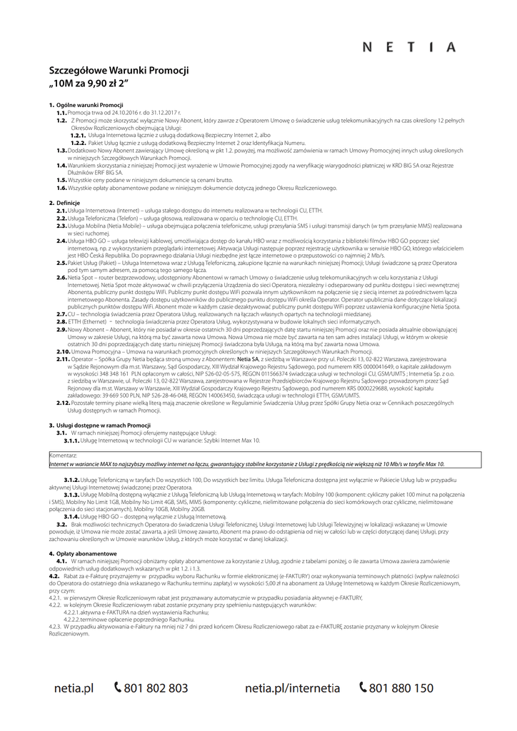 Szczegółowe Warunki Promocji „10M za 9,90 zł 2” 1. Ogólne warunki Promocji 1.1. Promocja trwa od 24.10.2016 r. do 31.12.2017 r. 1.2. Z Promocji może skorzystać wyłącznie Nowy Abonent, który zawrze z Operatorem Umowę o świadczenie usług telekomunikacyjnych na czas określony 12 pełnych Okresów Rozliczeniowych obejmującą Usługi: 1.2.1. Usługa Internetowa łącznie z usługą dodatkową Bezpieczny Internet 2, albo 1.2.2. Pakiet Usług łącznie z usługą dodatkową Bezpieczny Internet 2 oraz Identyfikacja Numeru. 1.3. Dodatkowo Nowy Abonent zawierający Umowę określoną w pkt 1.2. powyżej, ma możliwość zamówienia w ramach Umowy Promocyjnej innych usług określonych w niniejszych Szczegółowych Warunkach Promocji. 1.4. Warunkiem skorzystania z niniejszej Promocji jest wyrażenie w Umowie Promocyjnej zgody na weryfikację wiarygodności płatniczej w KRD BIG SA oraz Rejestrze Dłużników ERIF BIG SA. 1.5. Wszystkie ceny podane w niniejszym dokumencie są cenami brutto. 1.6. Wszystkie opłaty abonamentowe podane w niniejszym dokumencie dotyczą jednego Okresu Rozliczeniowego. 2. Definicje 2.1. Usługa Internetowa (Internet) – usługa stałego dostępu do internetu realizowana w technologii CU, ETTH. 2.2. Usługa Telefoniczna (Telefon) – usługa głosowa, realizowana w oparciu o technologię CU, ETTH. 2.3. Usługa Mobilna (Netia Mobile) – usługa obejmująca połączenia telefoniczne, usługi przesyłania SMS i usługi transmisji danych (w tym przesyłanie MMS) realizowana w sieci ruchomej. 2.4. Usługa HBO GO – usługa telewizji kablowej, umożliwiająca dostęp do kanału HBO wraz z możliwością korzystania z biblioteki filmów HBO GO poprzez sieć internetową, np. z wykorzystaniem przeglądarki internetowej. Aktywacja Usługi następuje poprzez rejestrację użytkownika w serwisie HBO GO, którego właścicielem jest HBO Česká Republika. Do poprawnego działania Usługi niezbędne jest łącze internetowe o przepustowości co najmniej 2 Mb/s. 2.5. Pakiet Usług (Pakiet) – Usługa Internetowa wraz z Usługą Telefoniczną, zakupione łącznie na warunkach niniejszej Promocji; Usługi świadczone są przez Operatora pod tym samym adresem, za pomocą tego samego łącza. 2.6. Netia Spot – router bezprzewodowy, udostępniony Abonentowi w ramach Umowy o świadczenie usług telekomunikacyjnych w celu korzystania z Usługi Internetowej. Netia Spot może aktywować w chwili przyłączenia Urządzenia do sieci Operatora, niezależny i odseparowany od punktu dostępu i sieci wewnętrznej Abonenta, publiczny punkt dostępu WiFi. Publiczny punkt dostępu WiFi pozwala innym użytkownikom na połączenie się z siecią internet za pośrednictwem łącza internetowego Abonenta. Zasady dostępu użytkowników do publicznego punktu dostępu WiFi określa Operator. Operator upublicznia dane dotyczące lokalizacji publicznych punktów dostępu WiFi. Abonent może w każdym czasie dezaktywować publiczny punkt dostępu WiFi poprzez ustawienia konfiguracyjne Netia Spota. 2.7. CU – technologia świadczenia przez Operatora Usług, realizowanych na łączach własnych opartych na technologii miedzianej. 2.8. ETTH (Ethernet) – technologia świadczenia przez Operatora Usług, wykorzystywana w budowie lokalnych sieci informatycznych. 2.9. Nowy Abonent – Abonent, który nie posiadał w okresie ostatnich 30 dni poprzedzających datę startu niniejszej Promocji oraz nie posiada aktualnie obowiązującej Umowy w zakresie Usługi, na którą ma być zawarta nowa Umowa. Nowa Umowa nie może być zawarta na ten sam adres instalacji Usługi, w którym w okresie ostatnich 30 dni poprzedzających datę startu niniejszej Promocji świadczona była Usługa, na którą ma być zawarta nowa Umowa. 2.10. Umowa Promocyjna – Umowa na warunkach promocyjnych określonych w niniejszych Szczegółowych Warunkach Promocji. 2.11. Operator – Spółka Grupy Netia będąca stroną umowy z Abonentem: Netia SA, z siedzibą w Warszawie przy ul. Poleczki 13, 02-822 Warszawa, zarejestrowana w Sądzie Rejonowym dla m.st. Warszawy, Sąd Gospodarczy, XIII Wydział Krajowego Rejestru Sądowego, pod numerem KRS 0000041649, o kapitale zakładowym w wysokości 348 348 161 PLN opłaconym w całości, NIP 526-02-05-575, REGON 011566374 świadcząca usługi w technologii CU, GSM/UMTS ; Internetia Sp. z o.o. z siedzibą w Warszawie, ul. Poleczki 13, 02-822 Warszawa, zarejestrowana w Rejestrze Przedsiębiorców Krajowego Rejestru Sądowego prowadzonym przez Sąd Rejonowy dla m.st. Warszawy w Warszawie, XIII Wydział Gospodarczy Krajowego Rejestru Sądowego, pod numerem KRS 0000229688, wysokość kapitału zakładowego: 39 669 500 PLN, NIP 526-28-46-048, REGON 140063450, świadcząca usługi w technologii ETTH, GSM/UMTS. 2.12. Pozostałe terminy pisane wielką literą mają znaczenie określone w Regulaminie Świadczenia Usług przez Spółki Grupy Netia oraz w Cennikach poszczególnych Usług dostępnych w ramach Promocji. 3. Usługi dostępne w ramach Promocji 3.1. W ramach niniejszej Promocji oferujemy następujące Usługi: 3.1.1. Usługę Internetową w technologii CU w wariancie: Szybki Internet Max 10. Komentarz: Internet w wariancie MAX to najszybszy możliwy internet na łączu, gwarantujący stabilne korzystanie z Usługi z prędkością nie większą niż 10 Mb/s w taryfie Max 10. 3.1.2. Usługę Telefoniczną w taryfach Do wszystkich 100, Do wszystkich bez limitu. Usługa Telefoniczna dostępna jest wyłącznie w Pakiecie Usług lub w przypadku aktywnej Usługi Internetowej świadczonej przez Operatora. 3.1.3. Usługę Mobilną dostępną wyłącznie z Usługą Telefoniczną lub Usługą Internetową w taryfach: Mobilny 100 (komponent: cykliczny pakiet 100 minut na połączenia i SMS), Mobilny No Limit 1GB, Mobilny No Limit 4GB, SMS, MMS (komponenty: cykliczne, nielimitowane połączenia do sieci komórkowych oraz cykliczne, nielimitowane połączenia do sieci stacjonarnych), Mobilny 10GB, 
