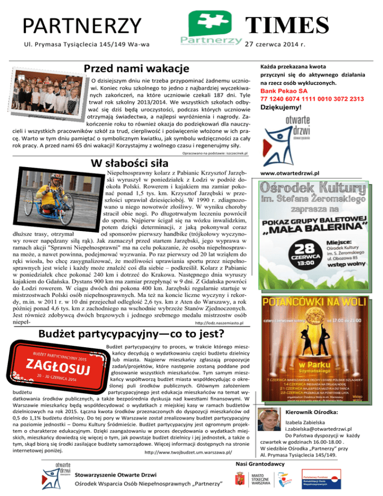 TIMES PARTNERZY 27 czerwca 2014 r. Ul. Prymasa Tysiąclecia 145/149 Wa-wa Przed nami wakacje O dzisiejszym dniu nie trzeba przypominać żadnemu uczniowi. Koniec roku szkolnego to jedno z najbardziej wyczekiwanych zakończeń, na które uczniowie czekali 187 dni. Tyle trwał rok szkolny 2013/2014. We wszystkich szkołach odbywać się dziś będą uroczystości, podczas których uczniowie gorowoilaw eckie.wm.p otrzymają świadectwa, a najlepsi wyróżnienia i nagrody. Zal kończenie roku to również okazja do podziękowań dla nauczycieli i wszystkich pracowników szkół za trud, cierpliwość i poświęcenie włożone w ich pracę. Warto w tym dniu pamiętać o symbolicznym kwiatku, jak symbolu wdzięczności za cały rok pracy. A przed nami 65 dni wakacji! Korzystajmy z wolnego czasu i regenerujmy siły. Każda przekazana kwota przyczyni się do aktywnego działania na rzecz osób wykluczonych. Bank Pekao SA 77 1240 6074 1111 0010 3072 2313 Dziękujemy! Opracowano na podstawie: iszczecinek.pl W słabości siła Niepełnosprawny kolarz z Pabianic Krzysztof Jarzębski wyruszył w poniedziałek z Łodzi w podróż dookoła Polski. Rowerem i kajakiem ma zamiar pokonać ponad 1,5 tys. km. Krzysztof Jarzębski w przeszłości uprawiał dziesięciobój. W 1990 r. zdiagnozowano u niego nowotwór złośliwy. W wyniku choroby stracił obie nogi. Po długotrwałym leczeniu powrócił do sportu. Najpierw ścigał się na wózku inwalidzkim, potem dzięki determinacji, z jaką pokonywał coraz dłuższe trasy, otrzymał od sponsorów pierwszy handbike (trójkołowy wyczynowy rower napędzany siłą rąk). Jak zaznaczył przed startem Jarzębski, jego wyprawa w ramach akcji "Sprawni Niepełnosprawni" ma na celu pokazanie, że osoba niepełnosprawna może, a nawet powinna, podejmować wyzwania. Po raz pierwszy od 20 lat wziąłem do ręki wiosła, bo chcę zasygnalizować, że możliwości uprawiania sportu przez niepełnosprawnych jest wiele i każdy może znaleźć coś dla siebie – podkreślił. Kolarz z Pabianic w poniedziałek chce pokonać 240 km i dotrzeć do Krakowa. Następnego dnia wyruszy kajakiem do Gdańska. Dystans 900 km ma zamiar przepłynąć w 9 dni. Z Gdańska powróci do Łodzi rowerem. W ciągu dwóch dni pokona 400 km. Jarzębski regularnie startuje w mistrzostwach Polski osób niepełnosprawnych. Ma też na koncie liczne wyczyny i rekordy, m.in. w 2011 r. w 10 dni przejechał odległość 2,6 tys. km z Aten do Warszawy, a rok później ponad 4,6 tys. km z zachodniego na wschodnie wybrzeże Stanów Zjednoczonych. Jest również zdobywcą dwóch brązowych i jednego srebrnego medalu mistrzostw osób niepełhttp://lodz.naszemiasto.pl www.otwartedrzwi.pl Budżet partycypacyjny—co to jest? Budżet partycypacyjny to proces, w trakcie którego mieszkańcy decydują o wydatkowaniu części budżetu dzielnicy lub miasta. Najpierw mieszkańcy zgłaszają propozycje zadań/projektów, które następnie zostaną poddane pod głosowanie wszystkich mieszkańców. Tym samym mieszkańcy współtworzą budżet miasta współdecydując o określonej puli środków publicznych. Głównym założeniem budżetu partycypacyjnego jest edukacja mieszkańców na temat wydatkowania środków publicznych, a także bezpośrednia dyskusja nad kwestiami finansowymi. W Warszawie mieszkańcy będą współdecydować o wydatkach z miejskiej kasy w ramach budżetów dzielnicowych na rok 2015. Łączna kwota środków przeznaczonych do dyspozycji mieszkańców od 0,5 do 1,1% budżetu dzielnicy. Do tej pory w Warszawie został zrealizowany budżet partycypacyjny na poziomie jednostki – Domu Kultury Śródmieście. Budżet partycypacyjny jest ogromnym projektem o charakterze edukacyjnym. Dzięki zaangażowaniu w proces decydowania o wydatkach miejskich, mieszkańcy dowiedzą się więcej o tym, jak powstaje budżet dzielnicy i jej jednostek, a także o tym, skąd biorą się środki zasilające budżety samorządowe. Więcej informacji dostępnych na stronie internetowej poniżej. http://www.twojbudzet.um.warszawa.pl/ Kierownik Ośrodka: Izabela Zabielska [email protected] Do Państwa dyspozycji w każdy czwartek w godzinach 16.00-18.00 . W siedzibie Ośrodka „Partnerzy” przy Al. Prymasa Tysiąclecia 145/149. Nasi Grantodawcy Stowarzyszenie Otwarte Drzwi Ośrodek Wsparcia Osób Niepełnosprawnych „Partnerzy” Obowiązki straży miejskiej 1) ochrona spokoju i porządku w miejscach publicznych, 2) czuwanie nad porządkiem i kontrola ruchu drogowego - w zakresie określonym w przepisach o ruchu drogowym, 2a) kontrola publicznego transportu zbiorowego - w zakresie określonym w art. 45 ust. 1 ustawy z dnia 16 grudnia 2010 r. o publicznym transporcie zbiorowym (Dz. U. Nr 5, poz. 13), 3) współdziałanie z właściwymi podmiotami w zakresie ratowania życia i zdrowia obywateli, pomocy w usuwaniu awarii technicznych i skutków klęsk żywiołowych oraz innych miejscowych zagrożeń, 4) zabezpieczenie miejsca przestępstwa, katastrofy lub innego podobnego zdarzenia albo miejsc zagrożonych takim zdarzeniem przed dostępem osób postronnych lub zniszczeniem śladów i dowodów, do momentu przybycia właściwych służb, a także ustalenie, w miarę możliwości, świadków zdarzenia, 5) ochrona obiektów komunalnych i urządzeń użyteczności publicznej, 6) współdziałanie z organizatorami i innymi służbami w ochronie porządku podczas zgromadzeń i imprez publicznych, 7) doprowadzanie osób nietrzeźwych do izby wytrzeźwień lub miejsca ich zamieszkania, jeżeli osoby te zachowaniem swoim dają powód do zgorszenia w miejscu publicznym, znajdują się w okolicznościach zagrażających ich życiu lub zdrowiu albo zagrażają życiu i zdrowiu innych osób, 8) informowanie społeczności lokalnej o stanie i rodzajach zagrożeń, a także inicjowanie i uczestnictwo w działaniach mających na celu zapobieganie popełnianiu przestępstw i wykroczeń oraz zjawiskom kryminogennym i współdziałanie w tym