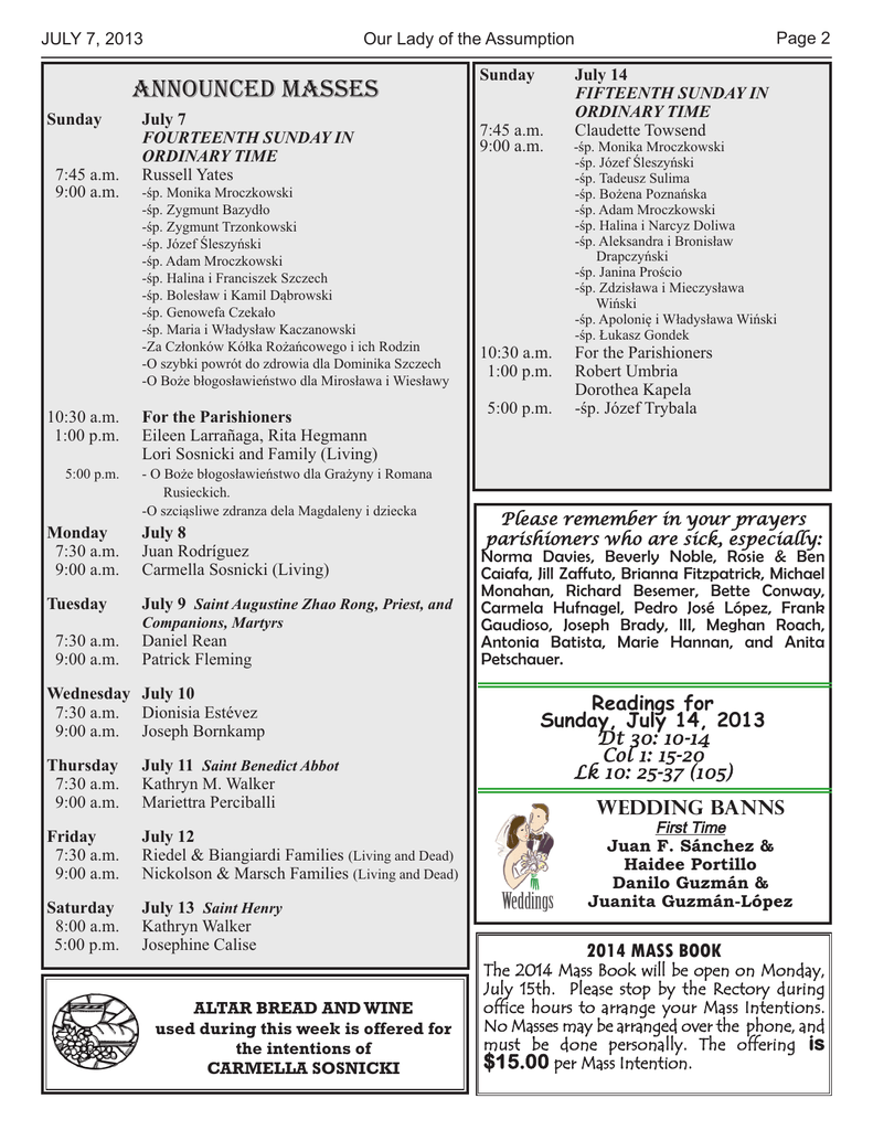 announced masses - Our Lady of Assumption