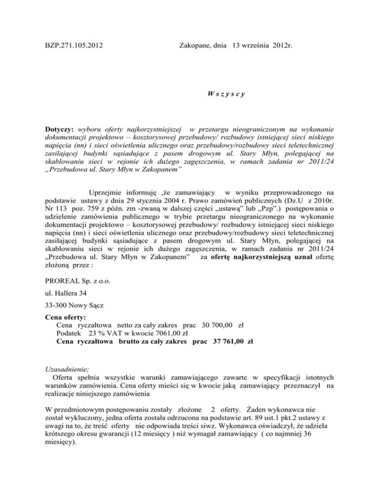 BZP.271.105.2012 Zakopane, dnia 13 września 2012r. Wszyscy Dotyczy: wyboru oferty najkorzystniejszej w przetargu nieograniczonym na wykonanie dokumentacji projektowo – kosztorysowej przebudowy/ rozbudowy istniejącej sieci niskiego napięcia (nn) i sieci oświetlenia ulicznego oraz przebudowy/rozbudowy sieci teletechnicznej zasilającej budynki sąsiadujące z pasem drogowym ul. Stary Młyn, polegającej na skablowaniu sieci w rejonie ich duŜego zagęszczenia, w ramach zadania nr 2011/24 „Przebudowa ul. Stary Młyn w Zakopanem” Uprzejmie informuję ,Ŝe zamawiający w wyniku przeprowadzonego na podstawie ustawy z dnia 29 stycznia 2004 r. Prawo zamówień publicznych (Dz.U z 2010r. Nr 113 poz. 759 z późn. zm -zwaną w dalszej części „ustawą” lub „Pzp”.) postępowania o udzielenie zamówienia publicznego w trybie przetargu nieograniczonego na wykonanie dokumentacji projektowo – kosztorysowej przebudowy/ rozbudowy istniejącej sieci niskiego napięcia (nn) i sieci oświetlenia ulicznego oraz przebudowy/rozbudowy sieci teletechnicznej zasilającej budynki sąsiadujące z pasem drogowym ul. Stary Młyn, polegającej na skablowaniu sieci w rejonie ich duŜego zagęszczenia, w ramach zadania nr 2011/24 „Przebudowa ul. Stary Młyn w Zakopanem” za ofertę najkorzystniejszą uznał ofertę złoŜoną przez : PROREAL Sp. z o.o. ul. Hallera 34 33-300 Nowy Sącz Cena oferty: Cena ryczałtowa netto za cały zakres prac 30 700,00 zł Podatek 23 % VAT w kwocie 7061,00 zł Cena ryczałtowa brutto za cały zakres prac 37 761,00 zł Uzasadnienie; Oferta spełnia wszystkie warunki zamawiającego zawarte w specyfikacji istotnych warunków zamówienia. Cena oferty mieści się w kwocie jaką zamawiający przeznaczył na realizacje niniejszego zamówienia W przedmiotowym postępowaniu zostały złoŜone 2 oferty. śaden wykonawca nie został wykluczony, jedna oferta została odrzucona na podstawie art. 89 ust.1 pkt.2 ustawy z uwagi na to, Ŝe treść oferty nie odpowiada treści siwz. Wykonawca oświadczył, Ŝe udziela krótszego okresu gwarancji (12 miesięcy ) niŜ wymagał zamawiający ( co najmniej 36 miesięcy). Streszczenie oceny i porównanie złoŜonych ofert. Nr Wykonawca i cena brutto oferty oferty 1. PROREAL Sp. z o.o. Ilość punktów w kryterium cena brutto – 100% w skali 100 punktowej 100 ul. Hallera 34 33-300 Nowy Sącz Cena ryczałtowa brutto za cały zakres prac 37 761,00 zł 2. SWECO Infraprojekt Sp. z o.o. ul. Mogilska 25 31-542 Kraków Cena ryczałtowa brutto za cały zakres prac 71 832,00 zł Oferta odrzucona na podstawie art. 89 ust.1 pkt.2 ustawy Z up. Burmistrza inŜ. Bronisław Bublik Naczelnik Wydziału Rozwoju Lokalnego i Inwestycji Pouczenie W niniejszym postępowaniu Wykonawcy przysługują środki ochrony prawnej (Odwołanie, Skarga do Sądu) tylko wobec czynności: 1) wykluczenia wykonawcy z postępowania o udzielenie zamówienia; 2) odrzucenia oferty wykonawcy W pozostałych przypadkach odwołanie nie przysługuje. Informacje dotyczące środków ochrony prawnej znajdują się w Dziale VI Prawa zamówień public
