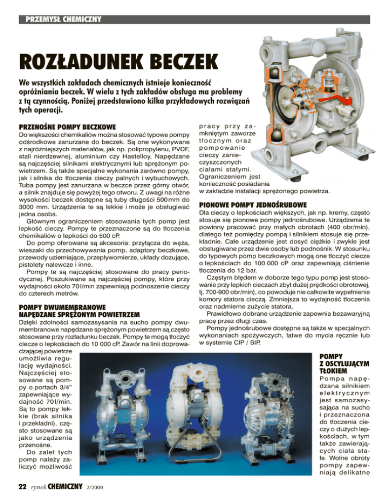 PRZEMYS£ CHEMICZNY ROZ£ADUNEK BECZEK We wszystkich zak³adach chemicznych istnieje koniecznoœæ opró¿niania beczek. W wielu z tych zak³adów obs³uga ma problemy z t¹ czynnoœci¹. Poni¿ej przedstawiono kilka przyk³adowych rozwi¹zañ tych operacji. PRZENOŒNE POMPY BECZKOWE Do większości chemikaliów można stosować typowe pompy odśrodkowe zanurzane do beczek. Są one wykonywane z najróżniejszych materiałów, jak np. polipropylenu, PVDF, stali nierdzewnej, aluminium czy Hastelloy. Napędzane są najczęściej silnikami elektrycznymi lub sprężonym powietrzem. Są także specjalne wykonania zarówno pompy, jak i silnika do tłoczenia cieczy palnych i wybuchowych. Tuba pompy jest zanurzana w beczce przez górny otwór, a silnik znajduje się powyżej tego otworu. Z uwagi na różne wysokości beczek dostępne są tuby długości 500 mm do 3000 mm. Urządzenia te są lekkie i może je obsługiwać jedna osoba. Głównym ograniczeniem stosowania tych pomp jest lepkość cieczy. Pompy te przeznaczone są do tłoczenia chemikaliów o lepkości do 500 cP. Do pomp oferowane są akcesoria: przyłącza do węża, wieszaki do przechowywania pomp, adaptory beczkowe, przewody uziemiające, przepływomierze, układy dozujące, pistolety nalewcze i inne. Pompy te są najczęściej stosowane do pracy periodycznej. Poszukiwane są najczęściej pompy, które przy wydajności około 70 l/min zapewniają podnoszenie cieczy do czterech metrów. POMPY DWUMEMBRANOWE NAPÊDZANE SPRʯONYM POWIETRZEM Dzięki zdolności samozasysania na sucho pompy dwumembranowe napędzane sprężonym powietrzem są często stosowane przy rozładunku beczek. Pompy te mogą tłoczyć ciecze o lepkościach do 10 000 cP. Zawór na linii doprowadzającej powietrze umożliwia regulację wydajności. Najczęściej stosowane są pompy o portach 3/4” zapewniające wydajność 70 l/min. Są to pompy lekkie (brak silnika i przekładni), często stosowane są jako urządzenia przenośne. Do zalet tych pomp należy zaliczyć możliwość 22 rynek CHEMICZNY 2/2000 pracy przy zamkniętym zaworze tłocznym oraz pompowanie cieczy zanieczyszczonych ciałami stałymi. Ograniczeniem jest konieczność posiadania w zakładzie instalacji sprężonego powietrza. PIONOWE POMPY JEDNOŒRUBOWE Dla cieczy o lepkościach większych, jak np. kremy, często stosuje się pionowe pompy jednośrubowe. Urządzenia te powinny pracować przy małych obrotach (400 obr/min), dlatego też pomiędzy pompą i silnikiem stosuje się przekładnie. Całe urządzenie jest dosyć ciężkie i zwykle jest obsługiwane przez dwie osoby lub podnośnik. W stosunku do typowych pomp beczkowych mogą one tłoczyć ciecze o lepkościach do 100 000 cP oraz zapewniają ciśnienie tłoczenia do 12 bar. Częstym błędem w doborze tego typu pomp jest stosowanie przy lepkich cieczach zbyt dużej prędkości obrotowej, tj. 700-900 obr/min), co powoduje nie całkowite wypełnienie komory statora cieczą. Zmniejsza to wydajność tłoczenia oraz nadmierne zużycie statora. Prawidłowo dobrane urządzenie zapewnia bezawaryjną pracę przez długi czas. Pompy jednośrubowe dostępne są także w specjalnych wykonaniach spożywczych, łatwe do mycia ręcznie lub w systemie CIP / SIP. POMPY Z OSCYLUJ¥CYM T£OKIEM Pompa napędzana silnikiem elektrycznym jest samozasysająca na sucho i przeznaczona do tłoczenia cieczy o dużych lepkościach, w tym także zawierających ciała stałe. Wolne obroty pompy zapewniają delikatne PRZEMYS£ CHEMICZNY PRZEMYS£ CHEMICZNY tłoczenie medium. Brak uszczelnienia i zdolność pracy na sucho umożliwiają opróżnienie rurociągu po zakończeniu pompowania. Pompa pracuje wtedy jako kompresor. Dostępne są urządzenia z żeliwa lub polerowanej stali nierdzewnej. Te ostatnie otrzymały certyfikat farmaceutyczny 3-A. W wielu zakładach pompy te używane są w procesach produkcyjnych oraz przy opróżnianiu beczek i zbiorników z cieczy lepkich, gdzie nie można zapewnić napływu medium do pompy, np. koncentraty detergentów, kremy, pulpy. UK£ADY ROZ£ADUNKU BECZEK Z MEDIÓW NIEP£YNNYCH Kiedy istnieje konieczność opróżnienia beczki z mediów o dużej lepkości, tj. kilku milionów cP (wazelina, koncentrat pomidorowy, silikony), proponowane są kompletne systemy automatycznego rozładunku. Urządzenia te mogą skutecznie opróżniać nawet beczki faliste z wkładką plastikową. Po zakończeniu pompowania w beczce nie pozostaje więcej niż 1% produktu, co jest bardzo dobrym wynikiem. Ten system eliminuje konieczność podgrzewania beczek i odcinania dna. Dzięki pompowaniu bezpulsacyjnemu oraz możliwości podłączenia układu dozującego, system taki łatwo można włączyć do linii produkcyjnej. Pompy te tłoczą medium bez naruszenia jego struktury oraz media zawierające ciała stałe. Dzięki ruchomej ramie pompa z talerzem dociskającym jest powoli opuszczana w dół beczki. Pompa ma zdolność samozasysania, więc dociskanie talerza nie wymaga dużych ciśnień i nie następuje przeciek medium wokół talerza. Gdy talerz osiągnie dno beczki, włączenie się zaworu ciśnieniowego umożliwia podniesienie talerza. Urządzenia wykonywane są na ramach dwu- lub trzykolumnowych. Talerze są wyposażane, w zależności od rodzaju medium, w uszczelki pojedyncze lub podwójne. Specjalne wykonania ze zbiornikiem buforowym zapewniają ciągłą pracę przy zmianie beczek. Głównym elementem urządzenia jest pompa jednośrubowa o szerokim porcie wejściowym (w porównaniu do pomp tłokowych), co zapewnia małe straty ciśnienia na wejściu. Stosowanie dużych portów wyjściowych dla cieczy lepkich umożliwia także skuteczne pompowanie przy stosunkowo niskim ciśnieniu tłoczenia. ANDRZEJ G. BACIÑSKI 2/2000 rynek CHEMICZNY 23