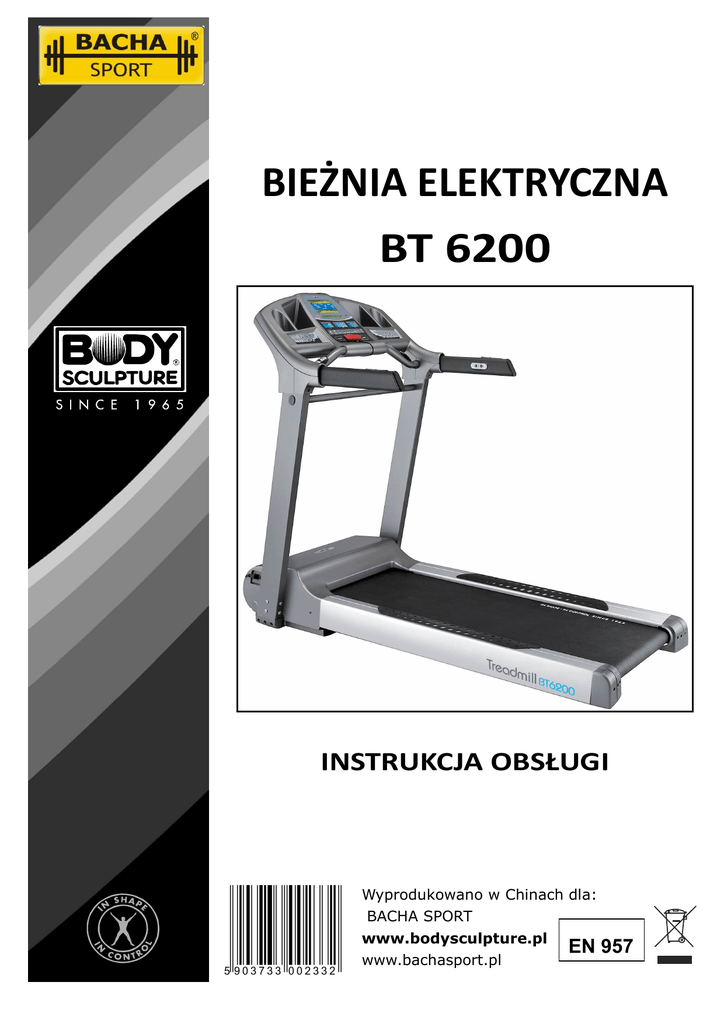 BIEŻNIA ELEKTRYCZNA BT 6200 INSTRUKCJA OBSŁUGI Wyprodukowano w Chinach dla: BACHA SPORT www.bodysculpture.pl EN 957 www.bachasport.pl WAŻNE INFORMACJE Przed przystąpieniem do montażu prosimy o uważne przeczytanie instrukcji. UWAGI 1. Urządzenie jest przeznaczone wyłącznie do użytku domowego. 2. Bieżnia powinna być ustawiona na płaskim i stabilnym podłożu. Dla zachowanie bezpieczeństwa ćwiczeń wokół bieżni powinna znajdować się wolna przestrzeń powinna ona wynosić, co najmniej 0,5 m. 3. Zachowaj szczególną ostrożność podczas podnoszenia lub przenoszenia urządzenia tak, aby nie wywołać kontuzji. Zawsze należy stosować odpowiednie techniki podnoszenia i / lub skorzystać z pomocy. 4. Przed użyciem bieżni przeczytaj uważnie całą instrukcję i zapoznaj się z zasadą jej działania. 5. Zawsze przed przystąpieniem do ćwiczeń sprawdź czy wszystkie śruby są dobrze dokręcone. (Poluzowywanie się niektórych śrub jest naturalnym procesem zachodzącym w trakcie eksploatacji urządzeń). W razie zużycia którejś z części należny natychmiast ją wymienić Nie wolno ćwiczyć na choćby częściowo uszkodzonym sprzęcie. 6. Przed rozpoczęciem jakichkolwiek ćwiczeń należy skonsultować się z lekarzem, aby ustalić, czy stan zdrowia umożliwia trening na bieżni, nie tworząc zagrożenia dla zdrowia i życia, lub uniemożliwi korzystanie z urządzenia prawidłowo. Opinia lekarza jest niezbędna, w przypadku pobierania leków, które mają wpływ na serce, ciśnienie krwi i cholesterol. 7. Większość przyrządów do ćwiczeń nie nadaje się dla małych dzieci. Dzieci nie powinny używać tego przyrządu bez opieki dorosłych. 8. Bieżnia posiada części ruchome. Podczas ćwiczeń pozostałe osoby powinny zachować bezpieczny dystans. 9. Przed ćwiczeniami wykonaj krótką rozgrzewkę (ok. 5-10 min.). Po zakończonym treningu poświęć podobny czas na ochłonięcie, co pozwoli sercu na płynną zmianę tempa pracy i zapobiegnie nadmiernemu obciążaniu mięśni. 10. Nigdy nie wstrzymuj oddechu podczas ćwiczeń! 11. Pomiędzy ćwiczeniami niezbędny jest odpowiedni odpoczynek, podczas którego następuje rozwinięcie mięśni. Początkujący nie powinni ćwiczyć więcej niż dwa razy w tygodniu, stopniowo zwiększając tę liczbę do 4 i 5 razy. 12. Do ćwiczeń ubieraj zawsze wygodny dres i obuwie. Unikać należy luźnych ubrań, które mogą wkręcić się w ruchome części maszyny. 13. Bieżnia została wykonana zgodnie z norma EN 957 w klasie H.C. 14. Maksymalna waga osoby ćwiczącej nie może przekraczać 160 KG. 15. Sprzęt posiada niezależny układ hamulcowy (oporowy). 16. Transport i magazynowanie powinno odbywać się zgodnie z ogólnymi zasadami bezpieczeństwa. UWAGA: Zanim rozpoczniesz jakiekolwiek ćwiczenia skonsultuj się ze swoim lekarzem. Jeżeli podczas treningu będzie odczuwalny ból, wystąpią zawroty głowy, mdlenie lub podobne objawy –zaprzestań ćwiczeń i udaj się do lekarza! 2 SERWIS GWARANCYJNY I POGWARANCYJNY Wszelkich napraw gwarancyjnych i pogwarancyjnych dokonuje importer i zarazem dystrybutor rowerka. W razie wystąpienia usterki prosimy o zgłoszenie się do miejsca zakupu urządzenia lub do serwisu: BACHA SPORT 44-164 Gliwice, ul. Radomska 71, Tel: 32/270-16-15 Fax: 032/ 270-12-09 e-mail: [email protected] DANE TECHNICZNE BT 6200 WYMIARY: (dł/szer./wys.) 190x90x138 cm PO ZŁOŻENIU:110x90x162 cm WAGA: 117 kg MAKSYMALNA WAGA OSOBY ĆWICZĄCEJ: 160 KG. Uwaga: Narzędzia potrzebne do montażu bieżni znajdują się w kartonie. LISTA CZĘŚCI NR. A01 A02 B01 C01 C02 C03 C04 C05 C06 C07 C08 C09 C10 C11 C12 C13 C14 C15 C16 C17 C18 C19 C20 C21 C22 D01 E01R E01L E02R E02L E03 BT 6200 OPIS OPIS TECHNICZNY Rama przednia Rura pneumatyczna Łącznik ramy Rama Kółka transportowe Bufor Elementy mocowania poręczy Gniazdo sieciowe Pas Silnik Silnik podnoszący Zasilacz Przednia rolka Czujnik Drewniana podstawa Pas bieżny Osłona boczna (P) Tylna płyta Tylna rolka Osłona boczna (L) Osłonka tylnej rolki (P) Nieruchoma płytka Osłonka tylnej rolki (L) Dolna osłona Obudowa Licznik Podstawa poręczy (P) Podstawa poręczy (L) Poręcz (P) Poręcz (L) Prawa osłona poręczy (zewnętrzna) ∮30*25(M8*16L) 2T 2.0 KM 0.125 KM 12V(1A) Φ60x562 1250x612x19T 2970*510*1.8T 1254x688x1.5T PCV Φ60x606 ABS 2.5t ABS PP ABS 40*120*2T 40*120*2T 30*70*1.5T 30*70*1.5T 3 ILOŚĆ 1 1 1 1 1 12 8 1 1 1 1 1 1 1 1 1 1 1 1 1 1 1 1 1 1 1 1 1 1 1 1 E04 E05 E06 E07 E07R E07L Z01 Z02 Z03 Z04 Z05 Z06 Z07 Z08 Z09 Z10 Z11 Z13 Z14 Z15 Z16 Z17 Z18 Z19 Prawa osłona poręczy (wewnętrzna) Lewa osłona poręczy (wewnętrzna) Lewa osłona poręczy (zewnętrzna) Wspornik Stabilizator prawej postawy poręczy Stabilizator lewej postawy poręczy Śruba Podkładka Nakrętka nylonowa Podkładka Śruba Śruba wyrównująca Śruba Podkładka Śruba Śruba heksagonalna Śruba Śruba Śruba sześciokątna Śruba sześciokątna Kapturek Śruba sześciokątna Śruba sześciokątna Śruba imbusowa 1 1 1 1 1 1 2 2 17 17 6 2 8 20 2 12 33 2 8 2 2 8 6 3 4T 4T M10*20L φ12xφ20x2T M8*8T φ8xφ19x2T M8XP1.25x40L M10X40L M5*P0.8*90L φ5xφ13x1T M8*P1.25*63L M8*P1.25*25L M4*12L M3*12L M8*P1.25*20L M8*P1.25*50L PCV M8*16 M10*P1.5*45L WYKAZ CZESCI BT 6200 Śruba M8 X P1.25X50L (2 sztuki) Nakrętka nylonowa M8 x 8T (2 sztuki Śruba M5 x 14L (4 sztuki) Zaślepka PCV (2 sztuki) Podkładka φ8xφ19x2T (4 sztuki) Podkładka φ8xφ19x2T (4 sztuki) 4 Wkręt M4 x 20L (2 sztuki) Śruba M8 x P1.25 x 16L (2 sztuki) Śruba M10 x 45L (4 sztuki) Klucz imbusowy (1 sztuka) Klucz do śrub (1 sztuka) Klucz nasadowy (1 sztuka) 5 RYSUNEK POGLĄDOWY BT 6200 6 INSTRUKCJA MONTAŻU BT 6200 Przed rozpoczęciem montażu upewnij się, że jednostka nie jest podłączona do prądu. Zarówno podczas pracy jak i montażu bieżnia musi być ułożona na prostej, płaskiej podłodze. Zanim rozpoczniesz montaż wyjmij wszystkie części z kartonu. Uwaga: Aby wyjąć urządzenie z kartonu potrzeba co na