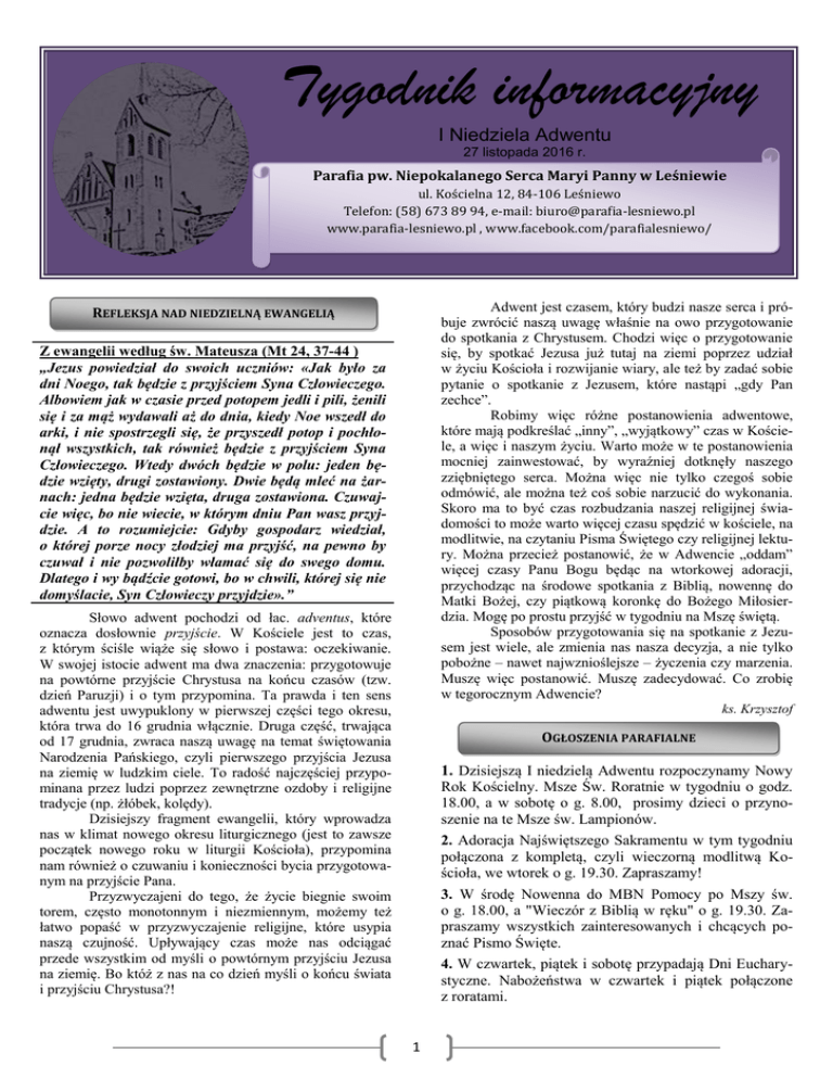 Tygodnik informacyjny I Niedziela Adwentu 27 listopada 2016 r. Parafia pw. Niepokalanego Serca Maryi Panny w Leśniewie ul. Kościelna 12, 84-106 Leśniewo Telefon: (58) 673 89 94, e-mail: [email protected] www.parafia-lesniewo.pl , www.facebook.com/parafialesniewo/ Adwent jest czasem, który budzi nasze serca i próbuje zwrócić naszą uwagę właśnie na owo przygotowanie do spotkania z Chrystusem. Chodzi więc o przygotowanie się, by spotkać Jezusa już tutaj na ziemi poprzez udział w życiu Kościoła i rozwijanie wiary, ale też by zadać sobie pytanie o spotkanie z Jezusem, które nastąpi „gdy Pan zechce”. Robimy więc różne postanowienia adwentowe, które mają podkreślać „inny”, „wyjątkowy” czas w Kościele, a więc i naszym życiu. Warto może w te postanowienia mocniej zainwestować, by wyraźniej dotknęły naszego zziębniętego serca. Można więc nie tylko czegoś sobie odmówić, ale można też coś sobie narzucić do wykonania. Skoro ma to być czas rozbudzania naszej religijnej świadomości to może warto więcej czasu spędzić w kościele, na modlitwie, na czytaniu Pisma Świętego czy religijnej lektury. Można przecież postanowić, że w Adwencie „oddam” więcej czasy Panu Bogu będąc na wtorkowej adoracji, przychodząc na środowe spotkania z Biblią, nowennę do Matki Bożej, czy piątkową koronkę do Bożego Miłosierdzia. Mogę po prostu przyjść w tygodniu na Mszę świętą. Sposobów przygotowania się na spotkanie z Jezusem jest wiele, ale zmienia nas nasza decyzja, a nie tylko pobożne – nawet najwznioślejsze – życzenia czy marzenia. Muszę więc postanowić. Muszę zadecydować. Co zrobię w tegorocznym Adwencie? REFLEKSJA NAD NIEDZIELNĄ EWANGELIĄ Z ewangelii według św. Mateusza (Mt 24, 37-44 ) „Jezus powiedział do swoich uczniów: «Jak było za dni Noego, tak będzie z przyjściem Syna Człowieczego. Albowiem jak w czasie przed potopem jedli i pili, żenili się i za mąż wydawali aż do dnia, kiedy Noe wszedł do arki, i nie spostrzegli się, że przyszedł potop i pochłonął wszystkich, tak również będzie z przyjściem Syna Człowieczego. Wtedy dwóch będzie w polu: jeden będzie wzięty, drugi zostawiony. Dwie będą mleć na żarnach: jedna będzie wzięta, druga zostawiona. Czuwajcie więc, bo nie wiecie, w którym dniu Pan wasz przyjdzie. A to rozumiejcie: Gdyby gospodarz wiedział, o której porze nocy złodziej ma przyjść, na pewno by czuwał i nie pozwoliłby włamać się do swego domu. Dlatego i wy bądźcie gotowi, bo w chwili, której się nie domyślacie, Syn Człowieczy przyjdzie».” Słowo adwent pochodzi od łac. adventus, które oznacza dosłownie przyjście. W Kościele jest to czas, z którym ściśle wiąże się słowo i postawa: oczekiwanie. W swojej istocie adwent ma dwa znaczenia: przygotowuje na powtórne przyjście Chrystusa na końcu czasów (tzw. dzień Paruzji) i o tym przypomina. Ta prawda i ten sens adwentu jest uwypuklony w pierwszej części tego okresu, która trwa do 16 grudnia włącznie. Druga część, trwająca od 17 grudnia, zwraca naszą uwagę na temat świętowania Narodzenia Pańskiego, czyli pierwszego przyjścia Jezusa na ziemię w ludzkim ciele. To radość najczęściej przypominana przez ludzi poprzez zewnętrzne ozdoby i religijne tradycje (np. żłóbek, kolędy). Dzisiejszy fragment ewangelii, który wprowadza nas w klimat nowego okresu liturgicznego (jest to zawsze początek nowego roku w liturgii Kościoła), przypomina nam również o czuwaniu i konieczności bycia przygotowanym na przyjście Pana. Przyzwyczajeni do tego, że życie biegnie swoim torem, często monotonnym i niezmiennym, możemy też łatwo popaść w przyzwyczajenie religijne, które usypia naszą czujność. Upływający czas może nas odciągać przede wszystkim od myśli o powtórnym przyjściu Jezusa na ziemię. Bo któż z nas na co dzień myśli o końcu świata i przyjściu Chrystusa?! ks. Krzysztof OGŁOSZENIA PARAFIALNE 1. Dzisiejszą I niedzielą Adwentu rozpoczynamy Nowy Rok Kościelny. Msze Św. Roratnie w tygodniu o godz. 18.00, a w sobotę o g. 8.00, prosimy dzieci o przynoszenie na te Msze św. Lampionów. 2. Adoracja Najświętszego Sakramentu w tym tygodniu połączona z kompletą, czyli wieczorną modlitwą Kościoła, we wtorek o g. 19.30. Zapraszamy! 3. W środę Nowenna do MBN Pomocy po Mszy św. o g. 18.00, a "Wieczór z Biblią w ręku" o g. 19.30. Zapraszamy wszystkich zainteresowanych i chcących poznać Pismo Święte. 4. W czwartek, piątek i sobotę przypadają Dni Eucharystyczne. Nabożeństwa w czwartek i piątek połączone z roratami. 1 5. W pierwszy czwartek miesiąca Msza św. wspólnotowa dla ministrantów z podsumowaniem minionego miesiąca i wręczeniem nagrody o g. 18.00. Prace należy składać do plebanii parafialnej. Ostateczny termin składania prac upływa w środę, 21 grudnia, o g. 20.00. Ogłoszenie wyników nastąpi tradycyjnie drugiego dnia Świąt – 26 grudnia, podczas Mszy świętej o g. 11.00. Główną nagrodą w konkursie jest 12-osobowy serwis obiadowy. 6. W pierwszy piątek miesiąca spowiedź dla dzieci g. 15.30, a o g. 16.30 nabożeństwo z obrzędem Komunii św., o g. 19.00 w salce spotkanie dla młodzieży. 7. Spowiedź dla młodzieży i dorosłych w piątek g. 17.00. INTENCJE MSZALNE poniedziałek 8. W sobotę Roraty o g. 8.00, po roratach Parafialny Zespół Caritas, podobnie jak w roku ubiegłym, zaprasza dzieci na kakao i coś słodkiego w salce przy kościele. po Mszy świętej, ok. g. 9.00 Nabożeństwo Żywego Różańca. W tym czasie okazja do spowiedzi. O g. 17.00 Msza św. z liturgią niedzielną. wtorek 9. Spotkanie Scholki dziecięcej w sobotę o g. 9.30, Lektorzy mają swoje spotkanie o g. 10.30, ministranci o g. 11.30. 10. Niedziela II Adwentu: Tradycyjnie przed kościołem w tym dniu zbieramy ofiary do puszek na rzecz pomocy Kościołowi na Wschodzie. 18.00 17.00 18.00 11. W zakrystii są do nabycia świ