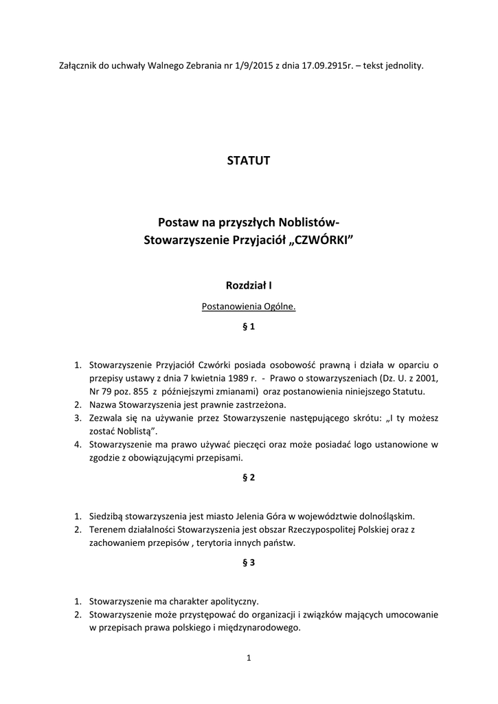 Załącznik do uchwały Walnego Zebrania nr 1/9/2015 z dnia 17.09.2915r. – tekst jednolity. STATUT Postaw na przyszłych NoblistówStowarzyszenie Przyjaciół „CZWÓRKI” Rozdział I Postanowienia Ogólne. §1 1. Stowarzyszenie Przyjaciół Czwórki posiada osobowość prawną i działa w oparciu o przepisy ustawy z dnia 7 kwietnia 1989 r. - Prawo o stowarzyszeniach (Dz. U. z 2001, Nr 79 poz. 855 z późniejszymi zmianami) oraz postanowienia niniejszego Statutu. 2. Nazwa Stowarzyszenia jest prawnie zastrzeżona. 3. Zezwala się na używanie przez Stowarzyszenie następującego skrótu: „I ty możesz zostać Noblistą”. 4. Stowarzyszenie ma prawo używać pieczęci oraz może posiadać logo ustanowione w zgodzie z obowiązującymi przepisami. §2 1. Siedzibą stowarzyszenia jest miasto Jelenia Góra w województwie dolnośląskim. 2. Terenem działalności Stowarzyszenia jest obszar Rzeczypospolitej Polskiej oraz z zachowaniem przepisów , terytoria innych państw. §3 1. Stowarzyszenie ma charakter apolityczny. 2. Stowarzyszenie może przystępować do organizacji i związków mających umocowanie w przepisach prawa polskiego i międzynarodowego. 1 §4 Stowarzyszenie opiera swoją działalność na pracy społecznej członków i wolontariuszy , a w zakresie niezbędnym również na pracy członków i innych osób, wykonywanej na zasadzie umowy o pracę czy umów prawa cywilnego. §5 Wszelkie działania w ramach Stowarzyszenia muszą cechować się pełną przejrzystością i jawnością, nie budzącą wątpliwości wśród jego członków i innych osób. Rozdział II Cele Stowarzyszenia i sposoby ich realizacji §6 Celem działania Stowarzyszenia jest w szczególności: 1. prowadzenie działalności na rzecz rozwoju oświatowego i kulturalnego , miasta, regionu i kraju. 2. inicjowanie, wspieranie i pomoc w realizowanych przedsięwzięciach edukacyjnokulturalnych, 3. działanie na rzecz swobodnego dostępu do informacji i edukacji, w tym także edukacji europejskiej, 4. działania na rzecz wyrównywania szans edukacyjnych dzieci i młodzieży , oraz osób dorosłych, 5. wspieranie uczniów zdolnych w zdobywaniu wykształcenia i ich wszechstronnym rozwoju, 6. inicjowanie i prowadzenie akcji ogólnospołecznych związanych z oświatą, kulturą fizyczną i ekologią, 7. współpraca z władzami państwowymi, samorządowymi i oświatowymi oraz organizacjami społecznymi, młodzieżowymi i gospodarczymi, 8. promowanie i popieranie przedsięwzięć przyczyniających się do konkurencyjności na rynku edukacyjnym a tym samym do podniesienia jakości edukacji, 9. działania na rzecz osób niepełnosprawnych 2 §7 Cele Stowarzyszenia są realizowane przez: a. organizację zajęć edukacyjnych , rekreacyjnych, kulturalnych, sportowych i innych oraz wypoczynków letnich i zimowych, b. organizowanie warsztatów twórczych , zajęć informatycznych, językowych, matematycznych – przyrodniczych, artystycznych, sportowych oraz wszelkich form wpierających rozwój i edukację dzieci i młodzieży oraz osób dorosłych, c. organizowanie konferencji, seminariów, szkoleń i wykładów, d. nawiązanie współpracy z innymi szkołami oraz Uczelniami, e. współpraca z krajowymi i zagranicznymi instytucjami i podmiotami, których pomoc organizacyjna i finansowa może przyczynić się do rozwoju Stowarzyszenia, f. organizowanie festynów i pokazów publicznych, g. organizowanie wypoczynku zimowego i letniego dla dzieci i młodzieży, h. podejmowanie działań posiadających w sobie aspekt podróży – poznawanie świata – integracja z Europą, i. podejmowanie wszelkich innych przedsięwzięć związanych z rozwojem Stowarzyszenia. Rozdział III Członkowie Stowarzyszenia, ich prawa i obowiązki §8 Członkami Stowarzyszenia mogą być osoby fizyczne i prawne. §9 Członkowie Stowarzyszenia dzielą się na: 1. Członków zwyczajnych; 2. Członków honorowych; 3 § 10 Członkiem zwyczajnym może być obywatel polski oraz cudzoziemiec mający pełną zdolność do czynności prawnych, pragnący realizować cele Stowarzyszenia. § 11 1. Członkowie zwyczajni mają prawo: a) wybierać i być wybieranym do władz Stowarzyszenia; b) uczestniczyć w zebraniach, konferencjach i innych formach działalności Stowarzyszenia; c) uczestniczyć w Walnych Zgromadzeniach; d) zgłaszać władzą Stowarzyszenia wnioski w sprawach związanych z celami i działalnością Stowarzyszenia; e) głosować we wszystkich sprawach poddanych pod głosowanie. 2. Członek zwyczajny Stowarzyszenia jest zobowiązany: a. b. c. d. e. f. aktywnie uczestniczyć w działalności Stowarzyszenia; realizować postanowienia statutu i uchwał władz Stowarzyszenia; propagować cele Stowarzyszenia; troszczyć się o dobro i rozwój Stowarzyszenia; regularnie opłacać składkę członkowską; dbać o dobre imię Stowarzyszenia. § 12 1. Członkiem honorowym, za jego zgodą, może być osoba fizyczna lub prawna, która swoim działaniem lub autorytetem wybitnie wspiera działania Stowarzyszenia. 2. Tytuł Honorowego Członka można przyznać członkom, a także osobom nienależącym do Stowarzyszenia (w tym cudzoziemcom), którzy swą działalnością społeczną, zawodową lub naukową przyczynili się do podniesienia rangi Stowarzyszenia. 3. Uchwałę o nadaniu tej godności podejmuje Walne Zebranie Członków na wniosek Zarządu większością ¾ głosów przy obecności przynajmniej 50% uprawnionych do głosowania. 4. Członek honorowy ma wszystkie prawa członka zwyczajnego Stowarzyszenia. 5. Członek honorowy jest zwolniony z obowiązku płacenia składki członkowskiej. 6. Pozostałe obowiązki członka honorowego są takie same jak członka zwyczajnego. 7. Członkostwo honorowe ustaje na skutek uchwały Walnego Zgromadzenia Członków na wniosek Zarządu lub Komisji Rewizyjnej. 4 § 13 1. Członkostwo zwyczajne nabywa się przez: a) złożenie deklaracji pisemnej; b) uiszczenie wpisowego w wysokości ustalonej przez Walne zgromadze