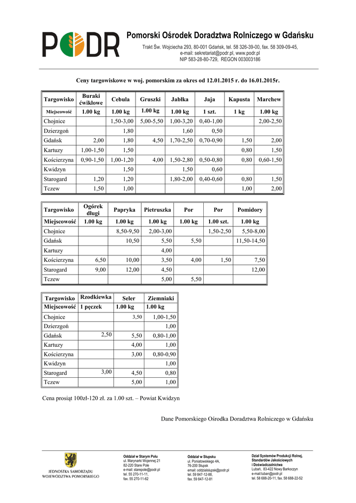 Pomorski Ośrodek Doradztwa Rolniczego w Gdańsku Trakt Św. Wojciecha 293, 80-001 Gdańsk, tel. 58 326-39-00, fax. 58 309-09-45, e-mail: [email protected], www.podr.pl NIP 583-28-80-729, REGON 003003186 Ceny targowiskowe w woj. pomorskim za okres od 12.01.2015 r. do 16.01.2015r. Targowisko Miejscowość Buraki ćwikłowe 1.00 kg Chojnice Cebula Gruszki Jabłka Jaja Kapusta Marchew 1.00 kg 1.00 kg 1.00 kg 1 szt. 1 kg 1.00 kg 1,50-3,00 5,00-5,50 1,00-3,20 0,40-1,00 1,60 0,50 1,70-2,50 0,70-0,90 Dzierzgoń 1,80 Gdańsk 2,00 1,80 Kartuzy 1,00-1,50 1,50 Kościerzyna 0,90-1,50 1,00-1,20 Kwidzyn 1,50-2,80 0,50-0,80 1,50 1,50 0,60 1,80-2,00 0,40-0,60 Starogard 1,20 1,20 Tczew 1,50 1,00 Targowisko Miejscowość Ogórek długi 1.00 kg Chojnice Gdańsk 4,50 4,00 0,80 1,50 0,80 0,60-1,50 0,80 1,50 1,00 2,00 Por Por Pomidory 1.00 kg 1.00 kg 1.00 kg 1.00 szt. 1.00 kg 8,50-9,50 2,00-3,00 1,50-2,50 5,50-8,00 10,50 5,50 5,50 11,50-14,50 4,00 6,50 10,00 3,50 Starogard 9,00 12,00 4,50 Tczew 5,00 Targowisko Rzodkiewka Seler Miejscowość 1 pęczek 1.00 kg Chojnice 3,50 4,00 1,50 7,50 12,00 5,50 Ziemniaki 1.00 kg 1,00-1,50 Dzierzgoń 1,00 2,50 5,50 0,80-1,00 Kartuzy 4,00 1,00 Kościerzyna 3,00 0,80-0,90 Kwidzyn Tczew 2,00 Pietruszka Kościerzyna Starogard 1,50 Papryka Kartuzy Gdańsk 2,00-2,50 1,00 3,00 4,50 0,80 5,00 1,00 Cena prosiąt 100zł-120 zł. za 1.00 szt. – Powiat Kwidzyn Dane Pomorskiego Ośrodka Doradztwa Rolniczego w Gdańsku Oddział w Starym Polu ul. Marynarki Wojennej 21 82-220 Stare Pole e-mail: [email protected] tel. 55 270-11-11, fax. 55 270-11-62 Oddział w Słupsku ul. Poniatowskiego 4A, 76-200 Słupsk email: [email protected] tel. 59 847-12-88, fax. 59 847-12-81 Dział Systemów Produkcji Rolnej, Standardów Jakościowych i Doświadczalnictwa Lubań, 83-422 Nowy Barkoczyn e-mail:[email protected] tel. 58 688-20-11, fax. 58 688-22-52