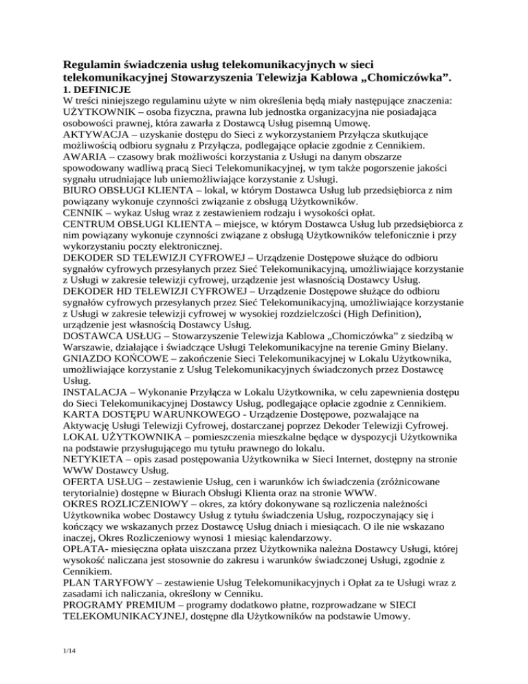 Regulamin świadczenia usług telekomunikacyjnych w sieci telekomunikacyjnej Stowarzyszenia Telewizja Kablowa „Chomiczówka”. 1. DEFINICJE W treści niniejszego regulaminu użyte w nim określenia będą miały następujące znaczenia: UŻYTKOWNIK – osoba fizyczna, prawna lub jednostka organizacyjna nie posiadająca osobowości prawnej, która zawarła z Dostawcą Usług pisemną Umowę. AKTYWACJA – uzyskanie dostępu do Sieci z wykorzystaniem Przyłącza skutkujące możliwością odbioru sygnału z Przyłącza, podlegające opłacie zgodnie z Cennikiem. AWARIA – czasowy brak możliwości korzystania z Usługi na danym obszarze spowodowany wadliwą pracą Sieci Telekomunikacyjnej, w tym także pogorszenie jakości sygnału utrudniające lub uniemożliwiające korzystanie z Usługi. BIURO OBSŁUGI KLIENTA – lokal, w którym Dostawca Usług lub przedsiębiorca z nim powiązany wykonuje czynności związanie z obsługą Użytkowników. CENNIK – wykaz Usług wraz z zestawieniem rodzaju i wysokości opłat. CENTRUM OBSŁUGI KLIENTA – miejsce, w którym Dostawca Usług lub przedsiębiorca z nim powiązany wykonuje czynności związane z obsługą Użytkowników telefonicznie i przy wykorzystaniu poczty elektronicznej. DEKODER SD TELEWIZJI CYFROWEJ – Urządzenie Dostępowe służące do odbioru sygnałów cyfrowych przesyłanych przez Sieć Telekomunikacyjną, umożliwiające korzystanie z Usługi w zakresie telewizji cyfrowej, urządzenie jest własnością Dostawcy Usług. DEKODER HD TELEWIZJI CYFROWEJ – Urządzenie Dostępowe służące do odbioru sygnałów cyfrowych przesyłanych przez Sieć Telekomunikacyjną, umożliwiające korzystanie z Usługi w zakresie telewizji cyfrowej w wysokiej rozdzielczości (High Definition), urządzenie jest własnością Dostawcy Usług. DOSTAWCA USŁUG – Stowarzyszenie Telewizja Kablowa „Chomiczówka” z siedzibą w Warszawie, działające i świadczące Usługi Telekomunikacyjne na terenie Gminy Bielany. GNIAZDO KOŃCOWE – zakończenie Sieci Telekomunikacyjnej w Lokalu Użytkownika, umożliwiające korzystanie z Usług Telekomunikacyjnych świadczonych przez Dostawcę Usług. INSTALACJA – Wykonanie Przyłącza w Lokalu Użytkownika, w celu zapewnienia dostępu do Sieci Telekomunikacyjnej Dostawcy Usług, podlegające opłacie zgodnie z Cennikiem. KARTA DOSTĘPU WARUNKOWEGO - Urządzenie Dostępowe, pozwalające na Aktywację Usługi Telewizji Cyfrowej, dostarczanej poprzez Dekoder Telewizji Cyfrowej. LOKAL UŻYTKOWNIKA – pomieszczenia mieszkalne będące w dyspozycji Użytkownika na podstawie przysługującego mu tytułu prawnego do lokalu. NETYKIETA – opis zasad postępowania Użytkownika w Sieci Internet, dostępny na stronie WWW Dostawcy Usług. OFERTA USŁUG – zestawienie Usług, cen i warunków ich świadczenia (zróżnicowane terytorialnie) dostępne w Biurach Obsługi Klienta oraz na stronie WWW. OKRES ROZLICZENIOWY – okres, za który dokonywane są rozliczenia należności Użytkownika wobec Dostawcy Usług z tytułu świadczenia Usług, rozpoczynający się i kończący we wskazanych przez Dostawcę Usług dniach i miesiącach. O ile nie wskazano inaczej, Okres Rozliczeniowy wynosi 1 miesiąc kalendarzowy. OPŁATA- miesięczna opłata uiszczana przez Użytkownika należna Dostawcy Usługi, której wysokość naliczana jest stosownie do zakresu i warunków świadczonej Usługi, zgodnie z Cennikiem. PLAN TARYFOWY – zestawienie Usług Telekomunikacyjnych i Opłat za te Usługi wraz z zasadami ich naliczania, określony w Cenniku. PROGRAMY PREMIUM – programy dodatkowo płatne, rozprowadzane w SIECI TELEKOMUNIKACYJNEJ, dostępne dla Użytkowników na podstawie Umowy. 1/14 PRZEDSTAWICIEL DOSTAWCY USŁUG – osoba lub firma występująca w imieniu Dostawcy Usług, posiadająca identyfikator i upoważnienie Dostawcy Usług do wykonywania stosownych czynności. PRZYŁĄCZE – część Sieci Telekomunikacyjnej wraz z Urządzeniem abonenckim umiejscowiona w Lokalu Użytkownika, stanowiącej własność Dostawcy Usług. SIEĆ TELEKOMUNIKACYJNA (SIEĆ) – zespół urządzeń i linii telekomunikacyjnych, służących m.in. do świadczenia Usługi. SPRZĘT ODBIORCZY – urządzenie końcowe będące własnością Użytkownika, służące do odbioru sygnału (tj. telewizyjnego, internetowego) dostarczanego przez Dostawcę Usług za pomocą Sieci Telekomunikacyjnej oraz Urządzenia Użytkownika np. odbiornik telewizyjny, radiowy, aparat telefoniczny, komputer). UMOWA – pisemne, zgodne oświadczenie woli Użytkownika oraz Dostawcy Usług, na mocy którego Dostawca Usług zapewnia Użytkownikowi odpłatnie świadczenie Usługi. URZĄDZENIE DOSTĘPOWE – urządzenie telekomunikacyjne będące własnością Dostawcy Usług niezbędne do dostarczenia Usługi lub Usług Dodatkowych, np. modem kablowy, Dekoder (w tym Dekoder Programu Premium, oraz Dekoder Telewizji Cyfrowej z Kartą Dostępu Warunkowego). USŁUGI – wszelkie usługi dostarczane przez Dostawcę Usług (tj. telewizja analogowa, dostęp do Internetu, telewizja cyfrowa), dostępne w ramach istniejących możliwości technicznych. USŁUGI DODATKOWE – Usługi świadczone przez Dostawcę Usług na rzecz Użytkownika, powiązane z Usługą, wymienione w Cenniku. ZAWIESZENIE ŚWIADCZENIA USŁUGI – czasowe zaprzestanie świadczenia Usługi lub jej części, w szczególności Usług Dodatkowych, z jednoczesną rezerwacją na rzecz Użytkownika zasobów technicznych SIECI TELEKOMUNIKACYJNEJ niezbędnych do jej wznowienia. 2. WARUNKI ZAWARCIA UMOWY, PROMOCJE 2.1. Przez zawarcie Umowy Dostawca Usługi zobowiązuje się świadczyć Usługę za pośrednictwem Sieci Telekomunikacyjnej zgodnie z Umową i Regulaminem, a Użytkownik zobowiązuje się do terminowego regulowania płatności oraz do przestrzegania postanowień Umowy i Regulaminu. 2.2. Umowa zostaje zawarta w formie pisemnej, po spełnieniu przez Użytkownika wymogów zawartych w Regulaminie. 2.3 Dostawca Us