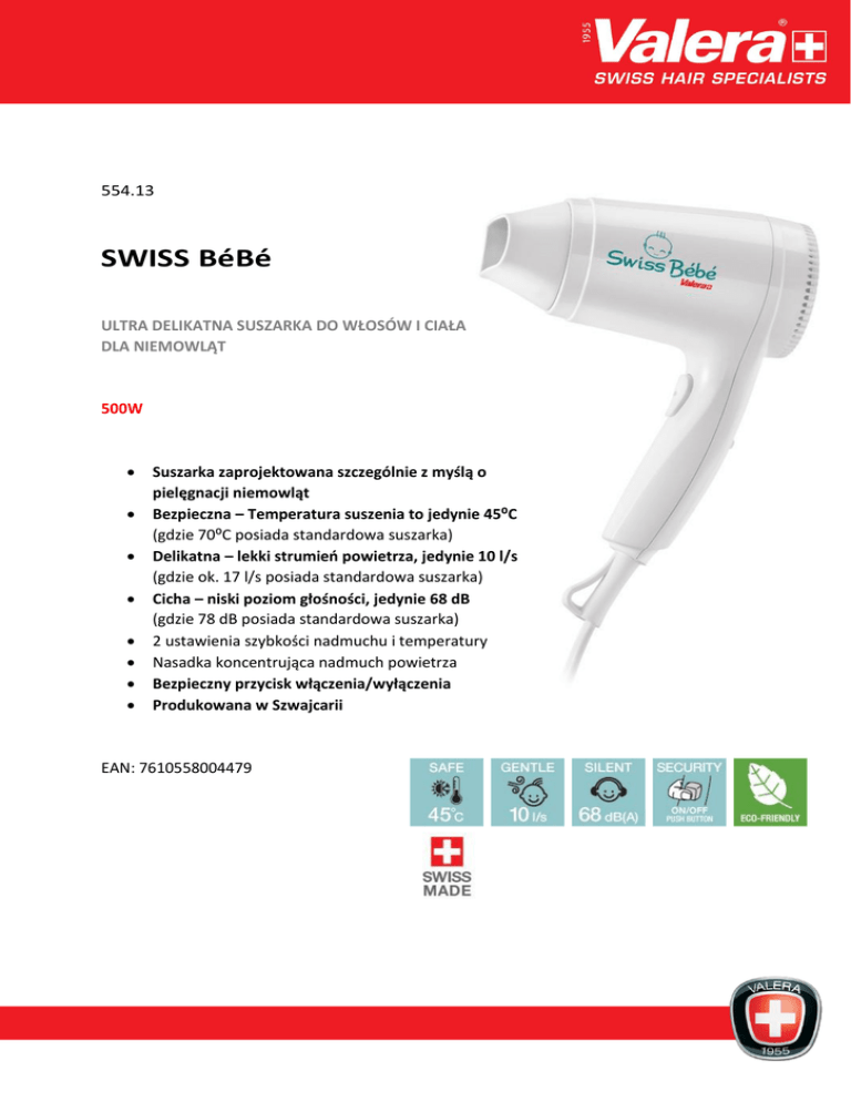 554.13 SWISS BéBé ULTRA DELIKATNA SUSZARKA DO WŁOSÓW I CIAŁA DLA NIEMOWLĄT 500W Suszarka zaprojektowana szczególnie z myślą o pielęgnacji niemowląt Bezpieczna – Temperatura suszenia to jedynie 45⁰C (gdzie 70⁰C posiada standardowa suszarka) Delikatna – lekki strumień powietrza, jedynie 10 l/s (gdzie ok. 17 l/s posiada standardowa suszarka) Cicha – niski poziom głośności, jedynie 68 dB (gdzie 78 dB posiada standardowa suszarka) 2 ustawienia szybkości nadmuchu i temperatury Nasadka koncentrująca nadmuch powietrza Bezpieczny przycisk włączenia/wyłączenia Produkowana w Szwajcarii EAN: 7610558004479