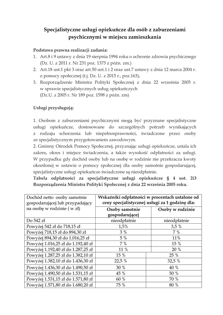 Specjalistyczne usługi opiekuńcze dla osób z zaburzeniami psychicznymi w miejscu zamieszkania Podstawa prawna realizacji zadania: 1. Art.8 i 9 ustawy z dnia 19 sierpnia 1994 roku o ochronie zdrowia psychicznego (Dz. U. z 2011 r. Nr 231 poz. 1375 z późn. zm.) 2. Art.18 ust.1 pkt 3 oraz art.50 ust.1 i 2 oraz ust.7 ustawy z dnia 12 marca 2004 r. o pomocy społecznej (t.j. Dz. U. z 2015 r., poz.163), 3. Rozporządzenie Ministra Polityki Społecznej z dnia 22 września 2005 r. w sprawie specjalistycznych usług opiekuńczych (Dz.U. z 2005 r. Nr 189 poz. 1598 z późn. zm) Usługi przysługują: 1. Osobom z zaburzeniami psychicznymi mogą być przyznane specjalistyczne usługi opiekuńcze, dostosowane do szczególnych potrzeb wynikających z rodzaju schorzenia lub niepełnosprawności, świadczone przez osoby ze specjalistycznym przygotowaniem zawodowym. 2. Gminny Ośrodek Pomocy Społecznej, przyznając usługi opiekuńcze, ustala ich zakres, okres i miejsce świadczenia, a także wysokość odpłatności za usługi. W przypadku gdy dochód osoby lub na osobę w rodzinie nie przekracza kwoty określonej w ustawie o pomocy społecznej dla osoby samotnie gospodarującej, specjalistyczne usługi opiekuńcze świadczone są nieodpłatnie. Tabela odpłatności za specjalistyczne usługi opiekuńcze § 4 ust. 2i3 Rozporządzenia Ministra Polityki Społecznej z dnia 22 września 2005 roku. Dochód netto osoby samotnie gospodarującej lub przypadający na osobę w rodzinie ( w zł) Do 542 zł Powyżej 542 zł do 718,15 zł Powyżej 718,15 zł do 894,30 zł Powyżej 894,30 zł do 1.016,25 zł Powyżej 1.016,25 zł do 1.192,40 zł Powyżej 1.192,40 zł do 1.287,25 zł Powyżej 1.287,25 zł do 1.382,10 zł Powyżej 1.382,10 zł do 1.436,30 zł Powyżej 1.436,30 zł do 1.490,50 zł Powyżej 1.490,50 zł do 1.531,15 zł Powyżej 1.531,15 zł do 1.571,80 zł Powyżej 1.571,80 zł do 1.680,20 zł Wskaźniki odpłatności w procentach ustalone od ceny specjalistycznej usługi za 1 godzinę dla: Osoby samotnie gospodarującej nieodpłatnie 1,5% 3% 5% 7% 11 % 15 % 22,5 % 30 % 45 % 60 % 75 % Osoby w rodzinie nieodpłatnie 3,5 % 7% 11% 15 % 20 % 25 % 32,5 % 40 % 50 % 70 % 80 % Powyżej 1.680,20 zł do 1.788,60 zł Powyżej 1.788,60 zł 90 % 100 % 100 % 100% Rodzaje specjalistycznych usług opiekuńczych: 1. Uczenie i rozwijanie umiejętności niezbędnych do samodzielnego życia, w tym: kształtowanie umiejętności zaspokajania podstawowych potrzeb życiowych i umiejętności społecznego funkcjonowania, motywowanie do aktywności, leczenia i rehabilitacji, prowadzenie treningów umiejętności samoobsługi i umiejętności społecznych oraz wspieranie, także w formie asystowania w codziennych czynnościach życiowych, w szczególności takich jak: ◦ samoobsługa, zwłaszcza wykonywanie czynności gospodarczych i porządkowych, w tym umiejętności utrzymania i prowadzenia domu, ◦ dbałość o higienę i wygląd, ◦ utrzymanie kontaktów z domownikami, rówieśnikami, w miejscu nauki i pracy oraz ze społecznością lokalną, ◦ wspólne organizowanie i spędzanie czasu wolnego, ◦ korzystanie z usług różnych instytucji, interwencje i pomoc w życiu rodzinie, w tym: ◦ pomoc w radzeniu sobie w sytuacjach kryzysowych - poradnictwo specjalistyczne, interwencje kryzysowe, wsparcie psychologiczne, rozmowy terapeutyczne, ◦ ułatwienie dostępu do edukacji i kultury, ◦ doradztwo, koordynacja działań innych służb na rzecz rodziny, którejczłonkiem jest osoba uzyskująca pomoc w formie specjalistycznych usług, ◦ kształtowanie pozytywnych relacji osoby wspieranej z osobami bliskimi, ◦ współpraca z rodziną, - kształtowanie odpowiednich postaw wobec osoby chorującej, niepełnosprawnej, pomoc w załatwianiu spraw urzędowych, w tym: ◦ w uzyskaniu świadczeń socjalnych, emerytalno - rentowych. ◦ w wypełnianiu dokumentów urzędowych, wspieranie i pomoc w uzyskaniu zatrudnienia, w tym zwłaszcza: ◦ w szukaniu informacji o pracy, pomoc w znalezieniu zatrudnienia lub alternatywnego zajęcia, w szczególności uczestnictwo w zajęciach warsztatów terapii zajęciowej, zakładach aktywności zawodowej, środowiskowych domach samopomocy, centrach i klubach integracji społecznej, klubach pracy, ◦ w kompletowaniu dokumentów potrzebnych do zatrudnienia, ◦ w przygotowaniu do rozmowy z pracodawcą, wspieranie i asystowanie w kontaktach pracodawcą, ◦ w rozwiązywaniu problemów psychicznych wynikających z pracy lub jej braku, pomoc w gospodarowaniu pieniędzmi, w tym: ◦ nauka planowania budżetu, asystowanie przy ponoszeniu wydatków, ◦ pomoc w uzyskaniu ulg w opłatach, ◦ zwiększanie umiejętności gospodarowania własnym budżetem oraz usamodzielnienie finansowe. 2. Pielęgnacja - jako wspieranie procesu leczenia, w tym: pomoc w dostępie do świadczeń zdrowotnych, uzgadnianie i pilnowanie terminów wizyt lekarskich, badań diagnostycznych, pomoc w wykupywaniu lub zamawianiu leków w aptece, pilnowanie przyjmowania leków oraz obserwowanie ewentualnych skutków ubocznych ich stosowania, w szczególnie uzasadnionych przypadkach zmiana opatrunków, pomoc w użyciu środków pomocniczych i materiałów medycznych, przedmiotów ortopedycznych, a także w utrzymaniu higieny, pomoc w dotarciu do placówek służby zdrowia, pomoc w dotarciu do placówek rehabilitacyjnych. 3. Rehabilitacja fizyczna i usprawnianie zaburzonych funkcji organizmu w zakresie nieobjętym przepisami ustawy z dnia 27 sierpnia 2004 r. o świadczeniach opieki zdrowotnej finansowanych ze środków publicznych (Dz. U. Nr 210, poz. 2135 z późn. zm.): zgodnie z zaleceniami lekarskimi lub specjalisty z zakresu rehabilitacji ruchowej lub fizjoterapii, współpraca ze specjalistami w zakresie wspierania psychologicznopedagogicznego i edukacyjno-terapeutycznego zmierzającego do wielostronnej aktywizacji osoby korzystającej ze specjalistycznych usług. 4. Pomoc mieszkaniowa, w tym: w uzyskaniu mieszkania, negoc