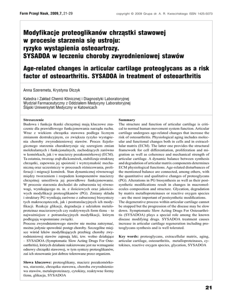 &ARM0RZEGL.AUK COPYRIGHT'RUPADR!2+WIECIÊSKIEGO)33. -ODYFIKACJEPROTEOGLIKANÌWCHRZSTKISTAWOWEJ WPROCESIESTARZENIASIÃUSTROJU RYZYKOWYSTPIENIAOSTEOARTROZY 393!$/!WLECZENIUCHOROBYZWYRODNIENIOWEJSTAWÌW !GERELATEDCHANGESINARTICULARCARTILAGEPROTEOGLYCANSASARISK FACTOROFOSTEOARTHRITIS393!$/!INTREATMENTOFOSTEOARTHRITIS !NNA3ZEREMETA+RYSTYNA/LCZYK +ATEDRAI:AKAD#HEMII+LINICZNEJI$IAGNOSTYKI,ABORATORYJNEJ 7YDZIA&ARMACEUTYCZNYZ/DDZIAEM-EDYCYNY,ABORATORYJNEJ gLSKI5NIWERSYTET-EDYCZNYW+ATOWICACH Streszczenie Budowa i funkcja tkanki chrzęstnej mają kluczowe znaczenie dla prawidłowego funkcjonowania narządu ruchu. Wraz z wiekiem chrząstka stawowa podlega licznym zmianom destrukcyjnym, co zwiększa ryzyko wystąpienia choroby zwyrodnieniowej stawów. Proces fizjologicznego starzenia charakteryzuje się szeregiem zmian molekularnych i funkcjonalnych, zachodzących zarówno w komórkach, jak i w macierzy pozakomórkowej (ECM). Ta ostatnia, tworząc zrąb dla komórek, stabilizuje strukturę chrząstki, zapewnia jej spoistość i wytrzymałość mechaniczną oraz uczestniczy w procesach różnicowania, proliferacji i migracji komórek. Stan dynamicznej równowagi między tworzeniem i rozpadem komponentów macierzy chrzęstnej umożliwia jej prawidłowe funkcjonowanie. W procesie starzenia dochodzi do zaburzenia tej równowagi, wynikającego m. in. z ilościowych oraz jakościowych modyfikacji proteoglikanów (PG). Zmiany składu i struktury PG wynikają zarówno z zaburzonej biosyntezy tych makrocząsteczek, jak i postranslacyjnych ich modyfikacji. Reakcje glikacji, degradacja z udziałem metaloproteinaz macierzowych czy reaktywnych form tlenu – to najważniejsze z potranslacyjnych modyfikacji, którym podlegają wspomniane związki. Procesu zwyrodnieniowego stawów nie można zatrzymać, można jedynie spowolnić postęp choroby. Szczególne miejsce wśród leków modyfikujących przebieg choroby zwyrodnieniowej stawów zajmują leki, tzw. wolno działające – SYSADOA (Symptomatic Slow Acting Drugs For Osteoarthritis), których działanie nakierowane jest na wzmaganie odnowy chrząstki stawowej, w tym syntezy proteoglikanów, zaś ich stosowanie jest dobrze tolerowane przez organizm. Summary The structure and function of articular cartilage is critical to normal human movement system function. Articular cartilage undergoes age-related changes that increase the risk of osteoarthritis. Physiological aging includes molecular and functional changes both in cells and in extracellular matrix (ECM). The latter one provides the structural framework for cell differentiation, proliferation and migration as well as coherence and mechanical strength of articular cartilage. A dynamic balance between synthesis and degradation of articular matrix components determines ECM physiological functions. Age-related disturbances of the mentioned balance are connected, among others, with the quantitative and qualitative changes of proteoglycans (PG). Alterations in PG biosynthesis as well as their postsynthetic modifications result in changes in macromolecules composition and structure. Glycation, degradation by matrix metalloproteinases or reactive oxygen species – are the most important of postsynthetic modifications. The degenerative process within articular cartilage cannot be stopped but the progression of the disease may be slow down. Symptomatic Slow Acting Drugs For Osteoarthritis (SYSADOA) plays a special role among the known disease modifying drugs. SYSADOA treatment causes increase in articular cartilage regeneration including proteoglycans synthesis and is well tolerated. Key words: proteoglycans, extracellular matrix, aging, articular cartilage, osteoarthritis, metalloproteinases, cytokines, reactive oxygen species, glycation, SYSADOA Słowa kluczowe: proteoglikany, macierz pozakomórkowa, starzenie, chrząstka stawowa, choroba zwyrodnieniowa stawów, metaloproteinazy, cytokiny, reaktywne formy tlenu, glikacja, SYSADOA &ARM0RZEGL.AUK Wykaz skrótów: ADAMTS – dezintegrynowa i metaloproteinazowa domena z modułem trombospondyny (a disintegrin and metalloproteinase domain, with thrombospondin type-1 motifs); AGE – późne produkty glikacji (advanced glycation end-products); ChZS – choroba zwyrodnieniowa stawów; COX2 – cyklooksygenza – 2; CS – siarczan chondroityny; ECM – macierz pozakomórkowa (extracellular matrix); GAG – glikozoaminoglikany (glycosoaminoglycans); HA – kwas hialuronowy (hyaluronic acid); IGF – insulinopodobny czynnik wzrostowy (insulin-like growth factor); IGFB – białko wiążące insulinopodobny czynnik wzrostowy (Insulin-like Growth Factor Binding Protein); IL – interleukina (interleukin); KS – siarczan keratanu; iNOS – indukowalna syntaza tlenku azotu; MMP – metaloproteinazy (metalloproteinases); NF-κB – jądrowy czynnik kappa B (nuclear factor kappa B); NLPZ – niesteroidowe leki przeciwzapalne; PG – proteoglikany (proteoglycans); PGE2 – prostaglandyna – 2; RAGE – receptory wiążące późne produkty glikacji (the receptor for advanced glycation end products); RFT – reaktywne formy tlenu (reactive oxygen species); SLRP – małe proteoglikany bogate w reszty leucyny (small leucine-rich repeat proteoglycans); SYSADOA – wolno działające leki objawowe stosowane w leczeniu osteoartrozy (Symptomatic Slow Acting Drugs For Osteoarthritis); TGF – transformujący czynnik wzrostowy (transforming growth factor); TIMP – tkankowe inhibitory metaloproteinaz (tissue inhibitors of metalloproteinases); TNF – czynnik martwicy nowotworów (tumor necrosis factor). ' Ö Starzenie się jest nieuniknionym, złożonym i długotrwałym procesem fizjologicznym, charakteryzującym się stopniowym zmniejszaniem sprawności czynnościowej wszystkich tkanek i narządów, jak i obniżaniem wydajności mechanizmów adaptacyjnych ustroju do zmieniających się warunków środowiskowych [1 – 7]. Proces ten związany jest z powolnymi, nieodwracalnymi zmianami deg