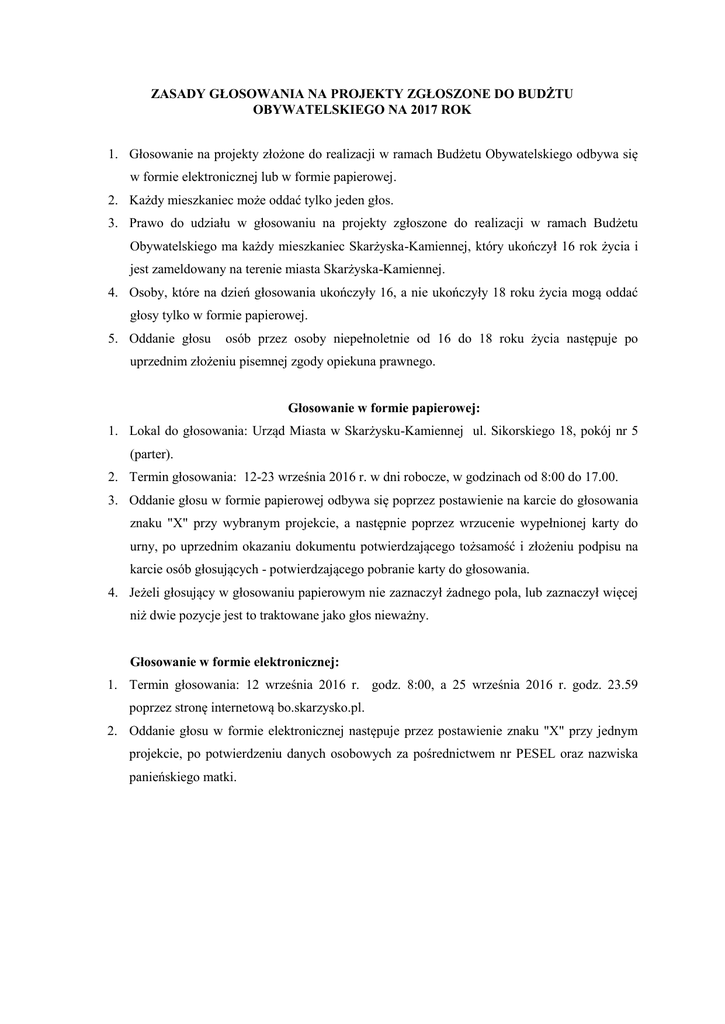 ZASADY GŁOSOWANIA NA PROJEKTY ZGŁOSZONE DO BUDŻTU OBYWATELSKIEGO NA 2017 ROK 1. Głosowanie na projekty złożone do realizacji w ramach Budżetu Obywatelskiego odbywa się w formie elektronicznej lub w formie papierowej. 2. Każdy mieszkaniec może oddać tylko jeden głos. 3. Prawo do udziału w głosowaniu na projekty zgłoszone do realizacji w ramach Budżetu Obywatelskiego ma każdy mieszkaniec Skarżyska-Kamiennej, który ukończył 16 rok życia i jest zameldowany na terenie miasta Skarżyska-Kamiennej. 4. Osoby, które na dzień głosowania ukończyły 16, a nie ukończyły 18 roku życia mogą oddać głosy tylko w formie papierowej. 5. Oddanie głosu osób przez osoby niepełnoletnie od 16 do 18 roku życia następuje po uprzednim złożeniu pisemnej zgody opiekuna prawnego. Głosowanie w formie papierowej: 1. Lokal do głosowania: Urząd Miasta w Skarżysku-Kamiennej ul. Sikorskiego 18, pokój nr 5 (parter). 2. Termin głosowania: 12-23 września 2016 r. w dni robocze, w godzinach od 8:00 do 17.00. 3. Oddanie głosu w formie papierowej odbywa się poprzez postawienie na karcie do głosowania znaku "X" przy wybranym projekcie, a następnie poprzez wrzucenie wypełnionej karty do urny, po uprzednim okazaniu dokumentu potwierdzającego tożsamość i złożeniu podpisu na karcie osób głosujących - potwierdzającego pobranie karty do głosowania. 4. Jeżeli głosujący w głosowaniu papierowym nie zaznaczył żadnego pola, lub zaznaczył więcej niż dwie pozycje jest to traktowane jako głos nieważny. Głosowanie w formie elektronicznej: 1. Termin głosowania: 12 września 2016 r. godz. 8:00, a 25 września 2016 r. godz. 23.59 poprzez stronę internetową bo.skarzysko.pl. 2. Oddanie głosu w formie elektronicznej następuje przez postawienie znaku "X" przy jednym projekcie, po potwierdzeniu danych osobowych za pośrednictwem nr PESEL oraz nazwiska panieńskiego matki.