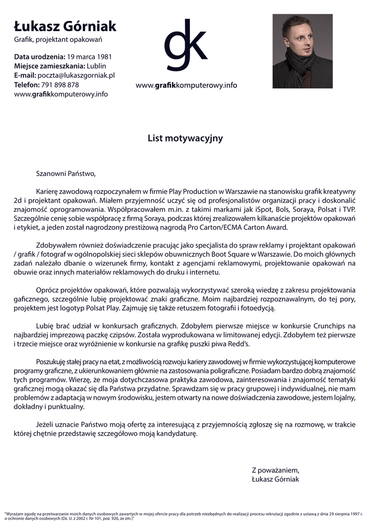 Łukasz Górniak Grafik, projektant opakowań Data urodzenia: 19 marca 1981 Miejsce zamieszkania: Lublin E-mail: [email protected] Telefon: 791 898 878 www.grafikkomputerowy.info List motywacyjny Szanowni Państwo, Karierę zawodową rozpoczynałem w firmie Play Production w Warszawie na stanowisku grafik kreatywny 2d i projektant opakowań. Miałem przyjemność uczyć się od profesjonalistów organizacji pracy i doskonalić znajomość oprogramowania. Współpracowałem m.in. z takimi markami jak iSpot, Bols, Soraya, Polsat i TVP. Szczególnie cenię sobie współpracę z firmą Soraya, podczas której zrealizowałem kilkanaście projektów opakowań i etykiet, a jeden został nagrodzony prestiżową nagrodą Pro Carton/ECMA Carton Award. Zdobywałem również doświadczenie pracując jako specjalista do spraw reklamy i projektant opakowań / grafik / fotograf w ogólnopolskiej sieci sklepów obuwnicznych Boot Square w Warszawie. Do moich głównych zadań należało dbanie o wizerunek firmy, kontakt z agencjami reklamowymi, projektowanie opakowań na obuwie oraz innych materiałów reklamowych do druku i internetu. Oprócz projektów opakowań, które pozwalają wykorzystywać szeroką wiedzę z zakresu projektowania gaficznego, szczególnie lubię projektować znaki graficzne. Moim najbardziej rozpoznawalnym, do tej pory, projektem jest logotyp Polsat Play. Zajmuję się także retuszem fotografii i fotoedycją. Lubię brać udział w konkursach graficznych. Zdobyłem pierwsze miejsce w konkursie Crunchips na najbardziej imprezową paczkę czipsów. Została wyprodukowana w limitowanej edycji. Zdobyłem też pierwsze i trzecie miejsce oraz wyróżnienie w konkursie na grafikę puszki piwa Redd’s. Poszukuję stałej pracy na etat, z możliwością rozwoju kariery zawodowej w firmie wykorzystującej komputerowe programy graficzne, z ukierunkowaniem głównie na zastosowania poligraficzne. Posiadam bardzo dobrą znajomość tych programów. Wierzę, że moja dotychczasowa praktyka zawodowa, zainteresowania i znajomość tematyki graficznej mogą okazać się dla Państwa przydatne. Sprawdzam się w pracy grupowej i indywidualnej, nie mam problemów z adaptacją w nowym środowisku, jestem otwarty na nowe doświadczenia zawodowe, jestem lojalny, dokładny i punktualny. Jeżeli uznacie Państwo moją ofertę za interesującą z przyjemnością zgłoszę się na rozmowę, w trakcie której chętnie przedstawię szczegółowo moją kandydaturę. Z poważaniem, Łukasz Górniak "Wyrażam zgodę na przetwarzanie moich danych osobowych zawartych w mojej ofercie pracy dla potrzeb niezbędnych do realizacji procesu rekrutacji zgodnie z ustawą z dnia 29 sierpnia 1997 r. o ochronie danych osobowych (Dz. U. z 2002 r. Nr 101, poz. 926, ze zm.)"