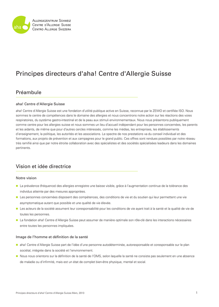 Principes directeurs d'aha! Centre d'Allergie Suisse Préambule aha! Centre d'Allergie Suisse aha! Centre d'Allergie Suisse est une fondation d’utilité publique active en Suisse, reconnue par le ZEWO et certifiée ISO. Nous sommes le centre de compétences dans le domaine des allergies et nous concentrons notre action sur les réactions des voies respiratoires, du système gastro-intestinal et de la peau aux stimuli environnementaux. Nous nous présentons publiquement comme centre pour les allergies suisse et nous sommes un lieu d’accueil indépendant pour les personnes concernées, les parents et les aidants, de même que pour d’autres cercles intéressés, comme les médias, les entreprises, les établissements d’enseignement, la politique, les autorités et les associations. Le spectre de nos prestations va du conseil individuel et des formations, aux projets de prévention et aux campagnes pour le grand public. Ces offres sont rendues possibles par notre réseau très ramifié ainsi que par notre étroite collaboration avec des spécialistes et des sociétés spécialisées leadeurs dans les domaines pertinents. Vision et idée directrice Notre vision La prévalence (fréquence) des allergies enregistre une baisse visible, grâce à l’augmentation continue de la tolérance des individus atteinte par des mesures appropriées. Les personnes concernées disposent des compétences, des conditions de vie et du soutien qui leur permettent une vie asymptomatique autant que possible et une qualité de vie élevée. Les acteurs de la société assument leur coresponsabilité pour les conditions de vie ayant trait à la santé et la qualité de vie de toutes les personnes. La fondation aha! Centre d'Allergie Suisse peut assumer de manière optimale son rôle-clé dans les interactions nécessaires entre toutes les personnes impliquées. Image de l’homme et définition de la santé aha! Centre d'Allergie Suisse part de l’idée d’une personne autodéterminée, autoresponsable et coresponsable sur le plan sociétal, intégrée dans la société et l’environnement. Nous nous orientons sur la définition de la santé de l’OMS, selon laquelle la santé ne consiste pas seulement en une absence de maladie ou d'infirmité, mais est un état de complet bien-être physique, mental et social. Principes directeurs d'aha! Centre d'Allergie Suisse.Mars, 2013 1 Objectifs, missions et moyens Notre objectif aha! Centre d'Allergie Suisse œuvre pour la santé et la qualité de vie des personnes touchées par des allergies et leurs proches ainsi que les personnes potentiellement concernées ; à cet effet, elle soutient l’action préventive d’acteurs très différents. En collaboration avec nos partenaires, nous nous engageons pour des services de qualité supérieure, largement accessibles : la prévention primaire avec l’accent sur les conditions de vie et le style de vie ; la prévention secondaire par la stimulation des compétences et, de plus en plus, par l’accompagnement du triage, du diagnostic et du traitement. Soutenus par un développement de la qualité moderne, nous aspirons à une action professionnelle optimale (Best Practice). Nos services Nous assurons la mise à disposition des connaissances pertinentes, actuelles et avérées, ainsi que des offres correspondantes aux cercles intéressés, à tout moment et de manière majoritairement gratuite pour les personnes concernées. aha! Centre d'Allergie Suisse offre les prestations suivantes : documentations, publications et informations via les canaux de communication actuels (principalement en ligne) de qualité élevée conseils compétents formations interdisciplinaires campagnes de sensibilisation et d’information ainsi que manifestations sur des thèmes actuels projets innovateurs ainsi que coopération active et travail de réseautage avec des tiers. Financement et responsabilité aha! Centre d'Allergie Suisse a été fondé en 2000 sous forme d’une fondation exonérée d’impôts, prenant ainsi la succession de l’association d’entraide DAS BAND, elle-même active depuis 1935. aha! Centre d'Allergie Suisse remplit une mission importante pour plus de 2 millions de personnes touchées par des allergies en Suisse et, en fait, pour toute la population lorsqu’il s’agit de son travail de prévention. L’exécution de cette mission doit être assurée à long terme. Nos services sont majoritairement gratuits pour les personnes concernées, leur financement s’établissant comme suit : dons et legs coopérations avec des entreprises, des associations et des établissements publics participations aux frais contrat sur les prestations avec l’Office fédéral des assurances sociales. Les entreprises, les établissements d’enseignement, les autorités et les associations rémunèrent nos services de manière conforme aux conditions du marché. Nous dégageons également du capital pour la fondation par le biais d’une filiale orientée sur l’économie de marché, la Service Allergie Suisse SA. Les bénéfices sont entièrement reversés à la Fondation aha! Centre d'Allergie Suisse et contribuent à la réalisation durable de l’objectif de la fondation. La fondation a reçu deux certifications : la certification ZEWO garantit l’utilisation transparente, ciblée des dons. La certification selon ISO 9001 atteste l’utilisation de procédures et de processus de travail répondant aux standards de qualité internationaux. La surveillance fédérale des fondations reçoit un rapport annuel et un décompte annuel selon la norme comptable suisse GAAP FER 21. Le Conseil de la fondation fait office d’organe de surveillance pour toutes les activités d’aha! Centre d'Allergie Suisse. Le Conseil de la fondation est composé de personnalités de premier plan des secteurs de la médecine, de la santé publique, de l’économie, du droit et de la science. Principes directeurs d'aha! Centre d'Allergie Suisse, Ma