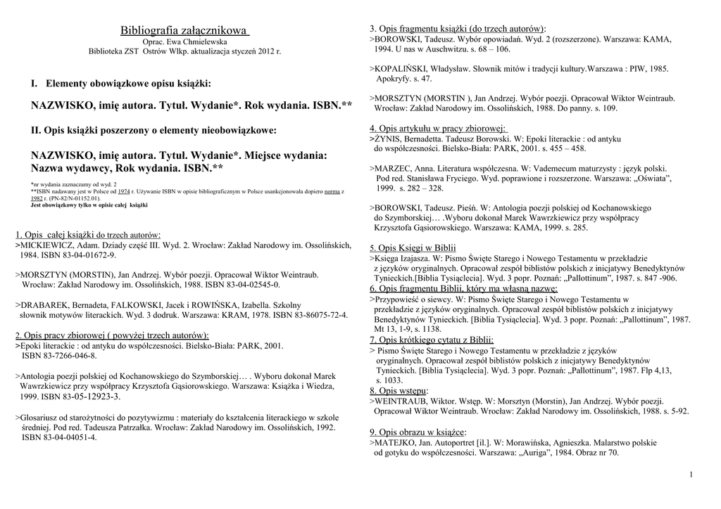 Bibliografia załącznikowa Oprac. Ewa Chmielewska Biblioteka ZST Ostrów Wlkp. aktualizacja styczeń 2012 r. I. Elementy obowiązkowe opisu książki: 3. Opis fragmentu książki (do trzech autorów): >BOROWSKI, Tadeusz. Wybór opowiadań. Wyd. 2 (rozszerzone). Warszawa: KAMA, 1994. U nas w Auschwitzu. s. 68 – 106. >KOPALIŃSKI, Władysław. Słownik mitów i tradycji kultury.Warszawa : PIW, 1985. Apokryfy. s. 47. NAZWISKO, imię autora. Tytuł. Wydanie*. Rok wydania. ISBN.** >MORSZTYN (MORSTIN ), Jan Andrzej. Wybór poezji. Opracował Wiktor Weintraub. Wrocław: Zakład Narodowy im. Ossolińskich, 1988. Do panny. s. 109. II. Opis książki poszerzony o elementy nieobowiązkowe: 4. Opis artykułu w pracy zbiorowej: NAZWISKO, imię autora. Tytuł. Wydanie*. Miejsce wydania: Nazwa wydawcy, Rok wydania. ISBN.** *nr wydania zaznaczamy od wyd. 2 **ISBN nadawany jest w Polsce od 1974 r. Używanie ISBN w opisie bibliograficznym w Polsce usankcjonowała dopiero norma z 1982 r. (PN-82/N-01152.01). Jest obowiązkowy tylko w opisie całej książki 1. Opis całej książki do trzech autorów: >MICKIEWICZ, Adam. Dziady część III. Wyd. 2. Wrocław: Zakład Narodowy im. Ossolińskich, 1984. ISBN 83-04-01672-9. >MORSZTYN (MORSTIN), Jan Andrzej. Wybór poezji. Opracował Wiktor Weintraub. Wrocław: Zakład Narodowy im. Ossolińskich, 1988. ISBN 83-04-02545-0. >DRABAREK, Bernadeta, FALKOWSKI, Jacek i ROWIŃSKA, Izabella. Szkolny słownik motywów literackich. Wyd. 3 dodruk. Warszawa: KRAM, 1978. ISBN 83-86075-72-4. >ŻYNIS, Bernadetta. Tadeusz Borowski. W: Epoki literackie : od antyku do współczesności. Bielsko-Biała: PARK, 2001. s. 455 – 458. >MARZEC, Anna. Literatura współczesna. W: Vademecum maturzysty : język polski. Pod red. Stanisława Fryciego. Wyd. poprawione i rozszerzone. Warszawa: „Oświata”, 1999. s. 282 – 328. >BOROWSKI, Tadeusz. Pieśń. W: Antologia poezji polskiej od Kochanowskiego do Szymborskiej… .Wyboru dokonał Marek Wawrzkiewicz przy współpracy Krzysztofa Gąsiorowskiego. Warszawa: KAMA, 1999. s. 285. 5. Opis Księgi w Biblii >Księga Izajasza. W: Pismo Święte Starego i Nowego Testamentu w przekładzie z języków oryginalnych. Opracował zespół biblistów polskich z inicjatywy Benedyktynów Tynieckich.[Biblia Tysiąclecia]. Wyd. 3 popr. Poznań: „Pallottinum”, 1987. s. 847 -906. 6. Opis fragmentu Biblii, który ma własną nazwę: >Przypowieść o siewcy. W: Pismo Święte Starego i Nowego Testamentu w przekładzie z języków oryginalnych. Opracował zespół biblistów polskich z inicjatywy Benedyktynów Tynieckich. [Biblia Tysiąclecia]. Wyd. 3 popr. Poznań: „Pallottinum”, 1987. Mt 13, 1-9, s. 1138. 2. Opis pracy zbiorowej ( powyżej trzech autorów): >Epoki literackie : od antyku do współczesności. Bielsko-Biała: PARK, 2001. ISBN 83-7266-046-8. 7. Opis krótkiego cytatu z Biblii: > Pismo Święte Starego i Nowego Testamentu w przekładzie z języków >Antologia poezji polskiej od Kochanowskiego do Szymborskiej… . Wyboru dokonał Marek Wawrzkiewicz przy współpracy Krzysztofa Gąsiorowskiego. Warszawa: Książka i Wiedza, 1999. ISBN 83-05-12923-3. 8. Opis wstępu: >Glosariusz od starożytności do pozytywizmu : materiały do kształcenia literackiego w szkole średniej. Pod red. Tadeusza Patrzałka. Wrocław: Zakład Narodowy im. Ossolińskich, 1992. ISBN 83-04-04051-4. oryginalnych. Opracował zespół biblistów polskich z inicjatywy Benedyktynów Tynieckich. [Biblia Tysiąclecia]. Wyd. 3 popr. Poznań: „Pallottinum”, 1987. Flp 4,13, s. 1033. >WEINTRAUB, Wiktor. Wstęp. W: Morsztyn (Morstin), Jan Andrzej. Wybór poezji. Opracował Wiktor Weintraub. Wrocław: Zakład Narodowy im. Ossolińskich, 1988. s. 5-92. 9. Opis obrazu w książce: >MATEJKO, Jan. Autoportret [il.]. W: Morawińska, Agnieszka. Malarstwo polskie od gotyku do współczesności. Warszawa: „Auriga”, 1984. Obraz nr 70. 1 III. Elementy obowiązkowe opisu artykułu w czasopiśmie: NAZWISKO, imię autora. Tytuł artykułu. „Tytuł czasopisma” rok nr czasopisma nr strony. 1. Opis artykułu: >MACIAK, Magdalena. Przedśpiew. „Cogito” 2006 nr 19 s. 50-51. 2. Opis obrazu w czasopiśmie: >MALCZEWSKI, Jacek. Święty Franciszek [il.]. „Cogito” 2006 nr 19 s. 51. Dokumenty elektroniczne: I. E-książka całość i fragment: elementy obowiązkowe opisu: Nazwisko, imię autora Tytuł Typ nośnika [online], [CD-ROM], [taśma magnetyczna], [dyskietka] Wydanie (Wersja …). Miejsce wydania Wydawca Data wydania Data dostępu dokumentów online Data aktualizacji Warunki dostępu dokumentów online Numer ISBN NAZWISKO, imię autora. Tytuł. Typ nośnika. Wydanie/ wersja. Miejsce wydania: Wydawca, rok wydania [Data dostępu]. Data aktualizacji. Warunki dostępu. ISBN. 1. Opis całości e-książki: KOPALIŃSKI, Władysław. Słownik wyrazów obcych i zwrotów obcojęzycznych [CD-ROM]. Wersja 1.03.16. Łódź: Pro-media CD, 1998. Aktualizowane w dniu 25.11.1998. ISBN 83-7231-731-3. KOPERNIK, Mikołaj. De revolutionibus [online]. Kraków : Neurosoff, cop. 1996 [dostęp 7 pażdziernika 2004]. Dostępny Word Wide Web: http://www.bj.uj.edu.pl/bjmanus/manus_p.html. 2. Fragment e-książki Wiosna Ludów (1848 – 1849). W: Wielka Internetowa Encyklopedia Multimedialna [online]. 2004 [dostęp 12 marca 2004]. Dostępny Word Wide Web: http://wiem.onet.pl/wiem/001c1c.html. II. E-gazeta i e-czasopismo: e - artykuł - elementy obowiązkowe opisu: Nazwisko, imię autora Tytuł artykułu Tytuł czasopisma lub gazety Typ nośnika [online], [CD-ROM], [taśma magnetyczna], [dyskietka] Wydanie Oznaczenie zeszytu Data aktualizacji Data dostępu Lokalizacja w obrębie dokumentu macierzystego (strony) Warunki dostępu Numer ISSN NAZWISKO, imię autora. Tytuł artykułu. W: „Tytuł czasopisma lub gazety” [Typ nośnika]. Data wydania nr [Data dostępu]. Lokalizacja w obrębie dokumentu macierzystego. Warunki dostępu. ISSN. Artykuł w gazecie online: MARZEC, Bartosz. Słowom przywracał bla