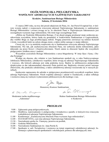 OGÓLNOPOLSKA PIELGRZYMKA WSPÓLNOT ADORUJĄCYCH NAJŚWIĘTSZY SAKRAMENT Kraków, Sanktuarium Bożego Miłosierdzia Sobota, 23 kwietnia 2016 31 marca 2005 roku, na trzy dni przed odejściem do Pana, św. Jan Paweł II napisał list, w którym wyraża radość z rozpoczęcia wieczystej adoracji Najświętszego Sakramentu w sanktuarium Bożego Miłosierdzia i zwraca uwagę na to, że obecność Pana w Najświętszym Sakramencie jest szczególnym wyrazem Jego miłosierdzia. Oto treść tego szczególnego listu: „Zbliża się Niedziela Miłosierdzia Bożego. Z tej okazji pragnę przekazać moje serdeczne pozdrowienia wszystkim, którzy będą się gromadzić w krakowskim Sanktuarium w Łagiewnikach, aby wielbić Boga za Jego przebaczającą miłość. Pragnę ponownie zawierzyć tej miłości Kościół i świat, wszystkich ludzi na całym okręgu ziemi, a także siebie samego w mojej słabości. Cieszę się, że w tę niedzielę rozpocznie się w Sanktuarium wieczysta adoracja Najświętszego Sakramentu. Nic tak, jak eucharystyczna obecność Pana, nie uobecnia dzieła miłosierdzia, jakie dokonało się przez Krzyż i Zmartwychwstanie. Niech zatem ta obecność będzie dla wszystkich pielgrzymów źródłem mocy i nadziei. Wszystkim czcicielom Bożego Miłosierdzia z serca błogosławię: W imię Ojca i Syna, i Ducha Świętego”. Wydaje się słuszne, aby właśnie w tym Sanktuarium spotkali się, w roku Nadzwyczajnego Jubileuszu Miłosierdzia, członkowie wspólnot, które trwają na adoracji Najświętszego Sakramentu i wszyscy, dla których adoracja jest stałą praktyką życia. Będzie to jubileuszowa pielgrzymka dziękczynna za dar sakramentalnej obecności Pana pośród nas. Będziemy również prosić naszego Zbawiciela, aby praktyka całodziennej, a także całodobowej adoracji rozszerzała się w naszych parafiach. Serdecznie zapraszamy do udziału w pielgrzymce przedstawicieli wszystkich wspólnot, które adorują Najświętszy Sakrament. Niech wspólna adoracja i udział w Eucharystii, a także refleksja i rozmowa staną się ważnym wydarzeniem jubileuszowym dla każdego z nas. Honorowy Kustosz Sanktuarium Moderator ruchu modlitewnego „Adoremus” Rektor Sanktuarium Bożego Miłosierdzia w Krakowie PROGRAM 9.00 – Zgłaszanie grup pielgrzymkowych, 10.00 – Modlitwa, wprowadzenie w pielgrzymkę i świadectwa z parafii, w których trwa wieczysta (całodobowa) adoracja Najświętszego Sakramentu, 11.00 – Konferencja: „Eucharystyczna obecność Pana wyrazem Jego miłosierdzia”, 12.00 – EUCHARYSTIA, a po niej adoracja Najświętszego Sakramentu, 13.30 – Nawiedzenie grobu św. Faustyny, przerwa na posiłek, 15.00 – Godzina Miłosierdzia, 16.00 – Nawiedzenie Sanktuarium św. Jana Pawła II, 17.00 – Spotkanie w sali: Świadectwa i rozmowa na temat organizacji całodobowej adoracji; Informacje o planowanych spotkaniach i rekolekcjach; pomoce dla adorujących; inne.