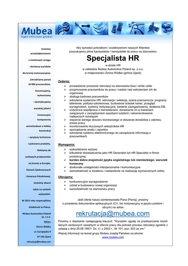 Aby sprostać potrzebom i oczekiwaniom naszych Klientów poszukujemy pilnie kandydatów / kandydatek do pracy na stanowisku Jesteśmy przedsiębiorstwem Specjalista HR o światowym zasięgu w dziale HR w zakładzie Mubea Automotive Poland sp. z o.o. w miejscowości Zimna Wódka (gmina Ujazd) - dostawcą wyrobów dla branży motoryzacyjnej. Zatrudniamy ponad 10 000 pracowników. Konstruujemy, wytwarzamy i dystrybuujemy wysokiej jakości Zadania: innowacyjne komponenty samochodowe o lekkiej konstrukcji – sprężyny techniczne i pokrewne produkty. Należymy do prowadzenie procesów rekrutacji na stanowiska blue i white collar przyjmowanie pracowników do pracy i nadzór nad wdrożeniem ich do organizacji obsługa kadrowa pracowników wdrożenie systemów HR: rekrutacja i selekcja, ocena pracownicza, programy talentowe, polityka szkoleniowa, budowanie ścieżek karier, przegląd wynagrodzeń, systemy motywacyjne, badanie zaangażowania, działania EB, codzienna współpraca z menedżerami, doradzanie im w kwestiach związanych z zarządzaniem zasobami ludzkimi i rekomendowanie najlepszych rozwiązań wsparcie danego obszaru biznesowego w obszarze doradztwa z zakresu prawa pracy monitorowanie kluczowych wskaźników HR sporządzanie analiz i raportów wdrożenie systemu elektronicznego do zarządzania informacją o pracownikach Wymagania: czołowych producentów tej branży w Europie, wykształcenie wyższe, kilkuletnie doświadczenie jako HR Generalist lub HR Specialist w firmie produkcyjnej, bardzo dobra znajomość języka angielskiego lub niemieckiego- warunek konieczny doskonałe umiejętności interpersonalne i komunikacyjne samodzielność w działaniu i nastawienie na realizację wyznaczonych celów Stanach Zjednoczonych i Ameryce Południowej. Oferujemy: Jesteśmy obecni także na rynkach konkurencyjne wynagrodzenie udział w budowaniu nowej organizacji samodzielność na stanowisku pracy azjatyckich. W 2015 roku rozpoczęliśmy działalność w Polsce. Mubea Automotive Poland sp. z o.o. Adres: Zimna Wódka ul. Europejska 9 47-143 Ujazd [email protected] Jeśli oferta nasza zainteresowała Pana (Panią), prosimy o przesłanie dokumentów aplikacyjnych (CV, list motywacyjny w języku polskim i obcym) na adres [email protected] Prosimy o dopisanie następującej klauzuli: "Wyrażam zgodę na przetwarzanie moich danych osobowych zawartych w ofercie pracy dla potrzeb procesu rekrutacji zgodnie z ustawą z dnia 29.08.1997r. Dz. U. z 2002 r., Nr 101, poz. 923 ze zm." Więcej informacji na temat grupy Mubea znajdą Państwo na stronie www.mubea.com